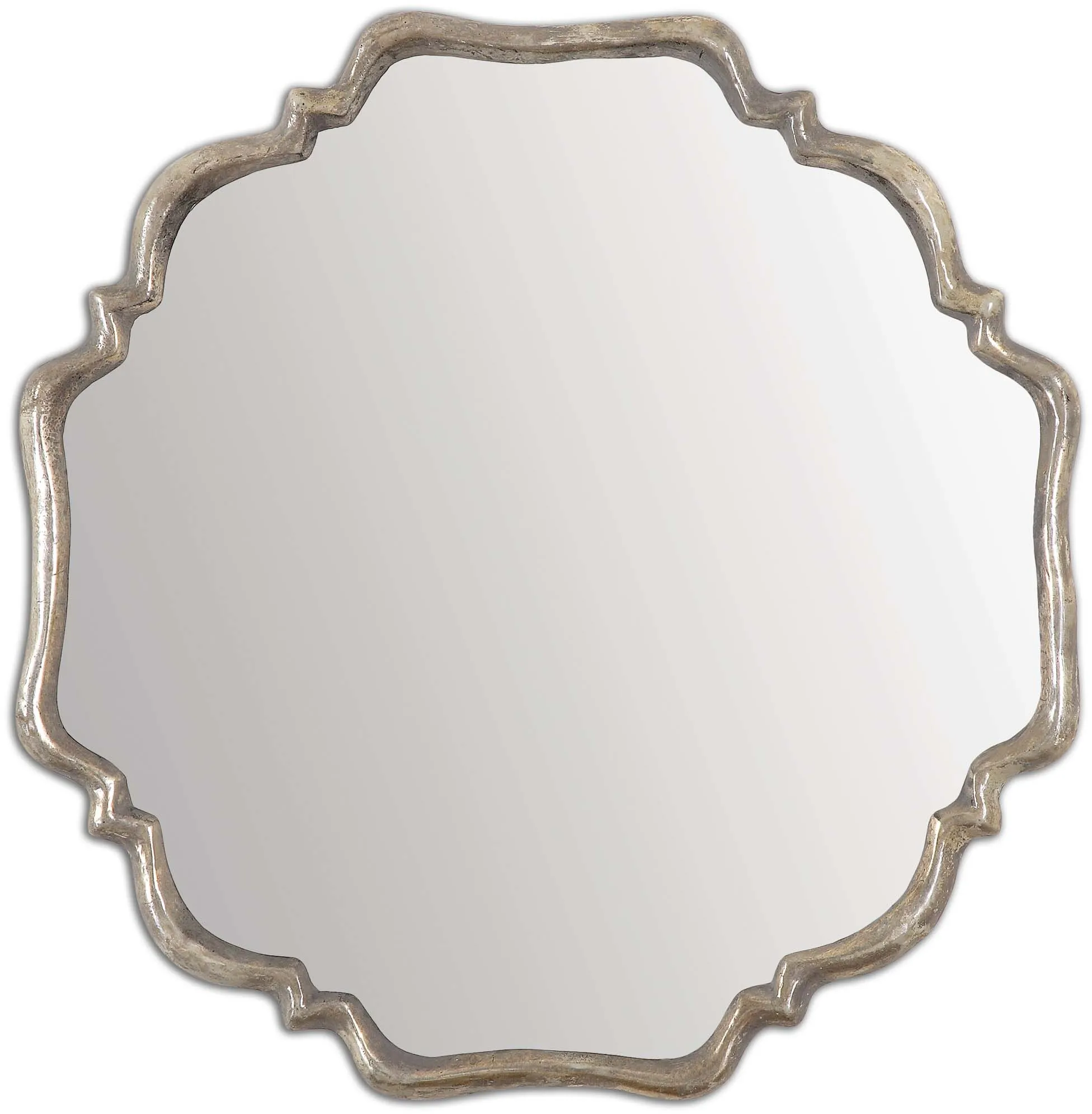 This Shapely Mirror Features A Frame With A Plated, Oxidized Silver Finish And A Rust Gray Wash.