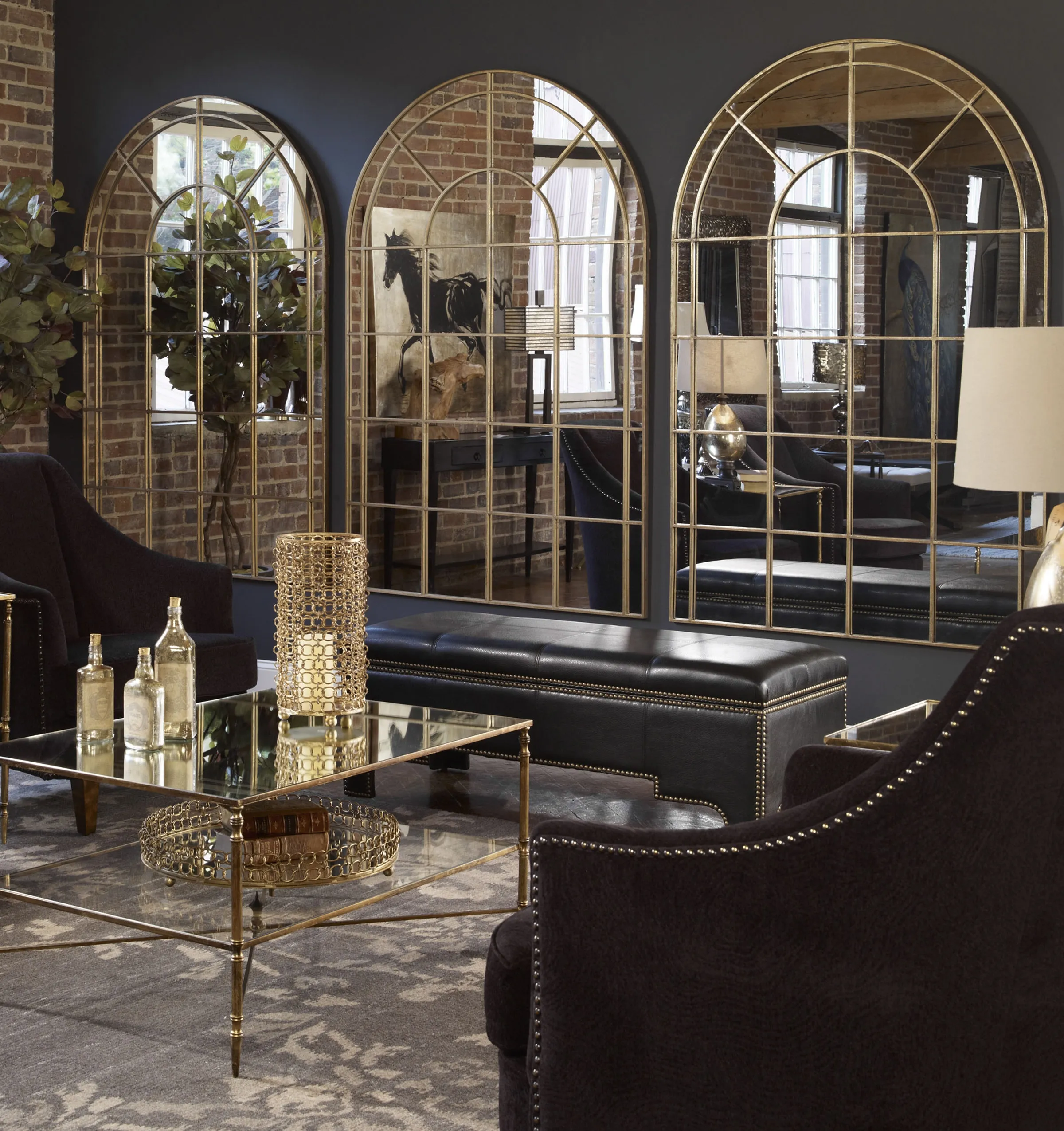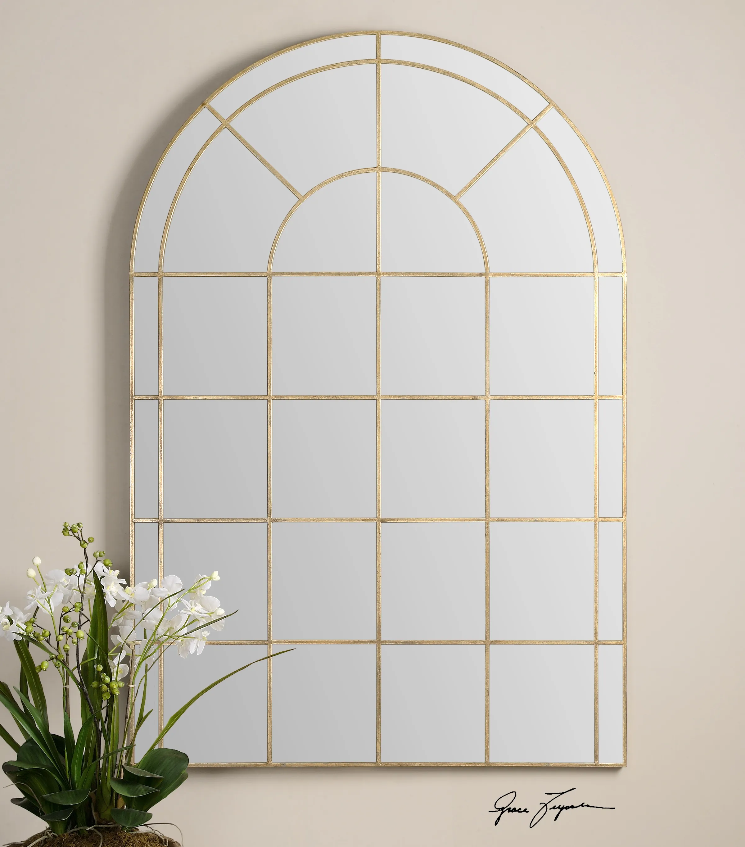 A transitional take on a classic design, this arch mirror features a delicate iron frame finished in a warm antiqued gold leaf.
