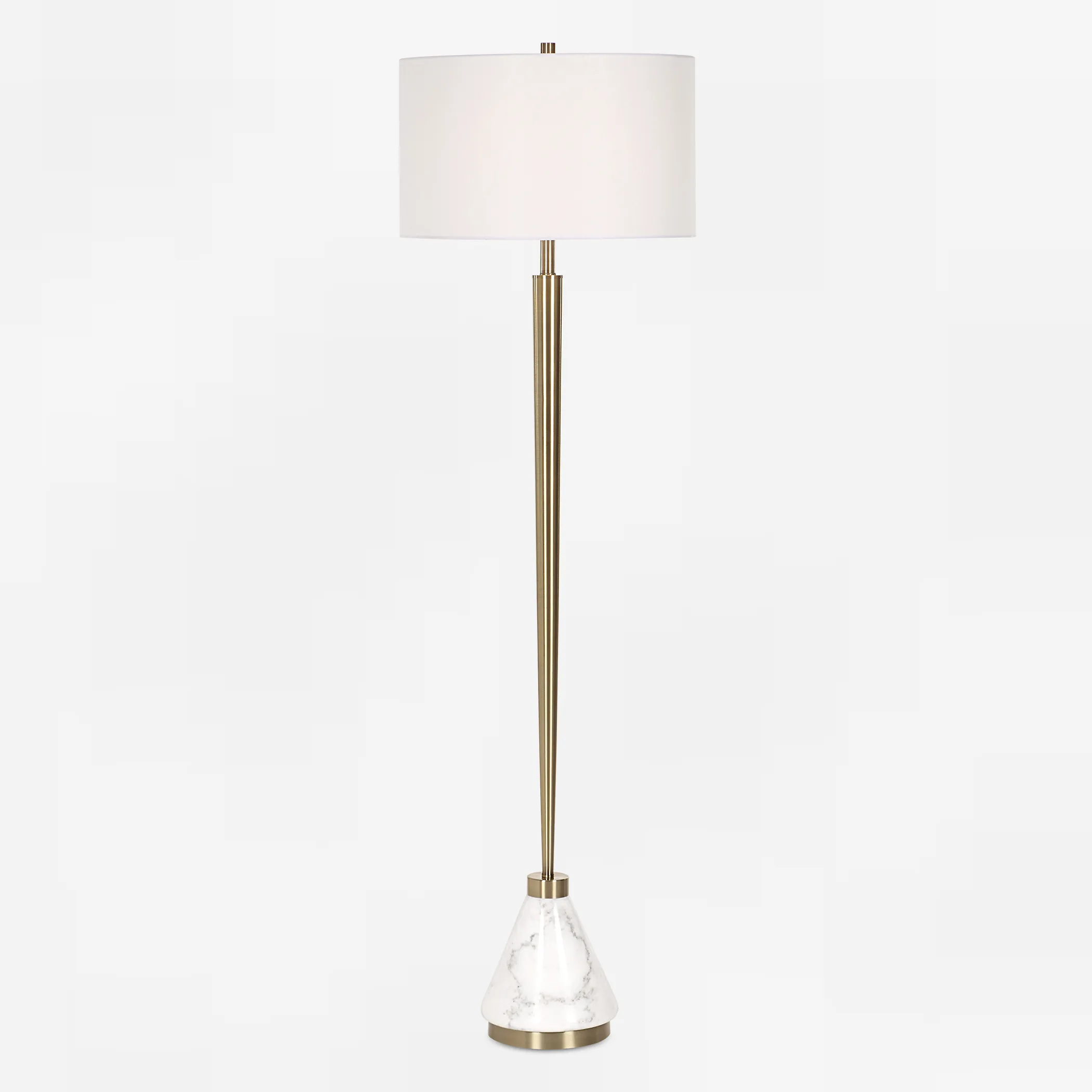 The Curran Floor Lamp Features A Delicately Tapered Metal Body Finished In A Plated Brass And Paired With A Thick White Marble Foot. The Round Hardback Drum Shade Is Covered In A Crisp White Linen Fabric.