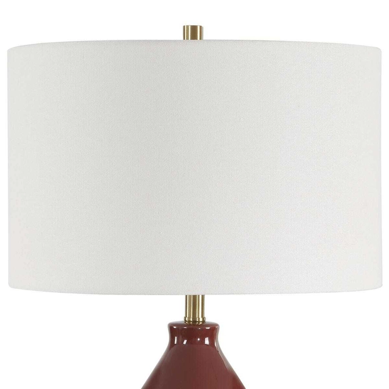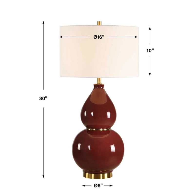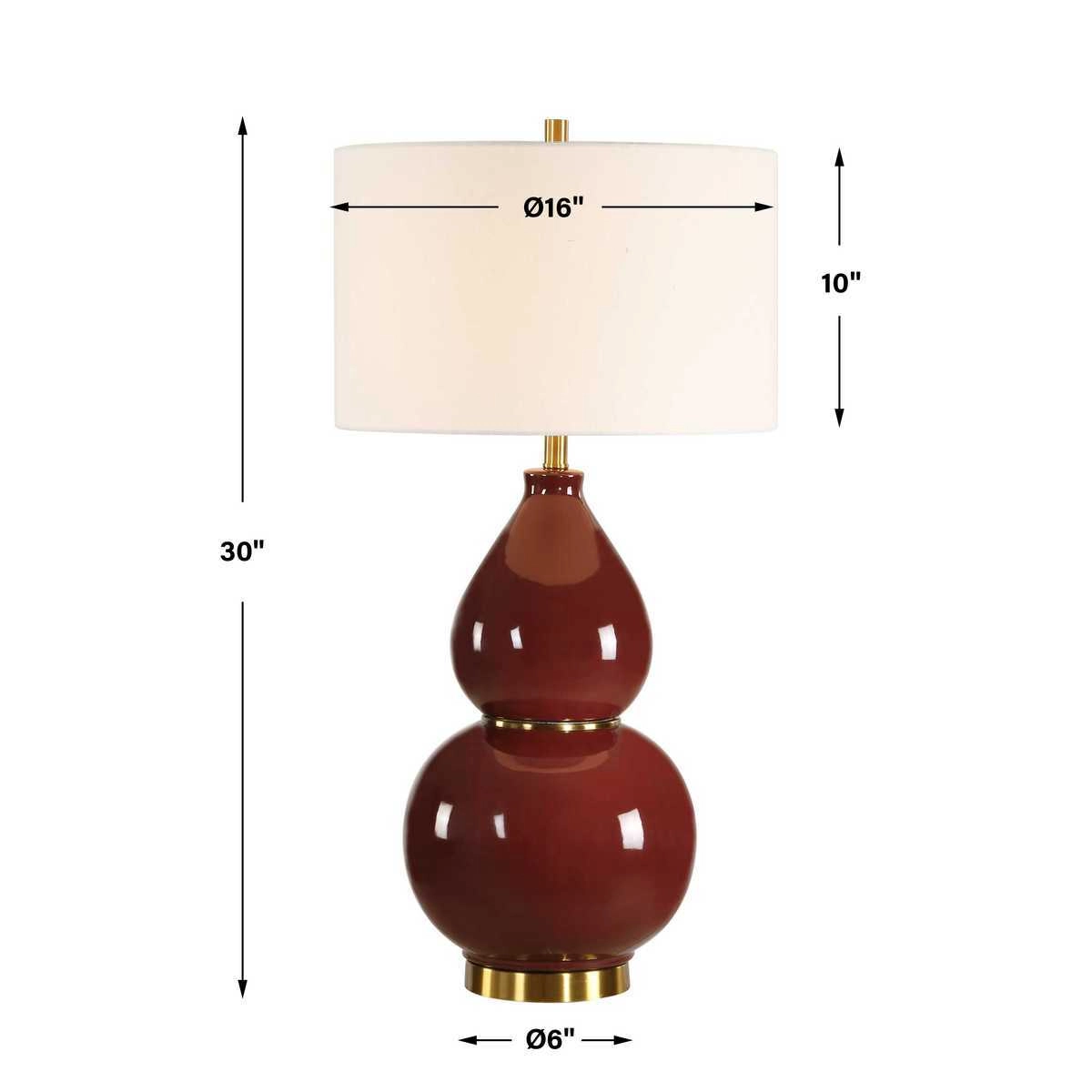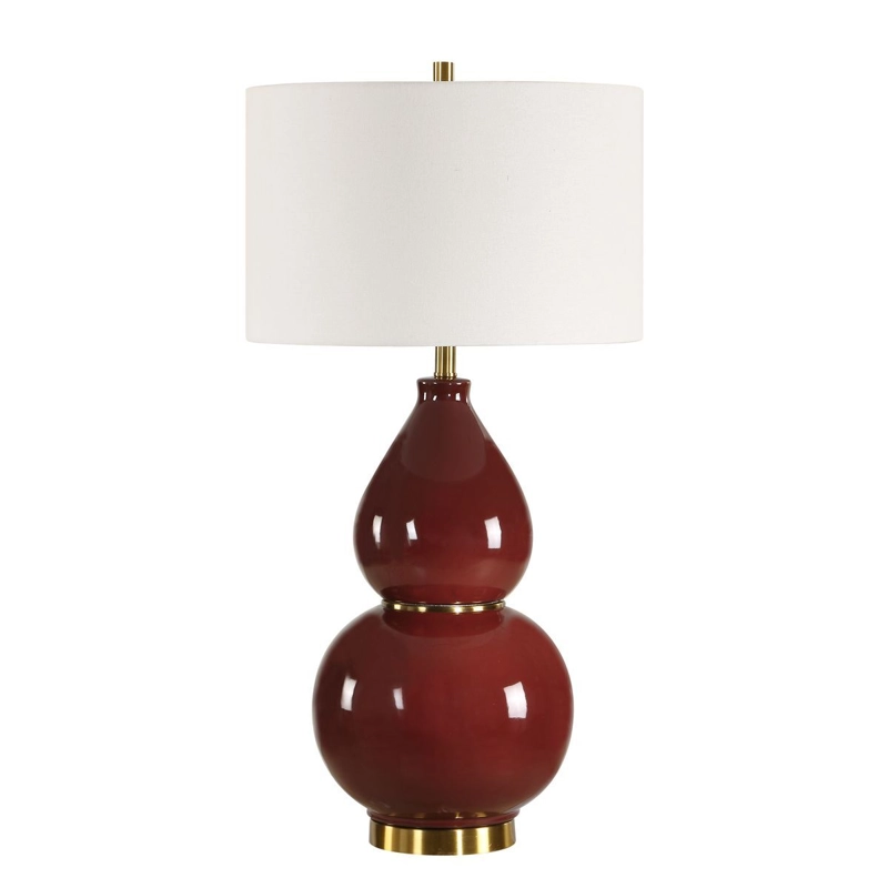 This timeless gourd shaped ceramic base is finished in a deep burgundy glaze accented with lightly antiqued brass plated details. The round drum shade is made of white linen fabric. Due to the nature of fired glazes on ceramic lamps, finishes will vary slightly.