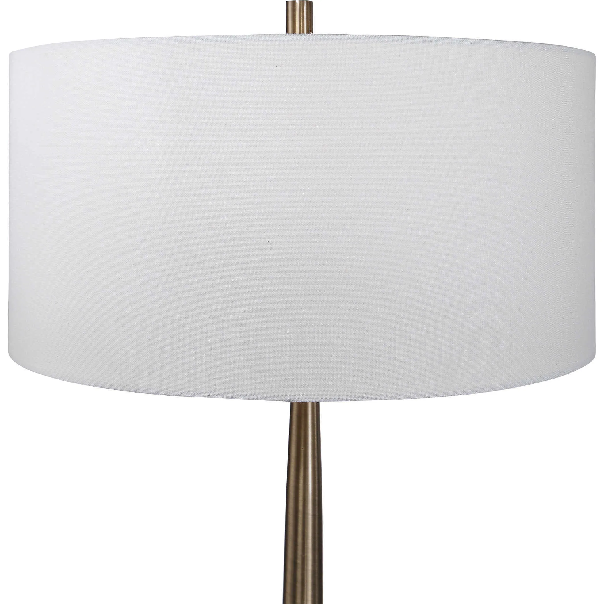 Transitional in design, this floor lamp has a tapered base finished in a plated antique brass, accented with a polished white marble detail. The piece has a white linen hardback drum shade.