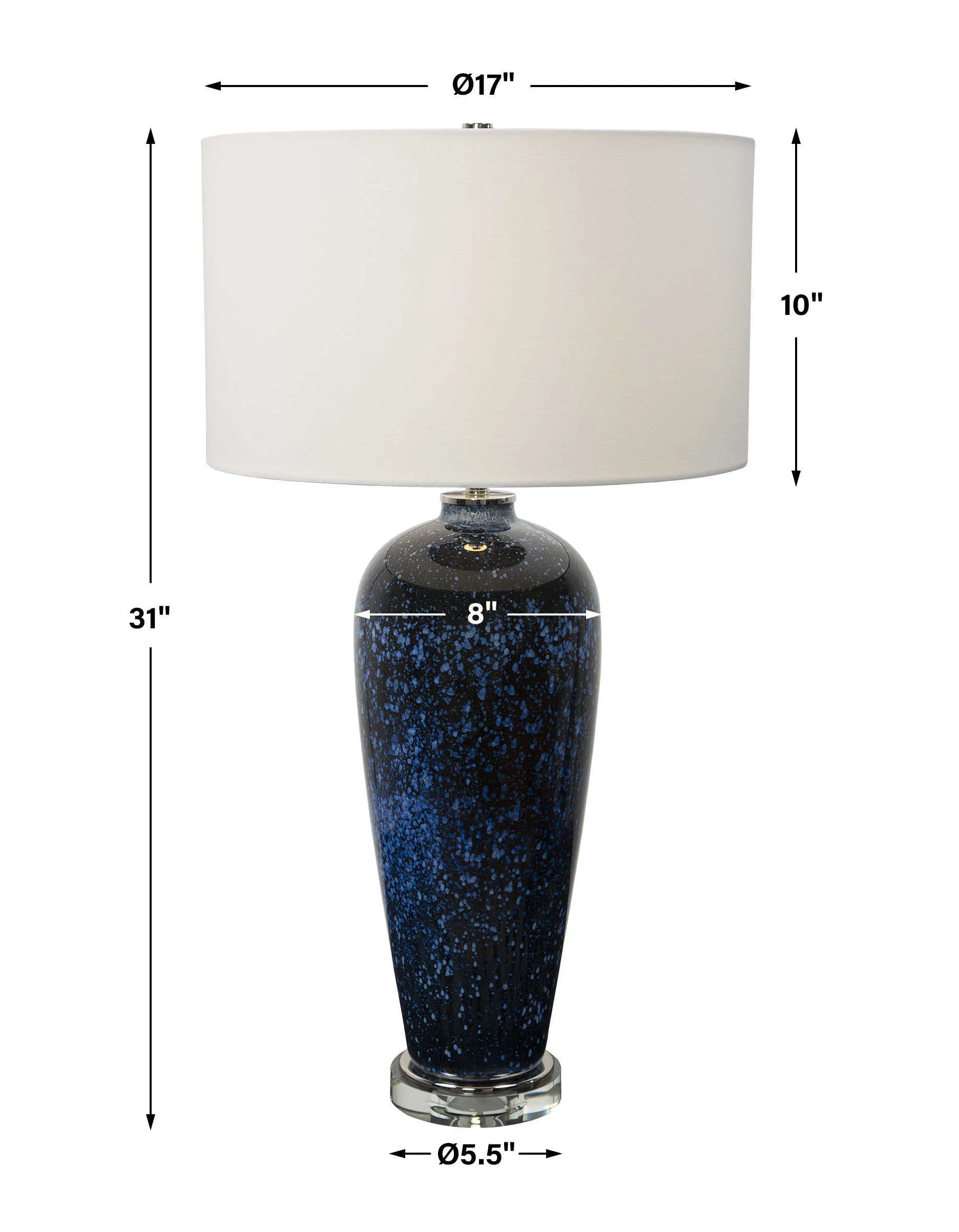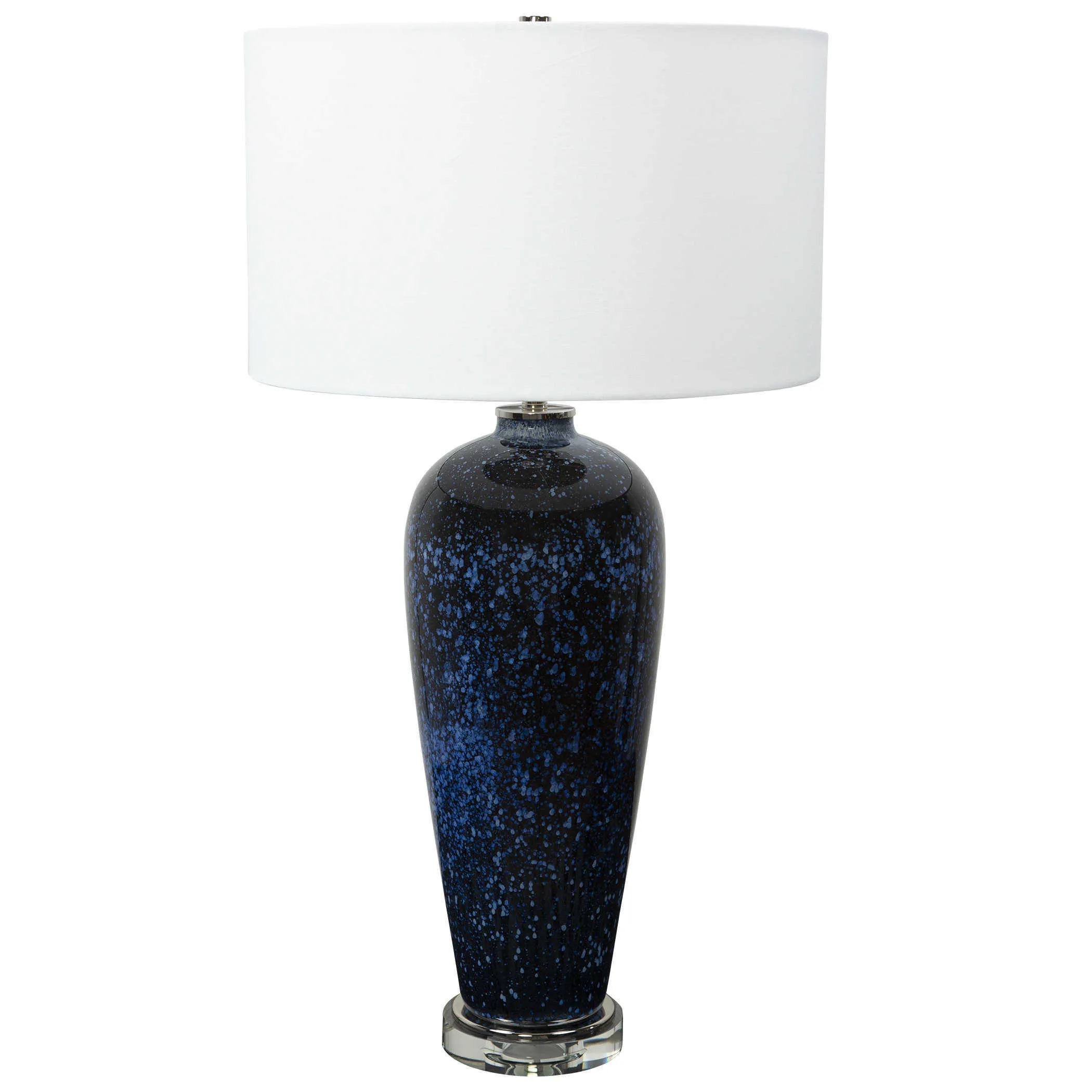 Reminiscent of the evening sky, this beautiful table lamp features an art glass base with shades of navy, cobalt and white accented by an elegant crystal foot and polished nickel plated details. A crisp white hardback drum shade completes the look.