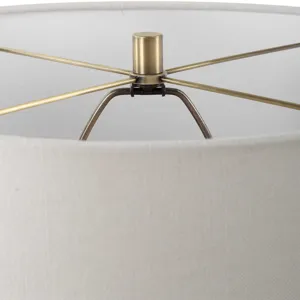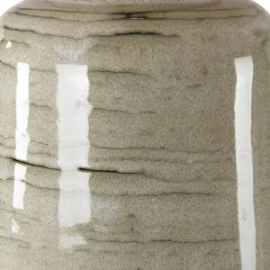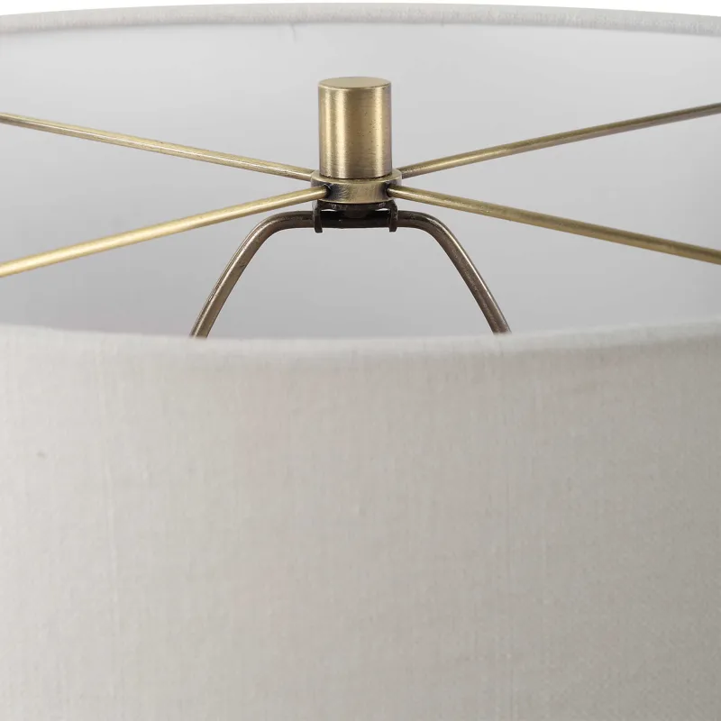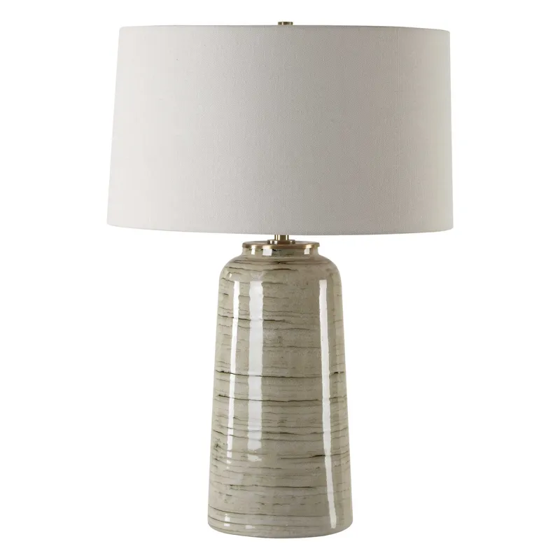 This ceramic table lamp features a greenish tan glaze with dark undertones, accented with plated antique brass details. The round hardback shade is covered in a white linen fabric with slubbing. Due to the nature of fired glazes on ceramic lamps, finishes will vary slightly.