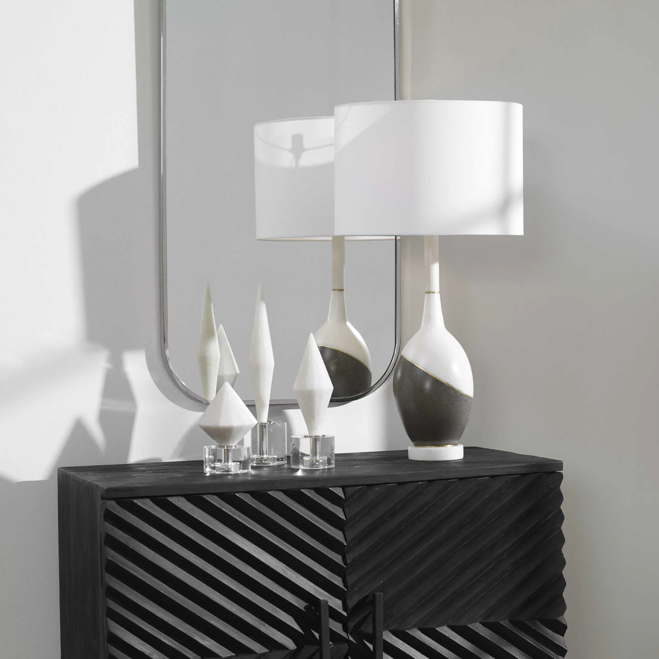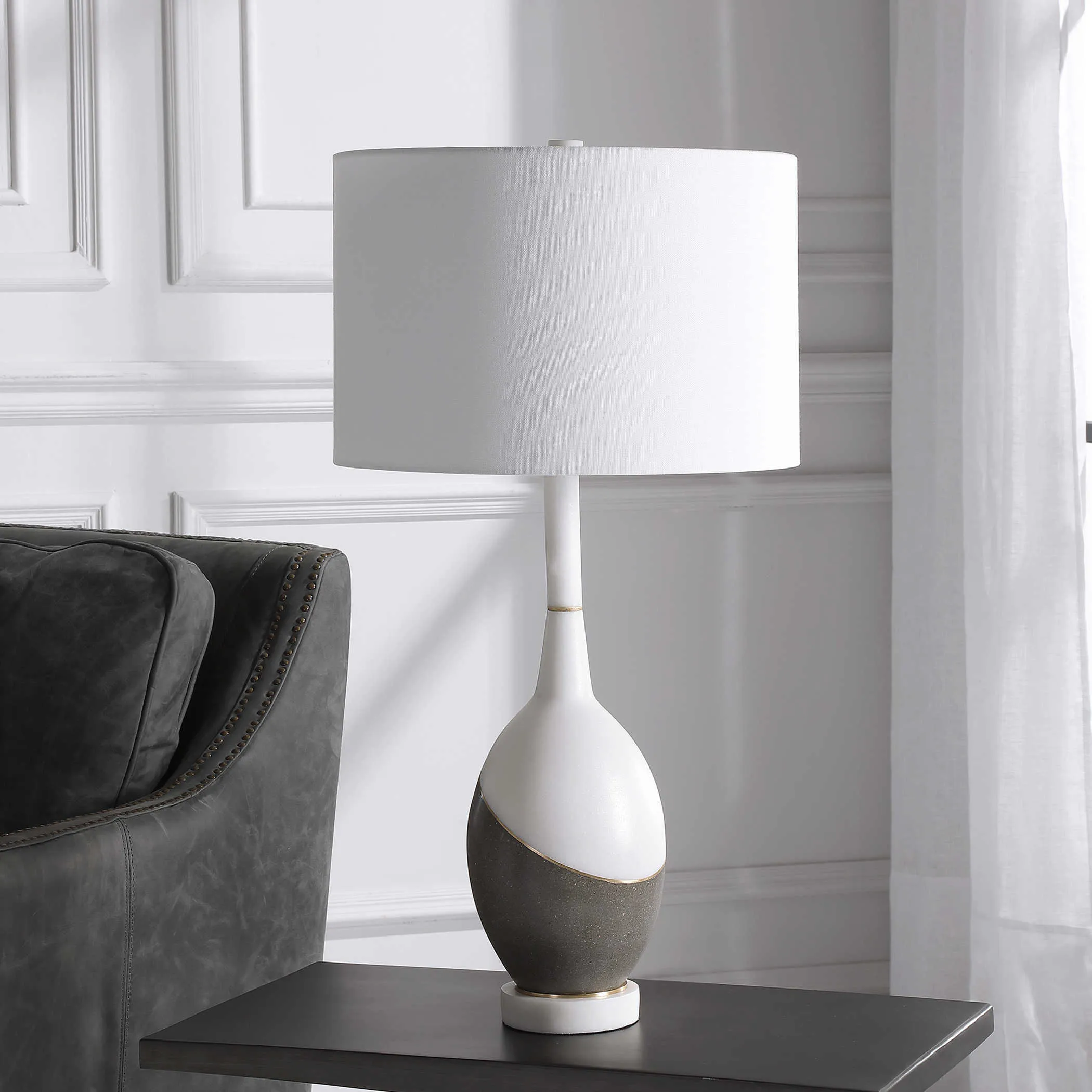 Simple yet sophisticated, this table lamp features a combination of honed charcoal concrete and a polished white marble look, accented by brushed gold plated accents. The lamp is complemented by a crisp white hardback drum shade.