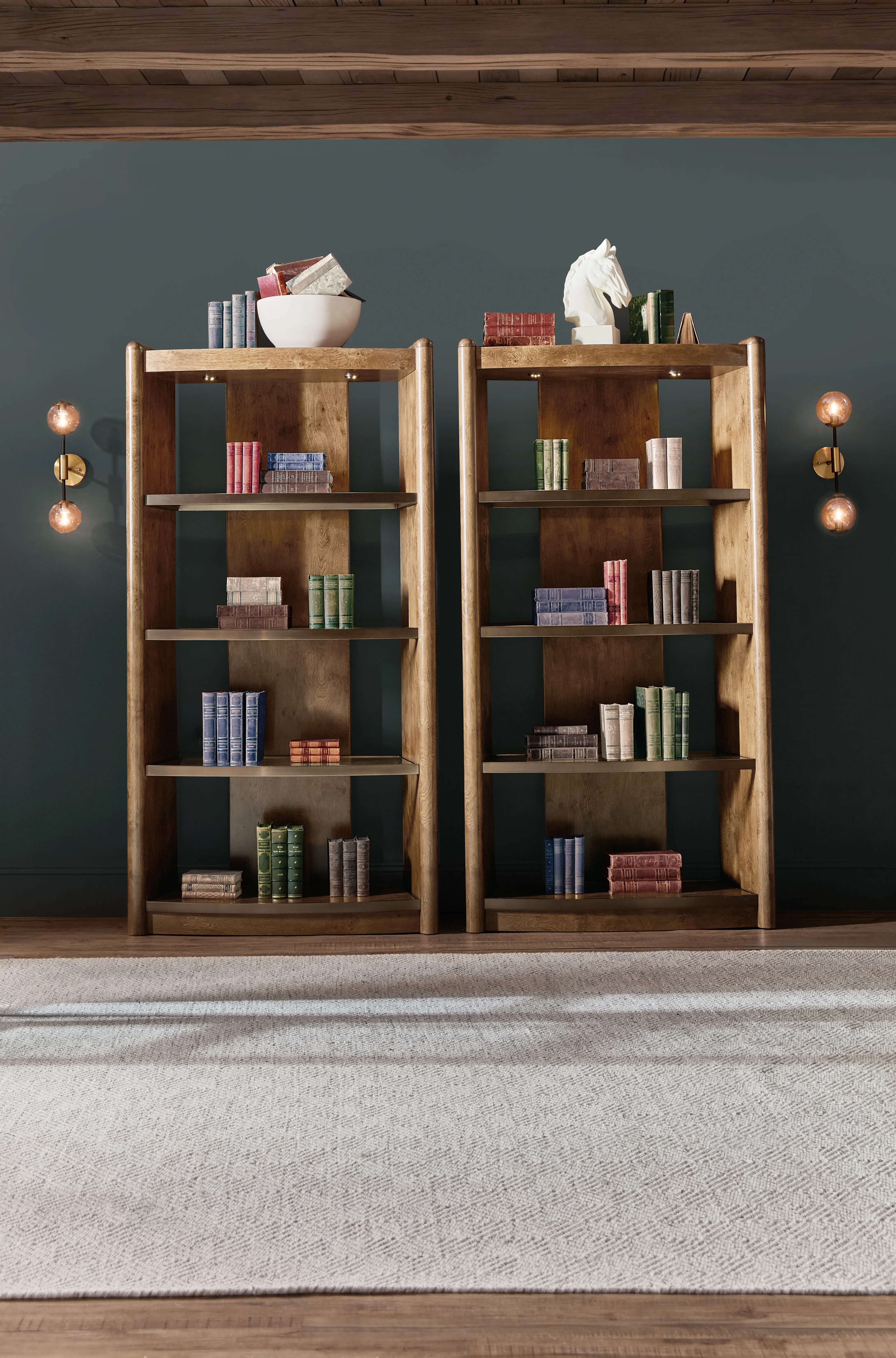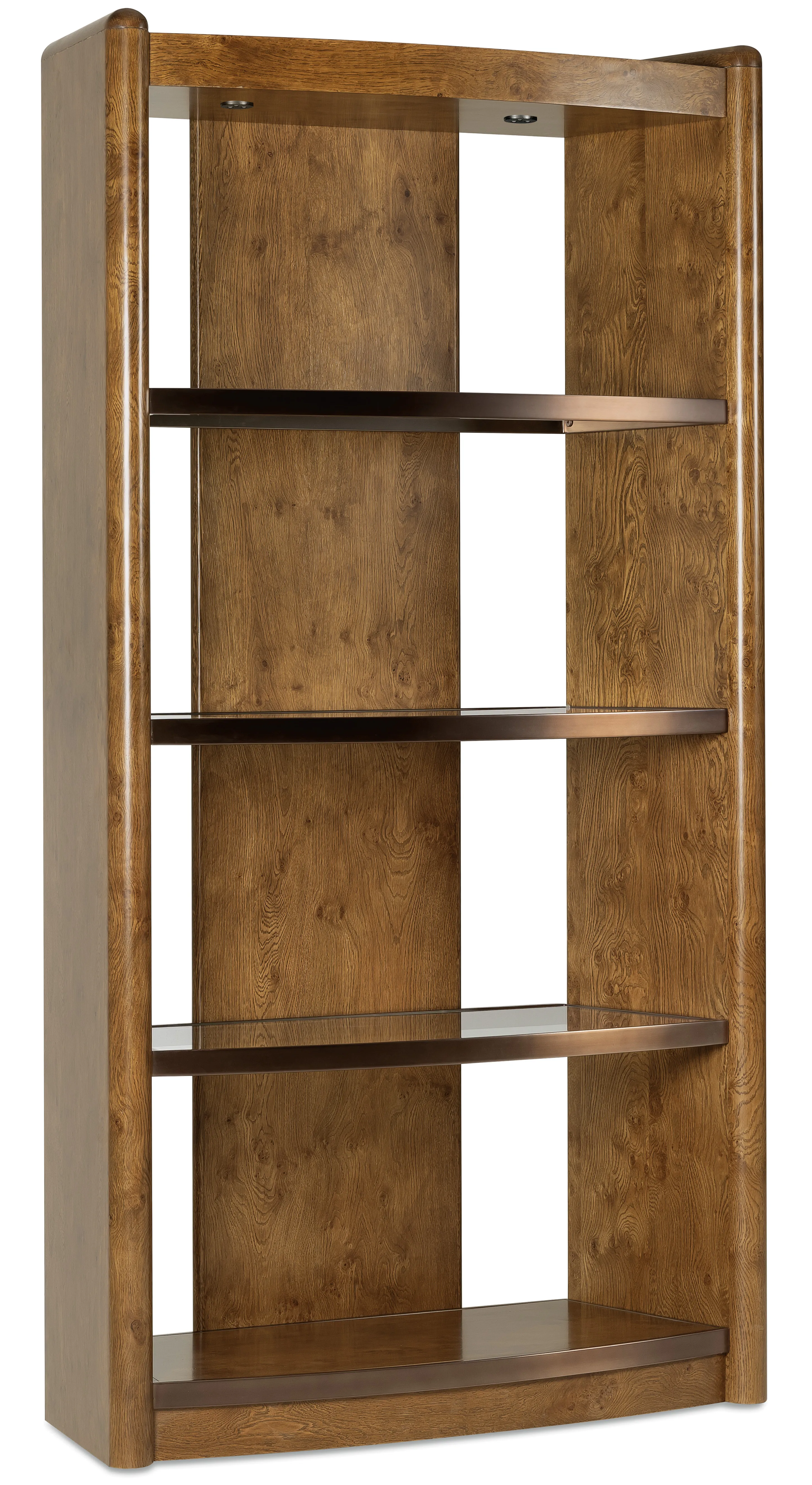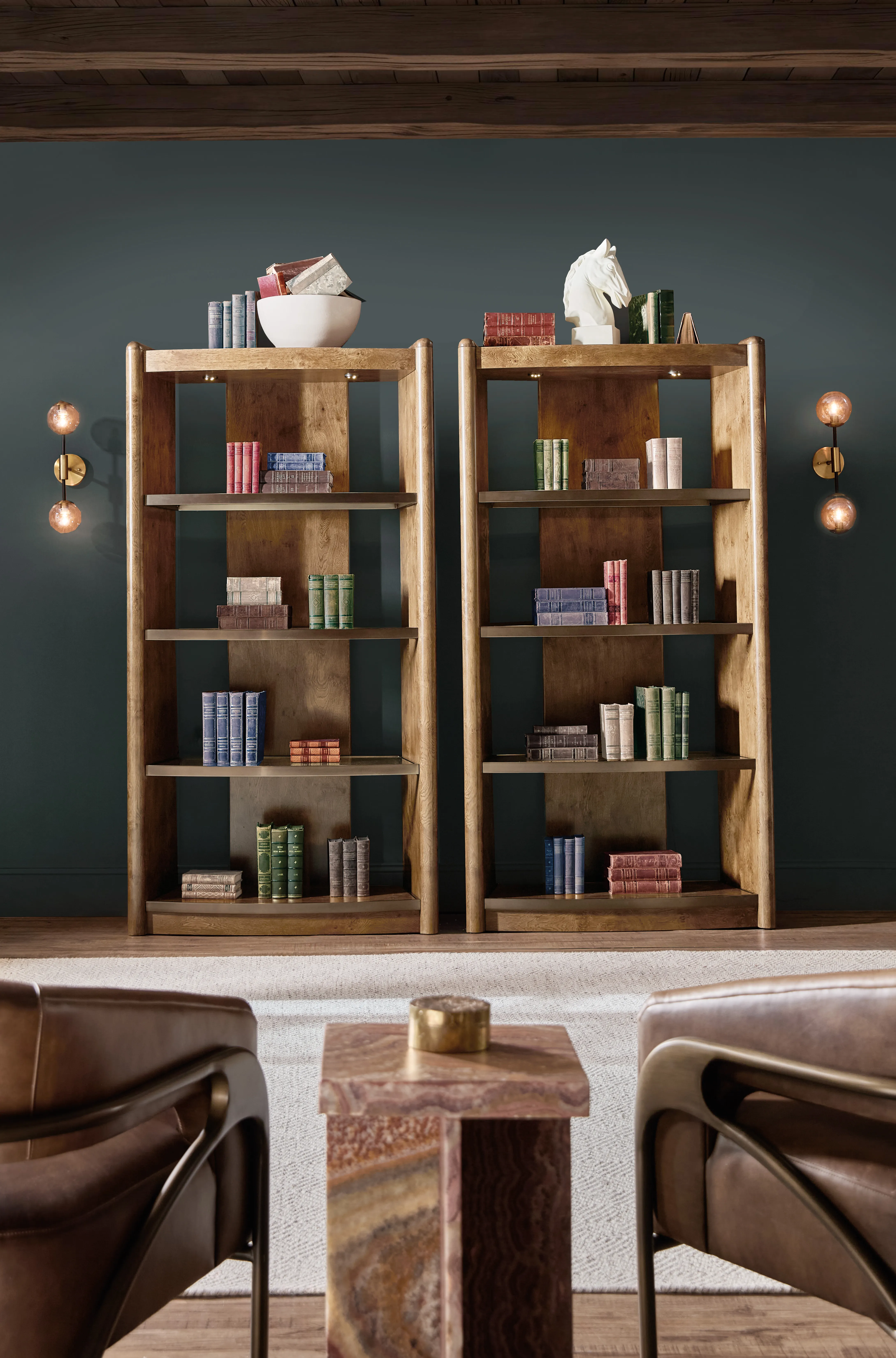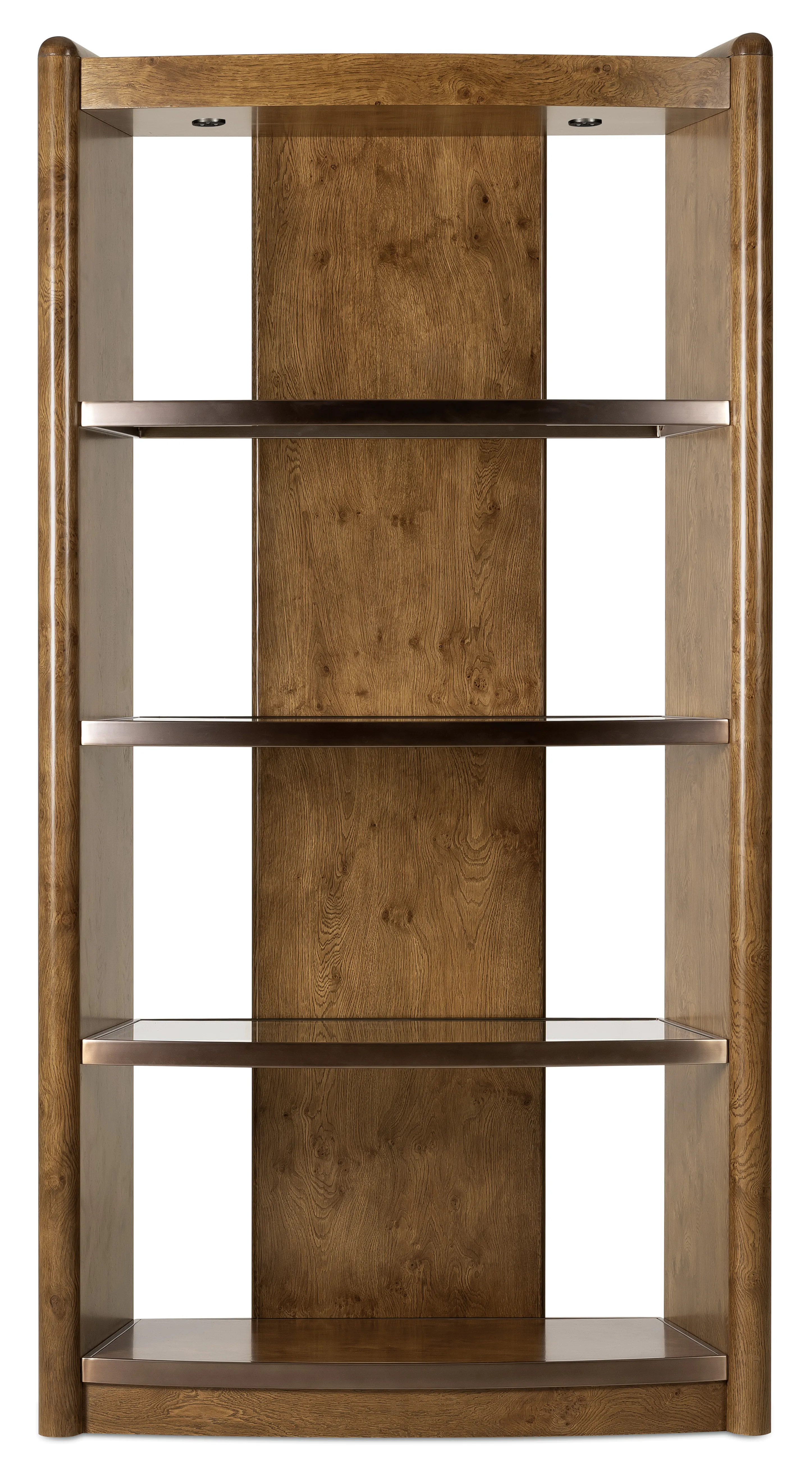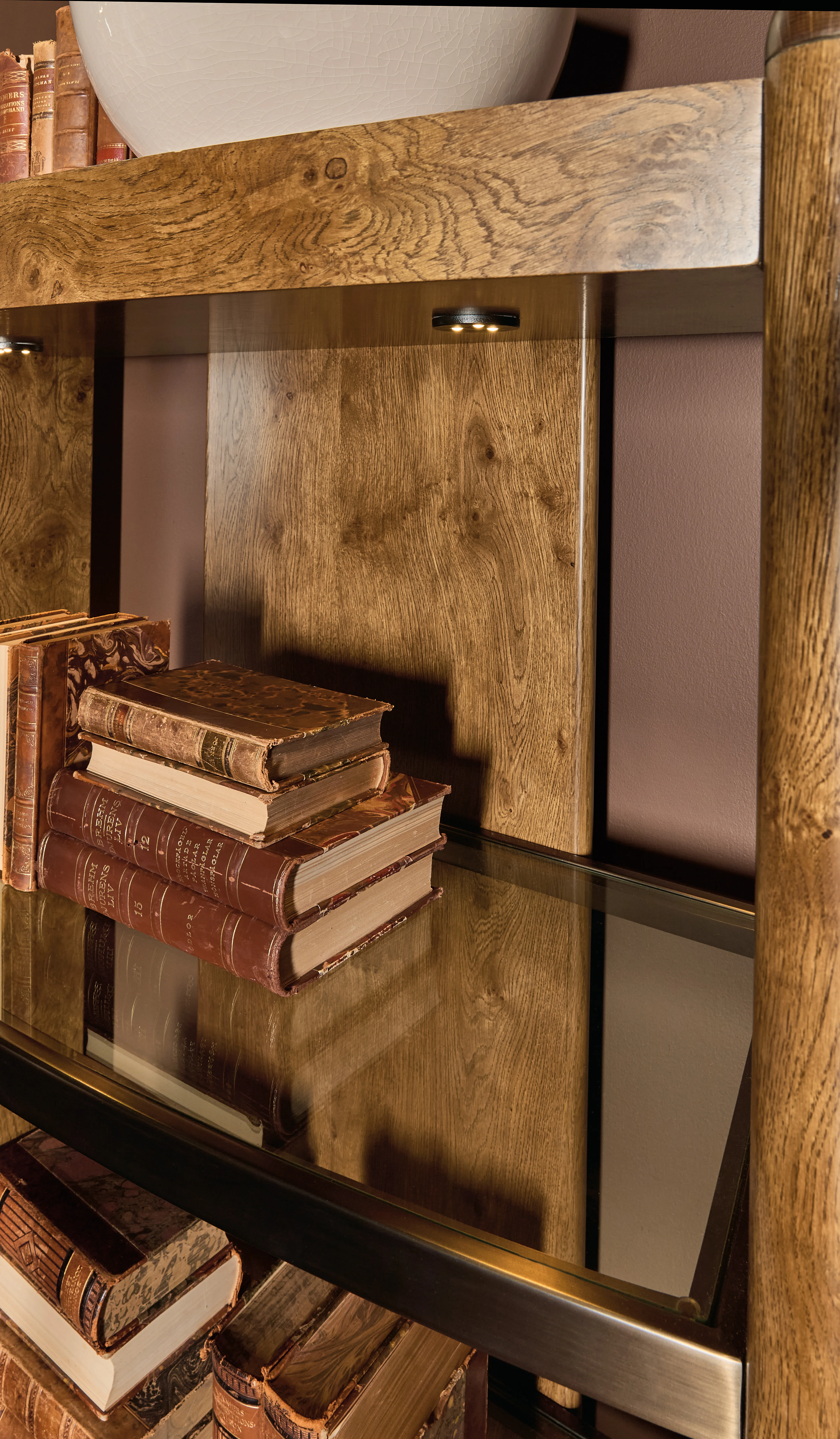 Showcase decor in elevated style with the Romano Etagere, a statement oak and metal etagere bookcase designed for transitional interiors. Three fixed, metal-framed glass shelves and an open-air back create an airy display, while touch-operated LED lighting highlights your curated objects. Finished in warm golden brown oak with bronze accents, it’s an ideal luxury display shelving unit for living rooms or offices.