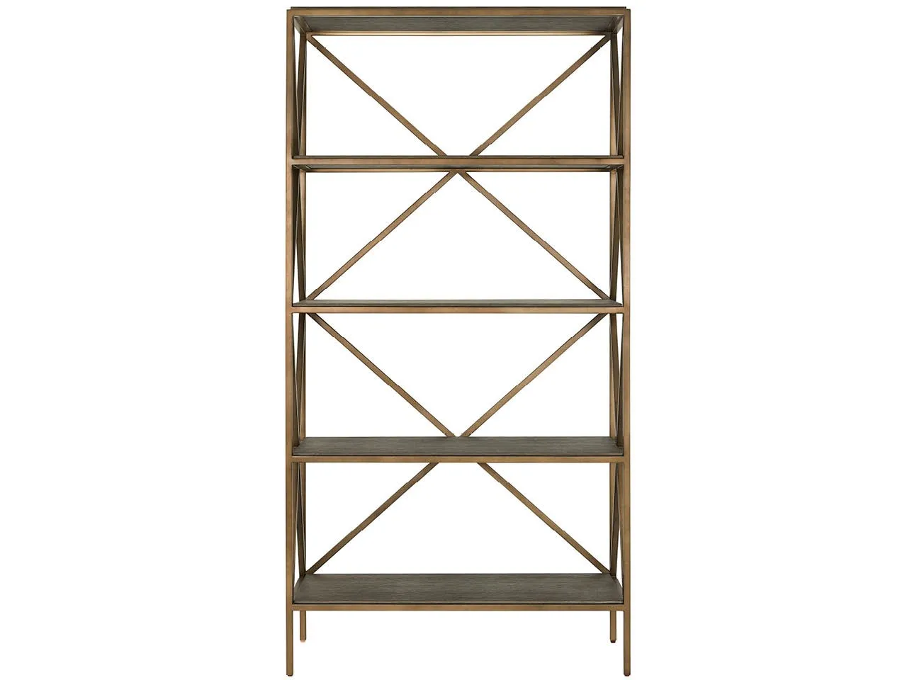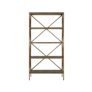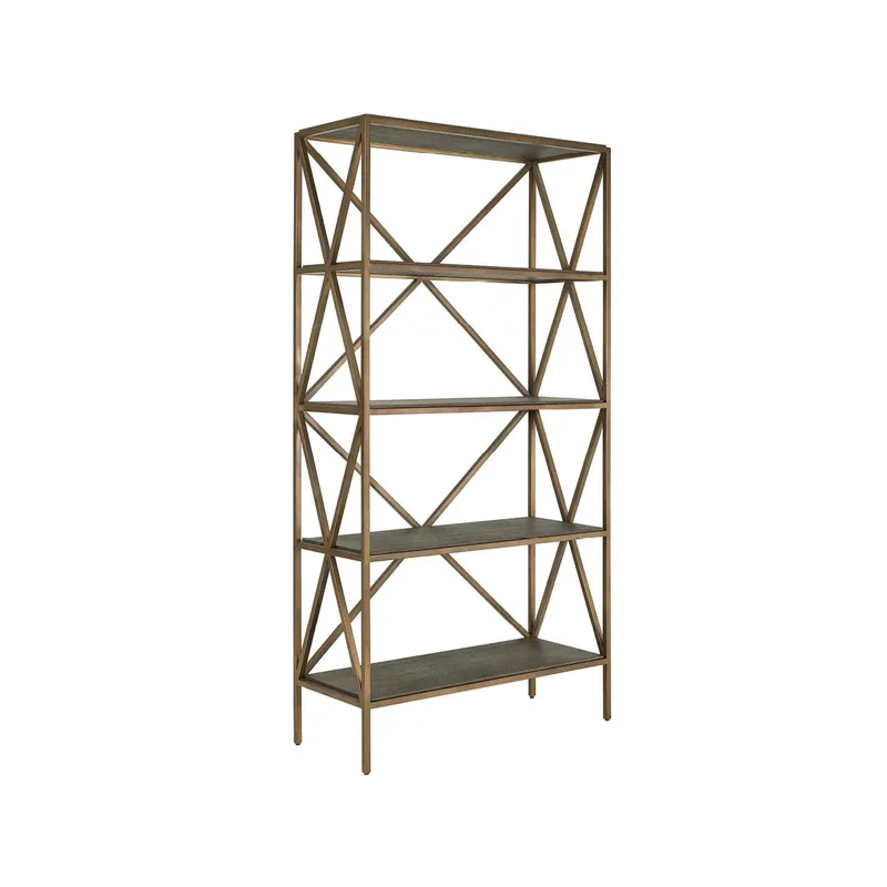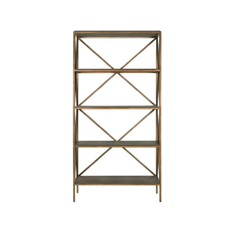 The Cocoa Etagere combines rich wood shelving with a sophisticated Smoked Gold metal frame featuring geometric X-pattern bracing. This tall, slender piece provides display storage while creating striking vertical interest, exemplifying the successful marriage of natural materials and contemporary metal accents.