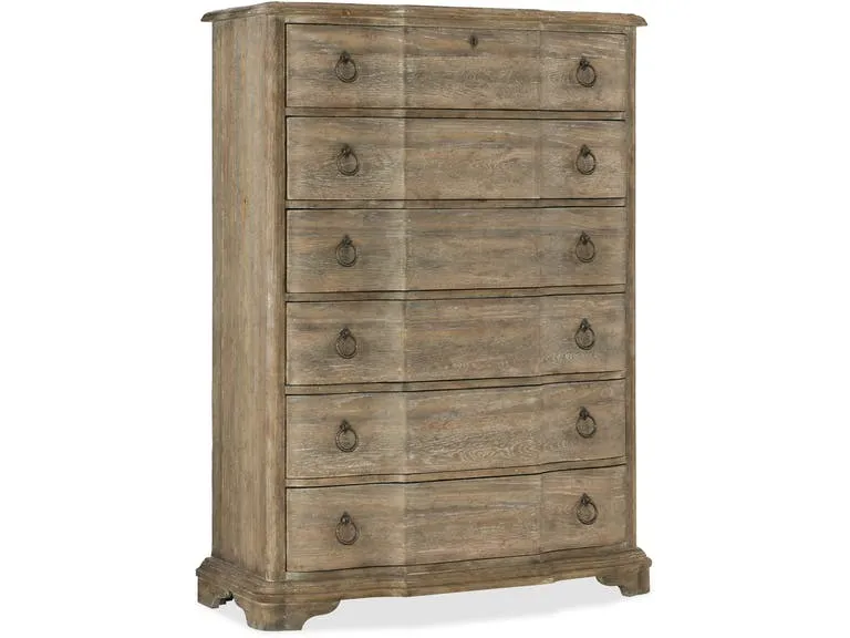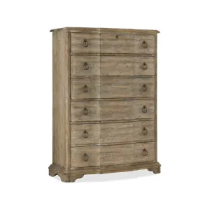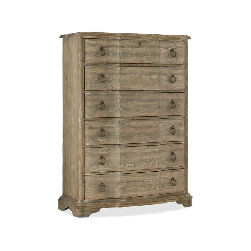 Boheme Chimay Six-Drawer Chest (5750-90010-MWD): 44 x 19.25 x 60 - With organic beauty and a softly shaped silhouette, the Chimay Chest is finished in the sophisticated Antique Milk Paint, a light brown finish with nearly opaque antique milk-colored overcoat offering a brush-painted effect. With six drawers and a drop-in felt liner in the top two drawers, the bottom drawer is cedar-lined. Six drawers, Drawer opening: 36 3/4W x 13D x 6 1/2H, Levelers, Black drop-in felt liner in top two drawers, Cedar lined bottom drawer, Faux key escutcheon for decoration, Handholes on backpanel