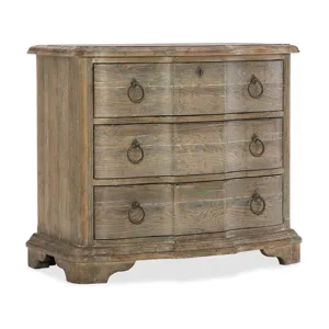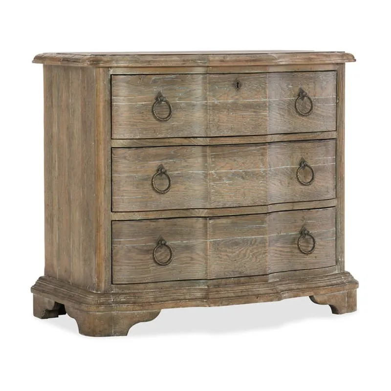 Boheme Bastogne Three-Drawer Nightstand (5750-90016-MWD): 34.75 x 18.5 x 30 - With organic beauty and a softly shaped silhouette, the Bastogne Nightstand is finished in the sophisticated Antique Milk Paint, a light brown finish with nearly opaque antique milk paint overcoat offering a brush-painted effect. With three drawers and a drop-in felt liner in the top drawer, the bottom drawer is cedar-lined. Features a handy 3-plug outlet and one live USB port, along with a three-intensity touch switch on each side and a light underneath. Three drawers, Drop-in felt liner in top drawer, Cedar-lined bottom drawer, Cord clip on back for wire management, FC707 three plug outlet with USB port, Three-intensity touch switch on each side, One light underneath