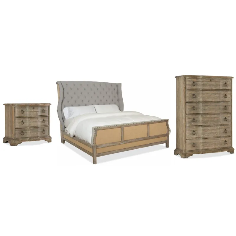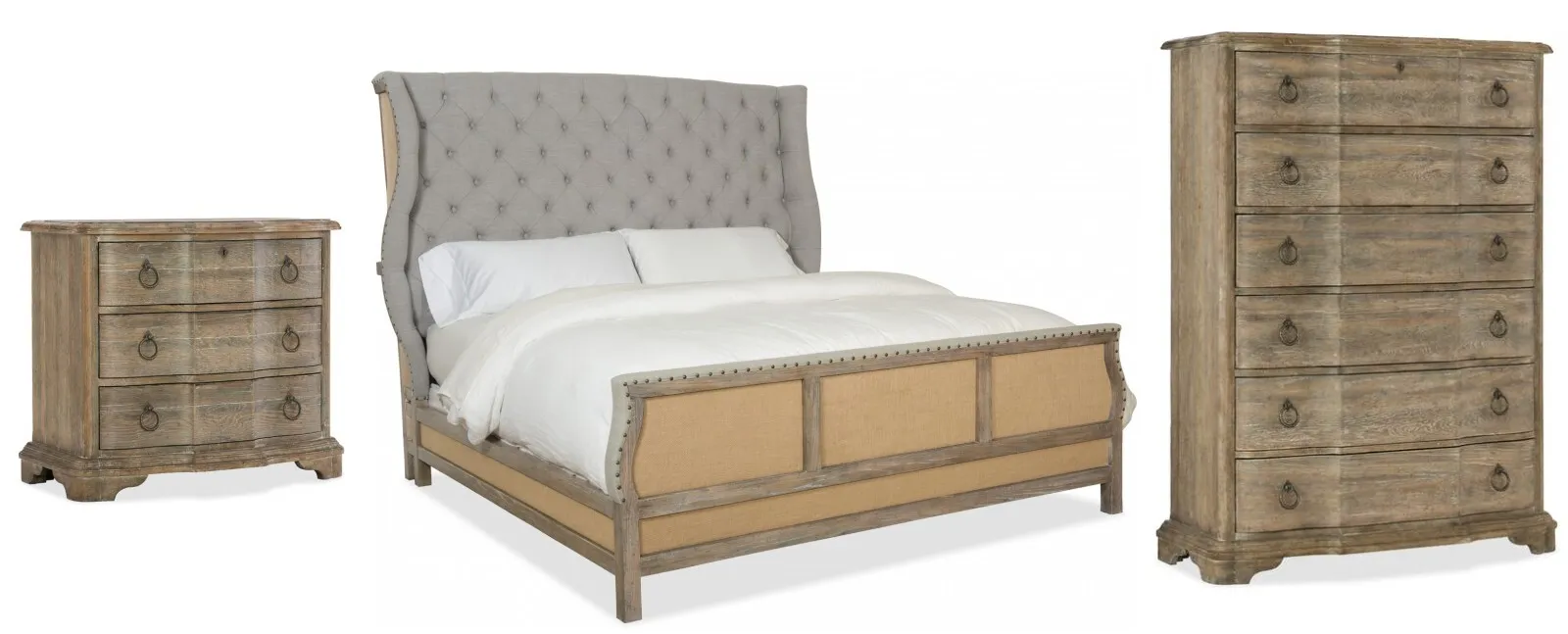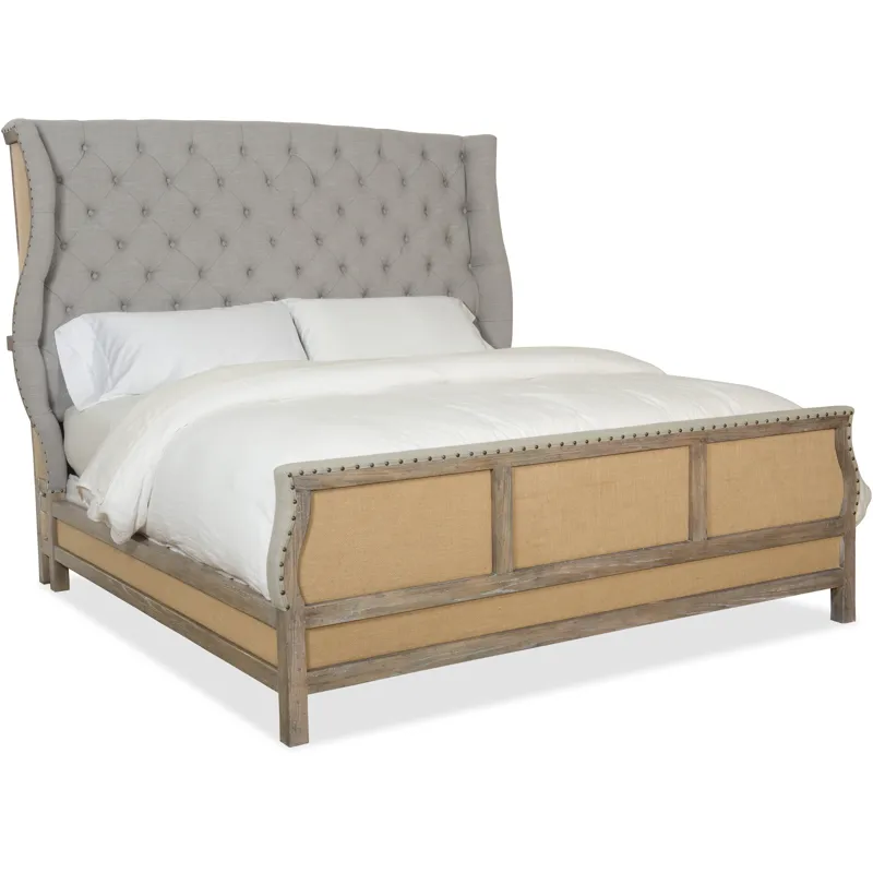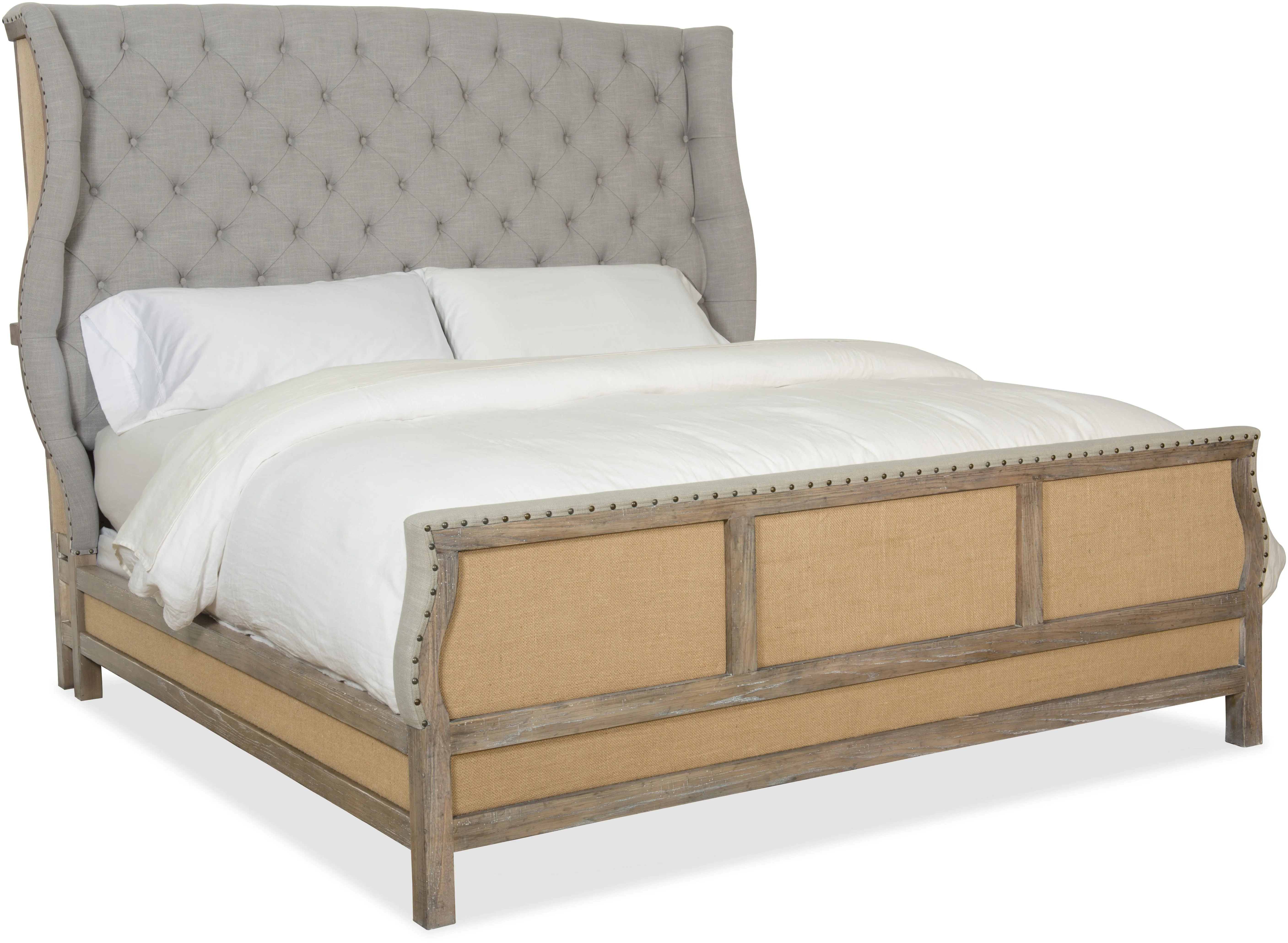 Boheme Bon Vivant De-Constructed King Uph Bed (5750-90166-MWD): 89.75 x 91 x 72.5 - Inspired by the Belgian design aesthetic, the Bon Vivant De-Constructed King Bed combines a button tufted soft gray linen upholstered shelter headboard with a footboard, back and sides that pair linen and burlap for a sophisticated rustic appeal. The finish is Antique Milk, a light brown with a nearly opaque antique milk color and a brush-painted effect. Bed includes headboard, footboard and rails. King size, Includes headboard, footboard and rails, Button tufted, Antwerp Linen fabric, Burlap