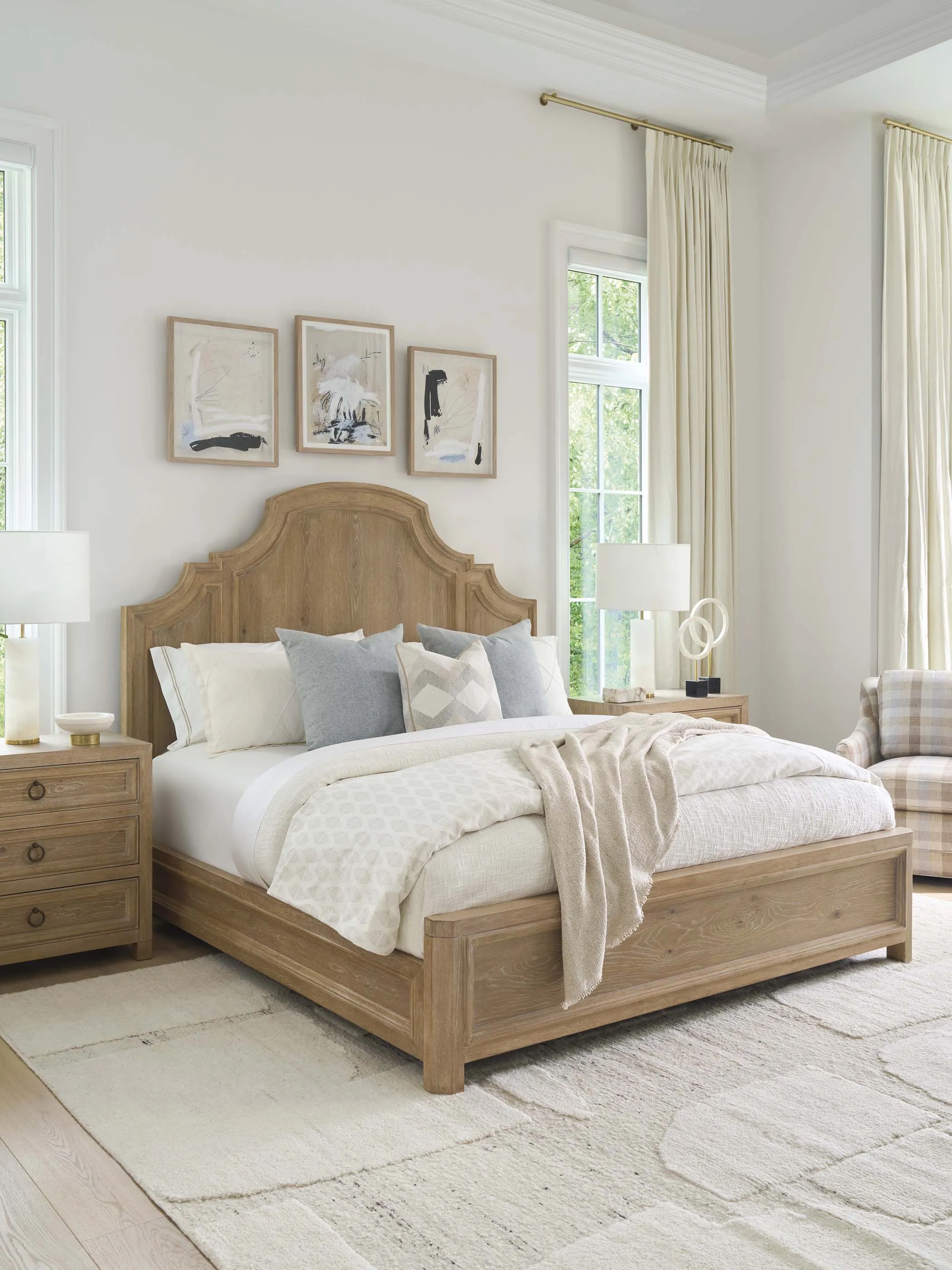 The Valley Club bed makes a striking visual statement, with its arched headboard showcasing a vertical pattern of white oak veneer, framed with raised panel molding. The footboard and side rails carry the same molding detail, framing a horizontal pattern of oak veneer. The design is also available as a headboard only.