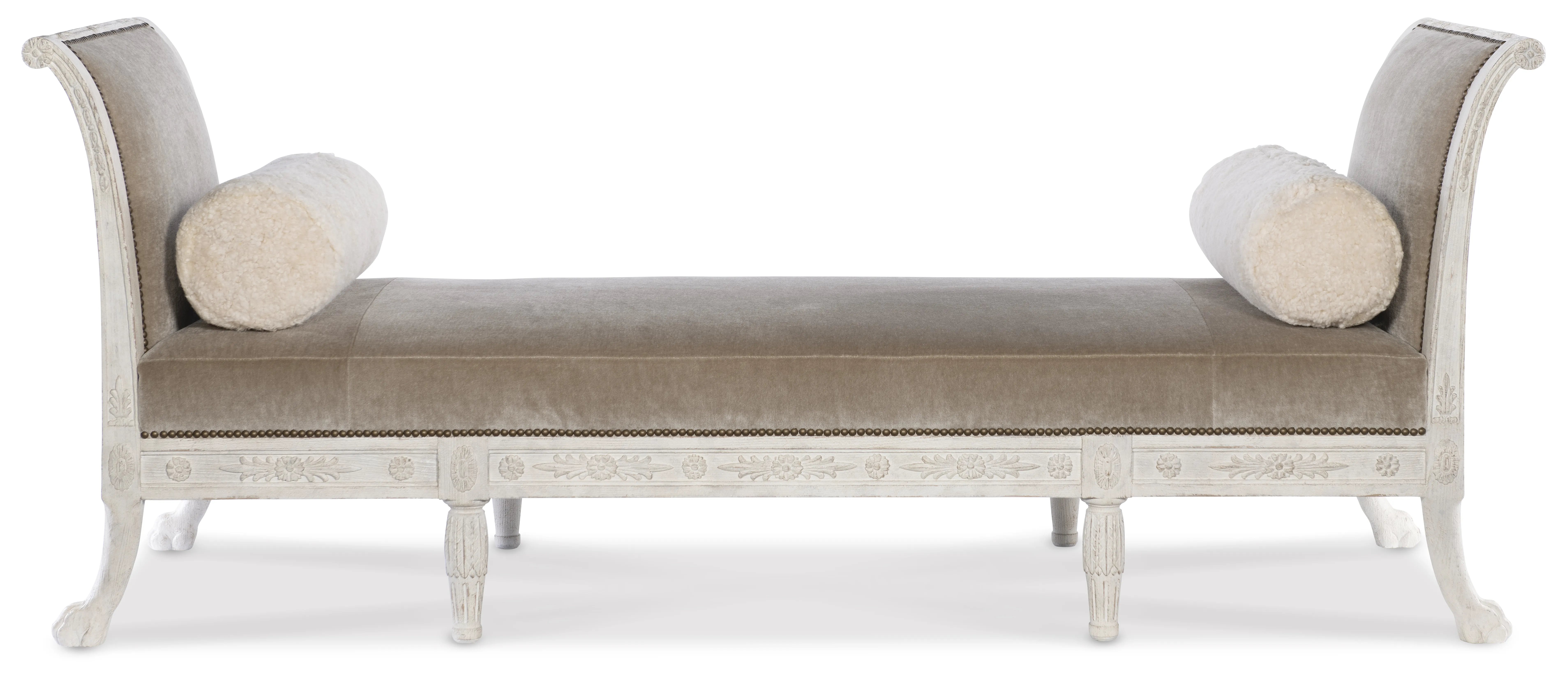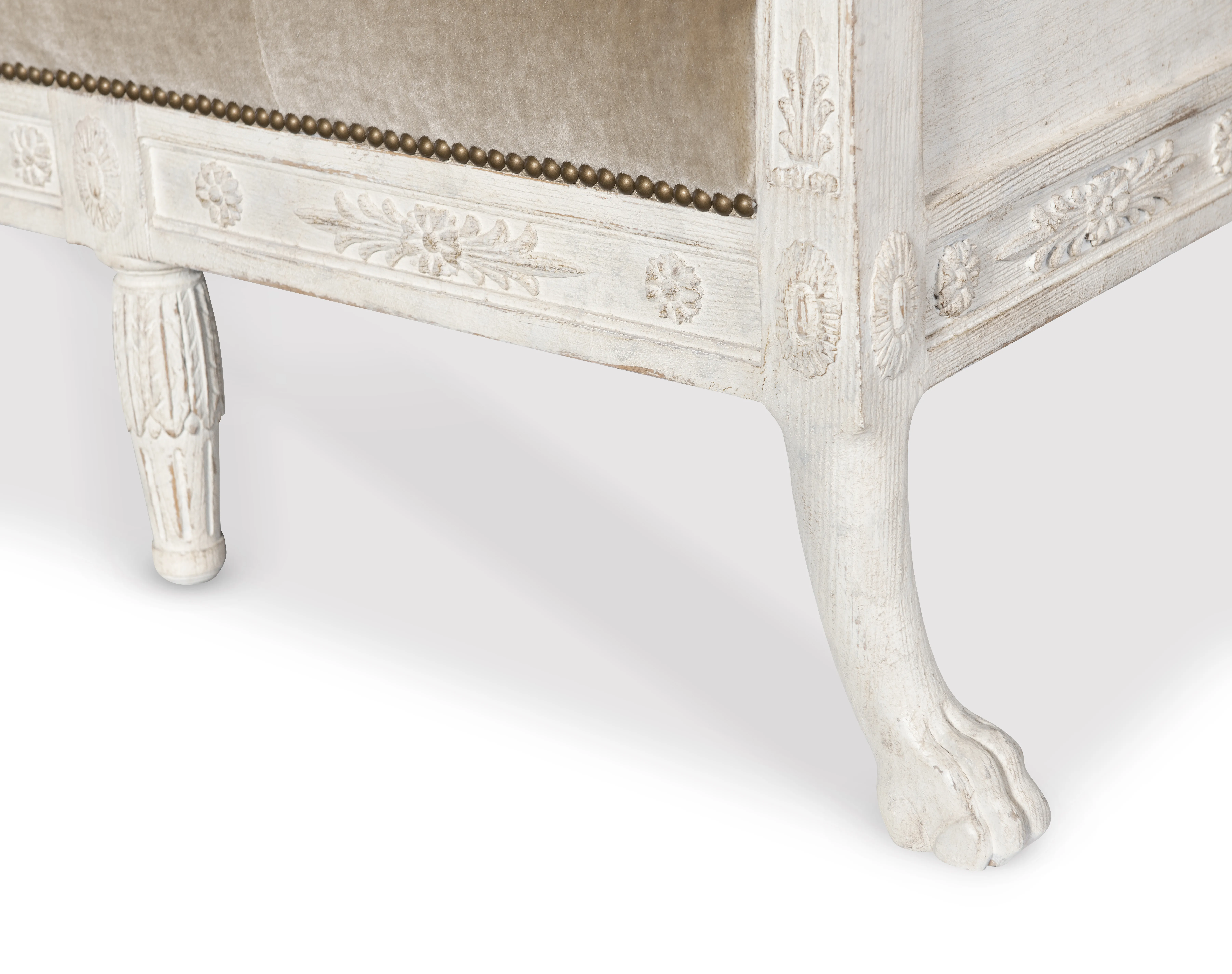 The 18th-century Swedish Neoclassical daybed with carved paw feet exemplifies the influence of the neoclassical style that swept through Europe, including Sweden, during this period. This style was characterized by a return to classical ideals of symmetry, simplicity, and elegance. The carved paw feet are a distinctive decorative element, often used to evoke the grandeur and authority associated with classical antiquity, while the overall design reflects a blend of functionality and refined aesthetics.Available in any Century finish. Available in any Century fabric or COM.