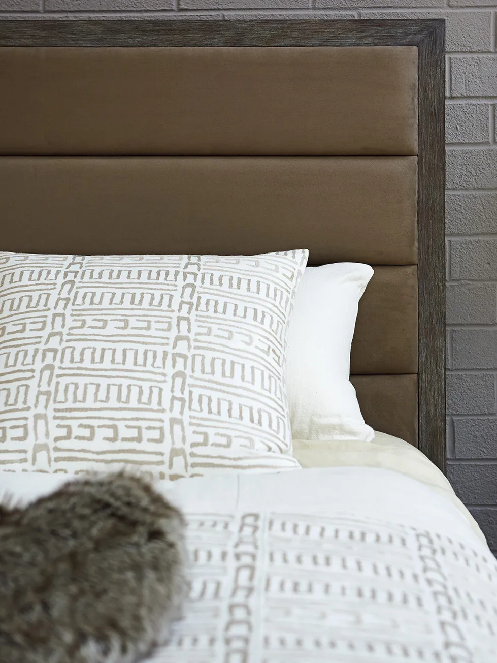 The casual contemporary aesthetic blends clean architectural lines with layers of texture in a soft natural color palette. Our Gramercy headboard pairs soft Italian ultrasued in a mocha brown with oak grain in warm brown undertones of a cerused gray finish. Be sure to order 001-760 metal bedframe for proper set-up and support.
