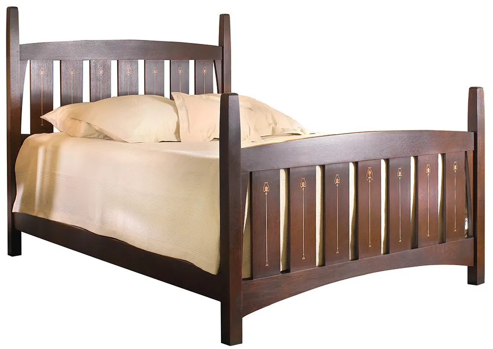 Delicate inlays of ebonized hardwood, cherry, and holly grace the slats of this Mission bed based on an early design by Harvey Ellis. Available in solid oak or cherry, with optional platform storage (16 in. high), and in three footboard styles: tall post footboard (33 in.), mid-height footboard (25 in.), or low-height footboard (14 in.).