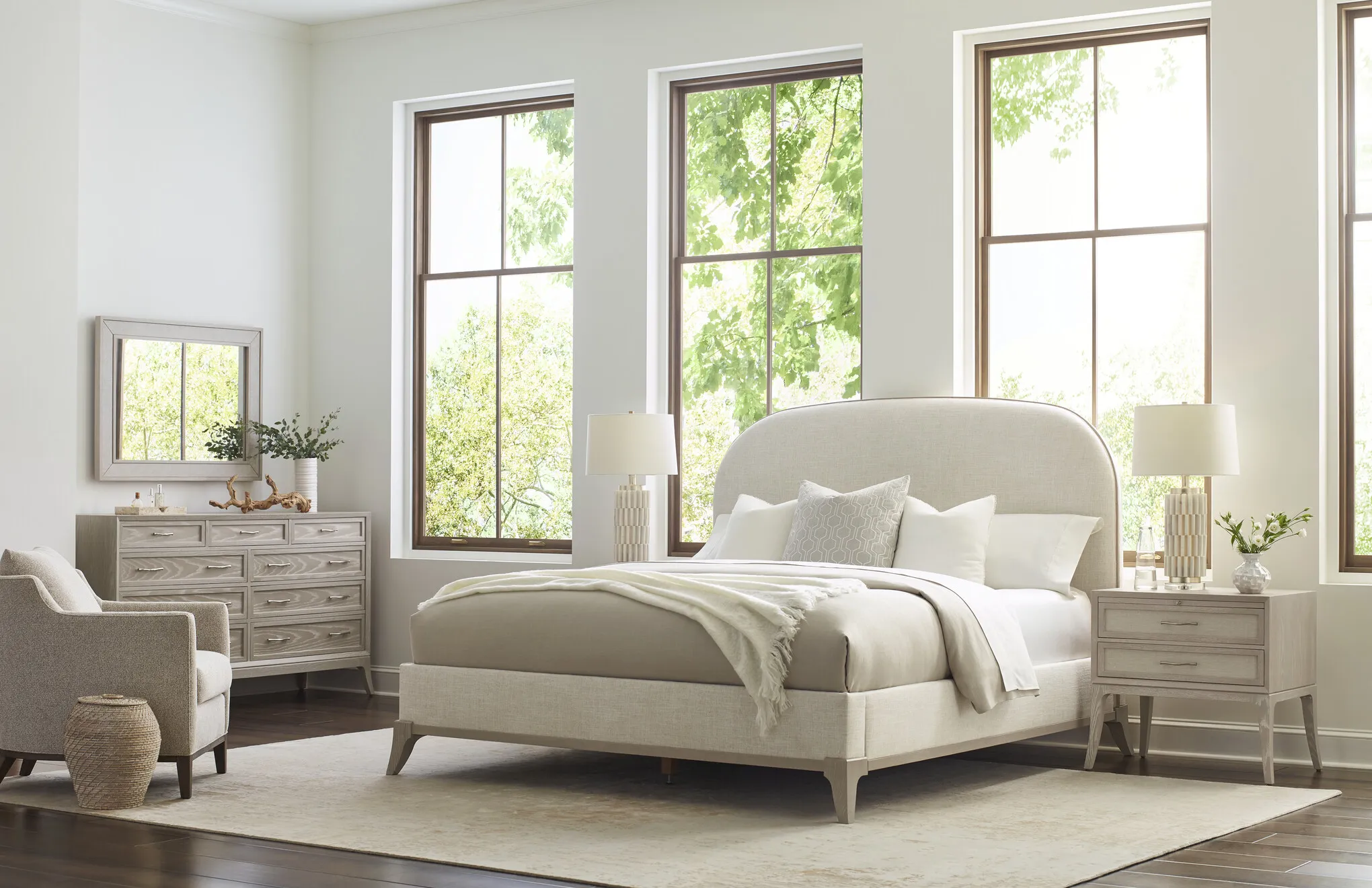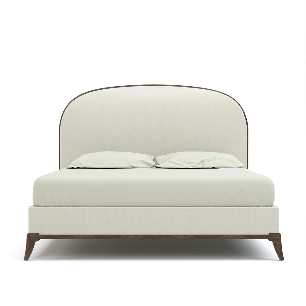 Chic in its simplicity, the Maidstone Upholstered Bed is undeniably stylish. Its high, smoothly curved headboard is neatly trimmed in carved wood, and the upholstered footboard and rails are supported by flared saber legs. Solid red oak in your choice of Pier or Sandbank finish, with upholstery available in any fine Stickley fabric or leather.