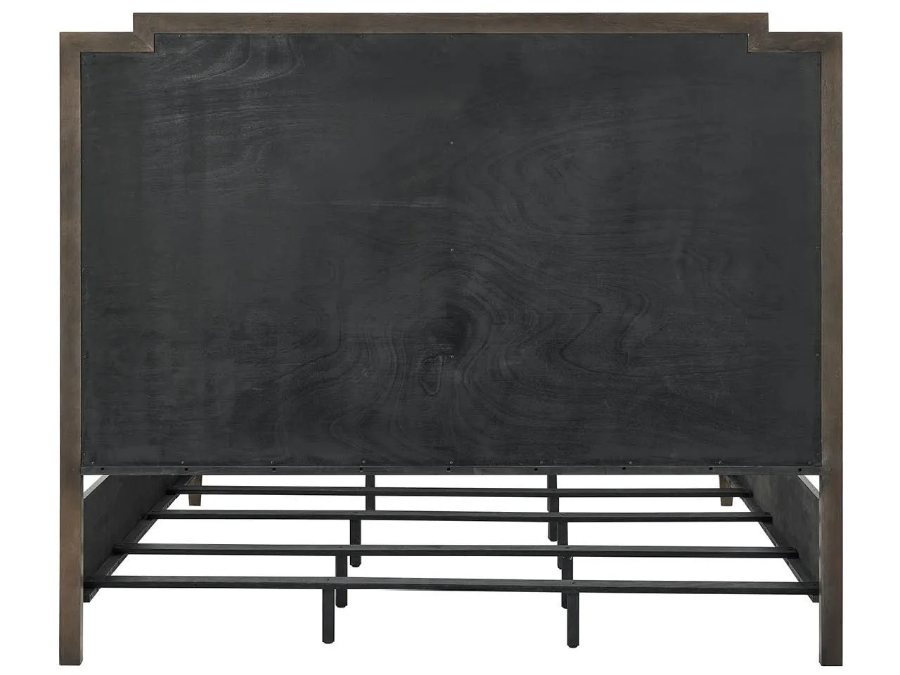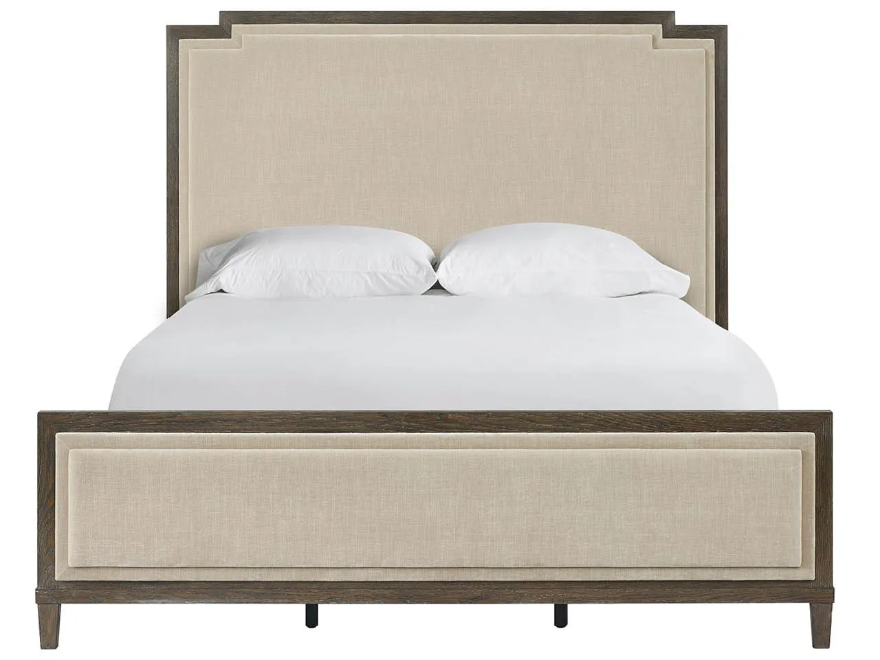 The Cocoa Bed redefines bedroom elegance with its distinctive double-stepped, notched design and soft Silken Fog upholstered panels. Deep Cocoa wood trim creates a striking visual contrast while signature tapered legs maintain refined proportions that complement both traditional and contemporary interiors.