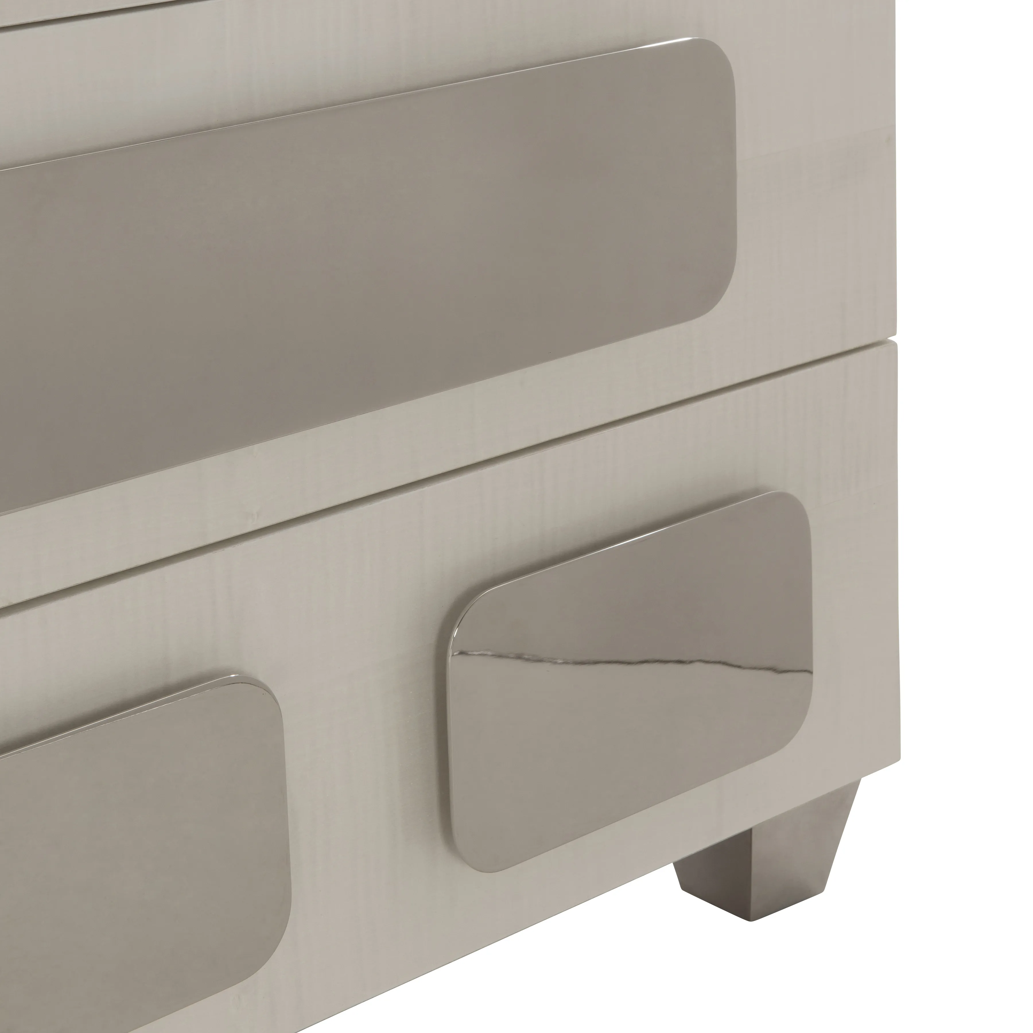 Dresser with figured sycamore veneer in Powder finish and Polished Stainless Steel feet, with large Polished Stainless Steel rectangular or square pulls in various combinations on the six soft-close drawers. Center support leg. Adjustable glides and anti-tip kit with instruction sheet.