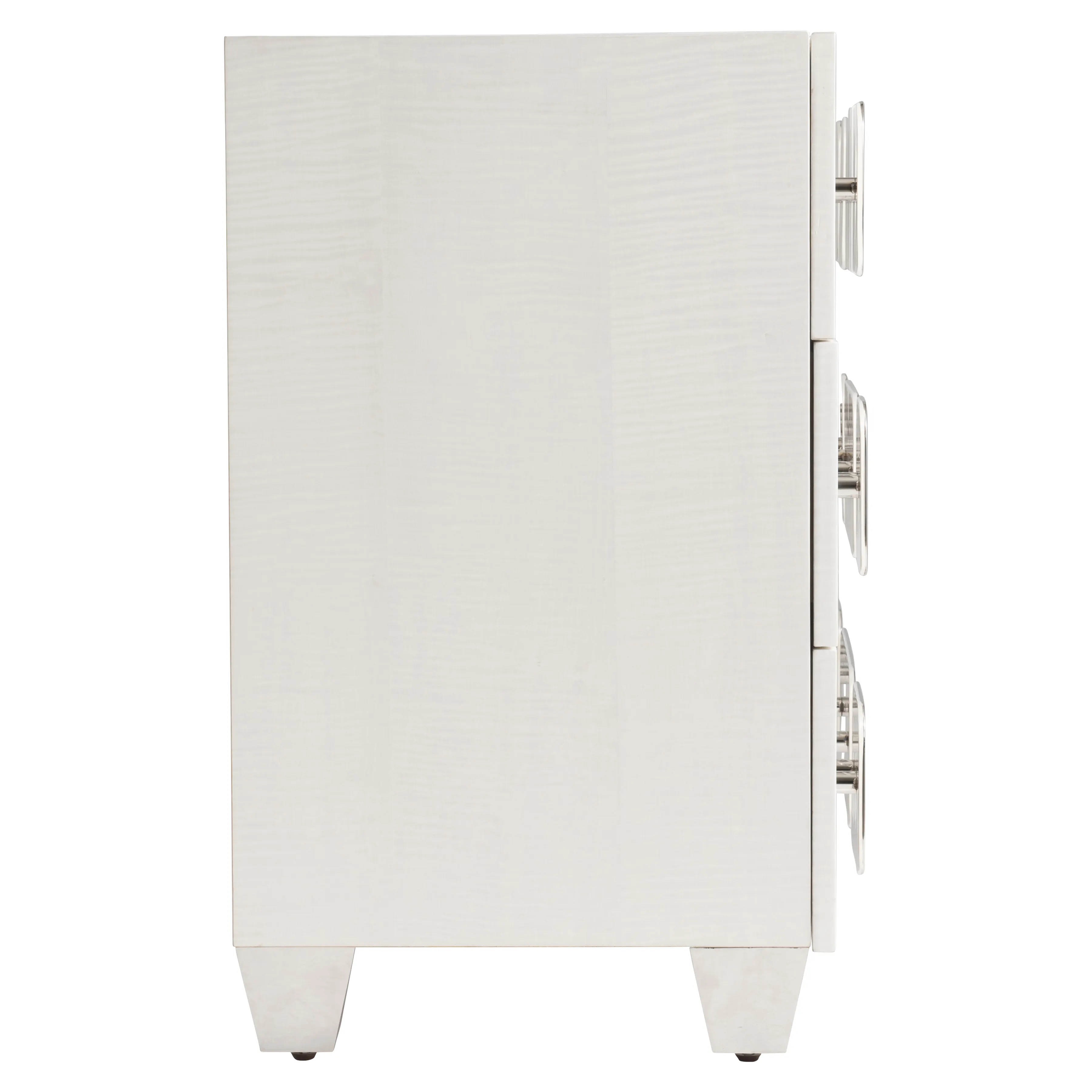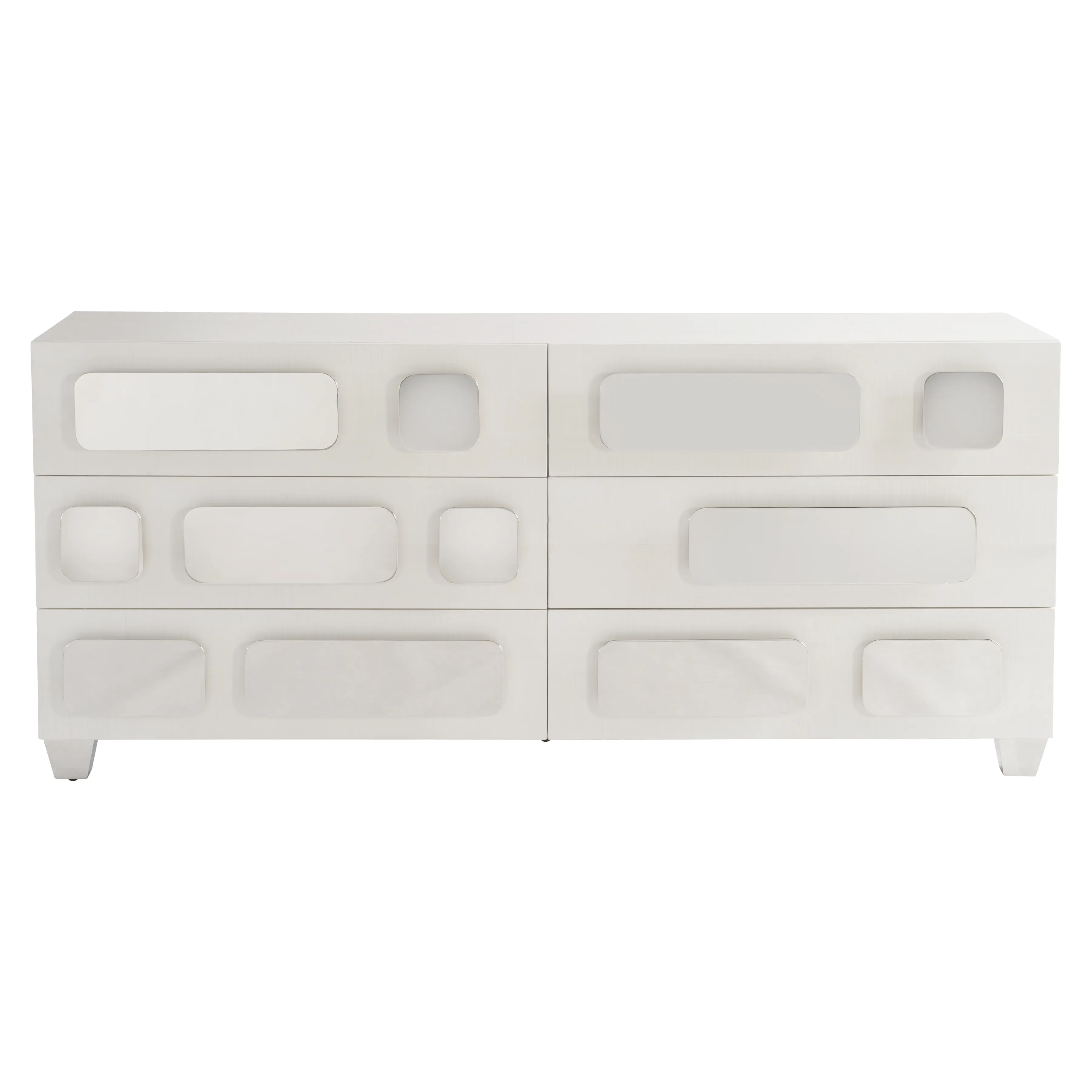 Polished stainless steel pulls make a pop-art statement on the fronts of the Padma dresser's six soft-close drawers. Varying shapes and sizes craft a unique look all its own, while the wooden case is finished in Powder.