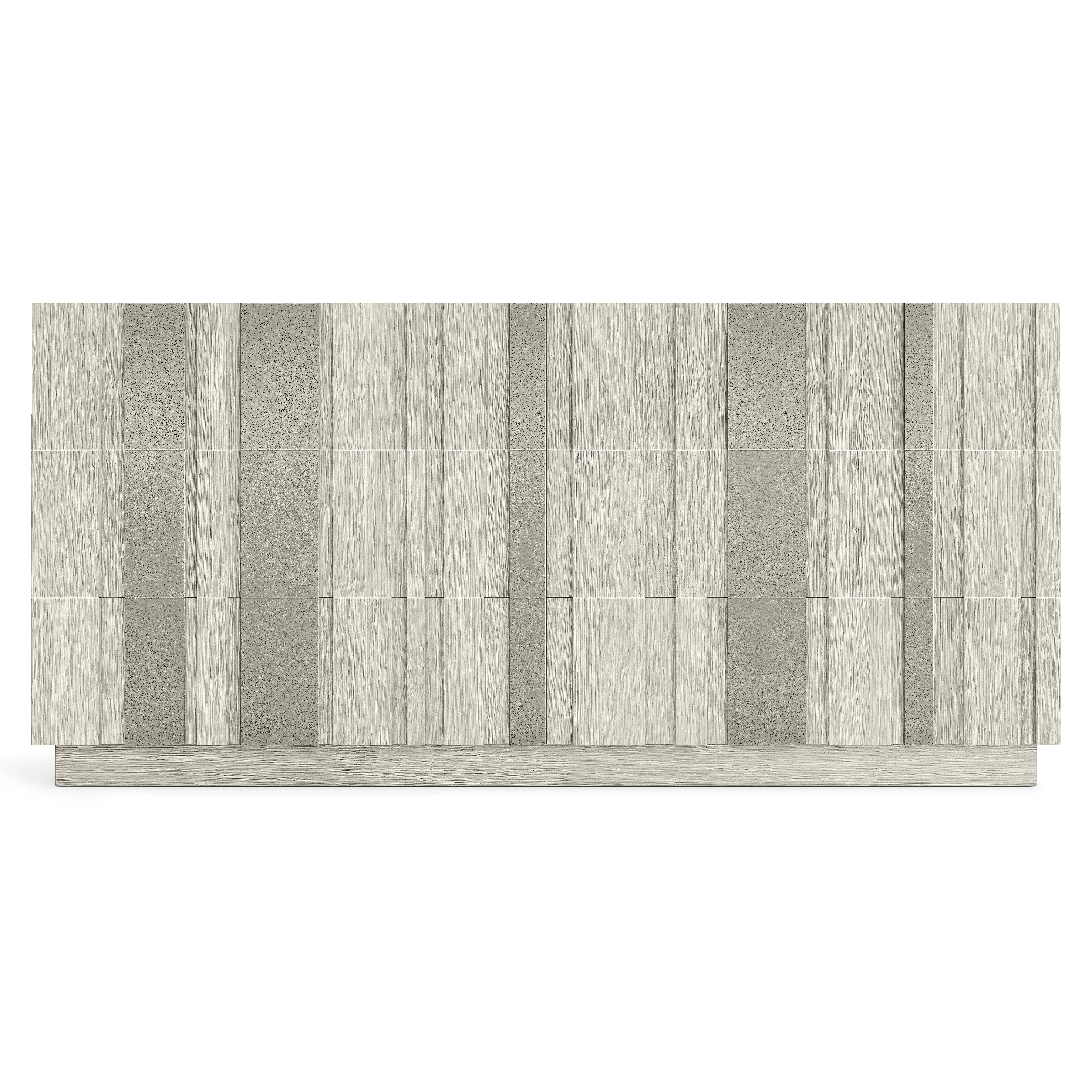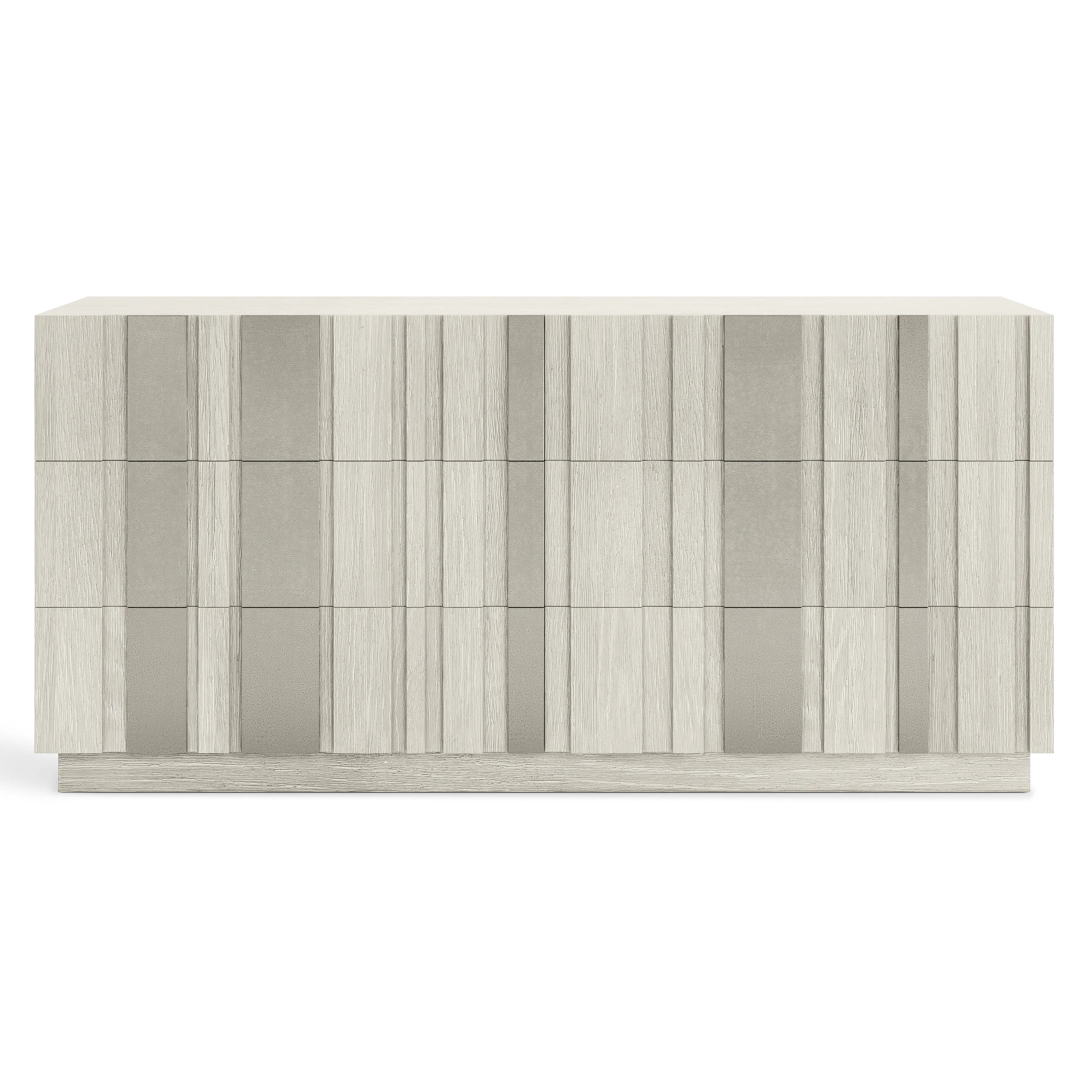 A pattern of metal and wood offers an interplay of light and shadow on the Tempo dresser. Six raised-panel drawer fronts have sandblasted aluminum overlays in Satin Nickel finish over wirebrushed oak in Larza finish. This beautiful modern dresser rests on a wood plinth base.