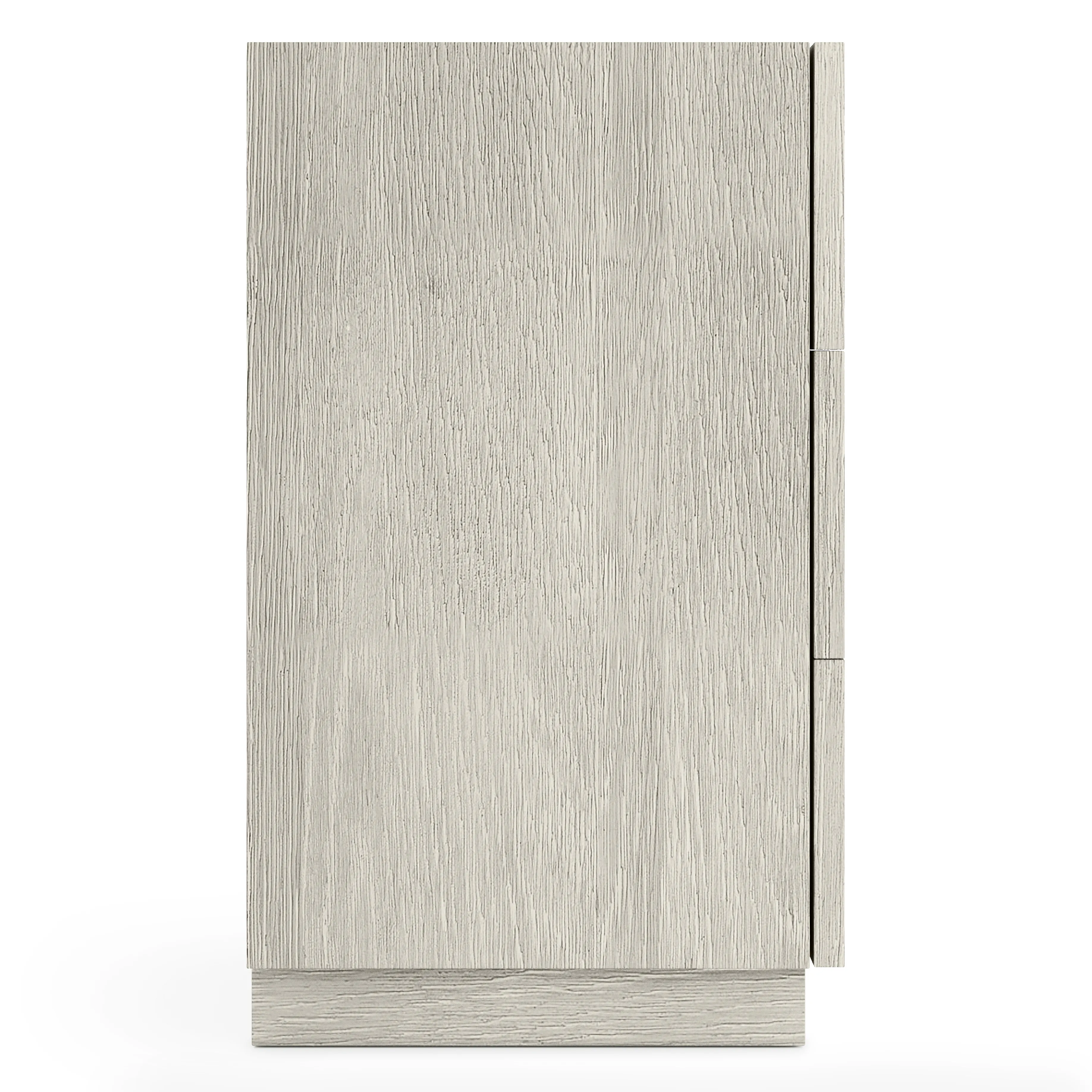 - Wirebrushed oak in Larza finish with smooth top and raised panel drawer fronts with random sandblasted aluminum overlays in Satin Nickel finish