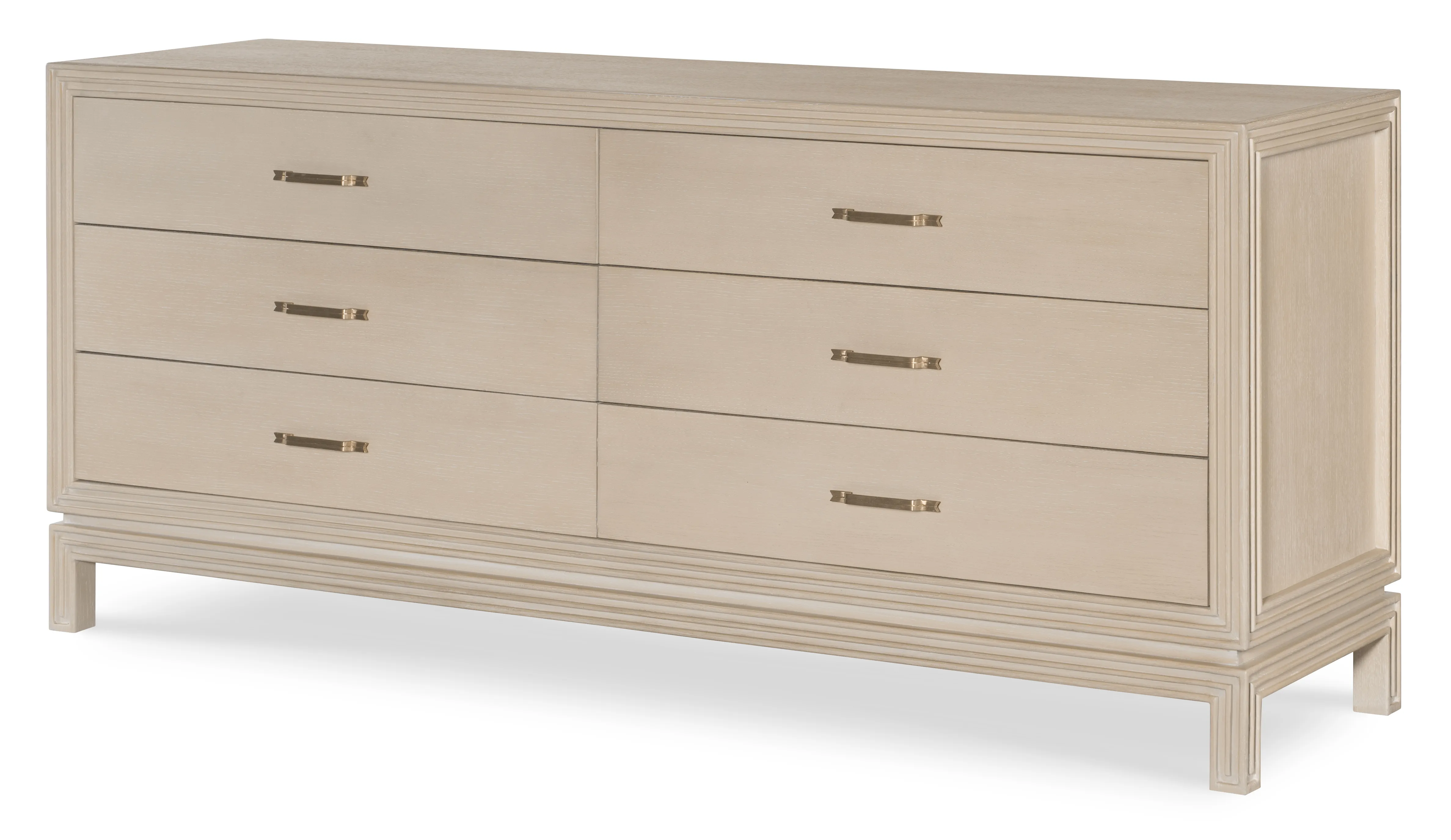 A linear carved border wraps each side of our Deco inspired Lewis Collection, framing every elevation. The same striking carving is replicated in the base, with the case floating above separated by a reveal. The brass hardware with ribbon detail compliments the border design and adds vintage flair. The inset drawers speak to old-world craftsmanship.