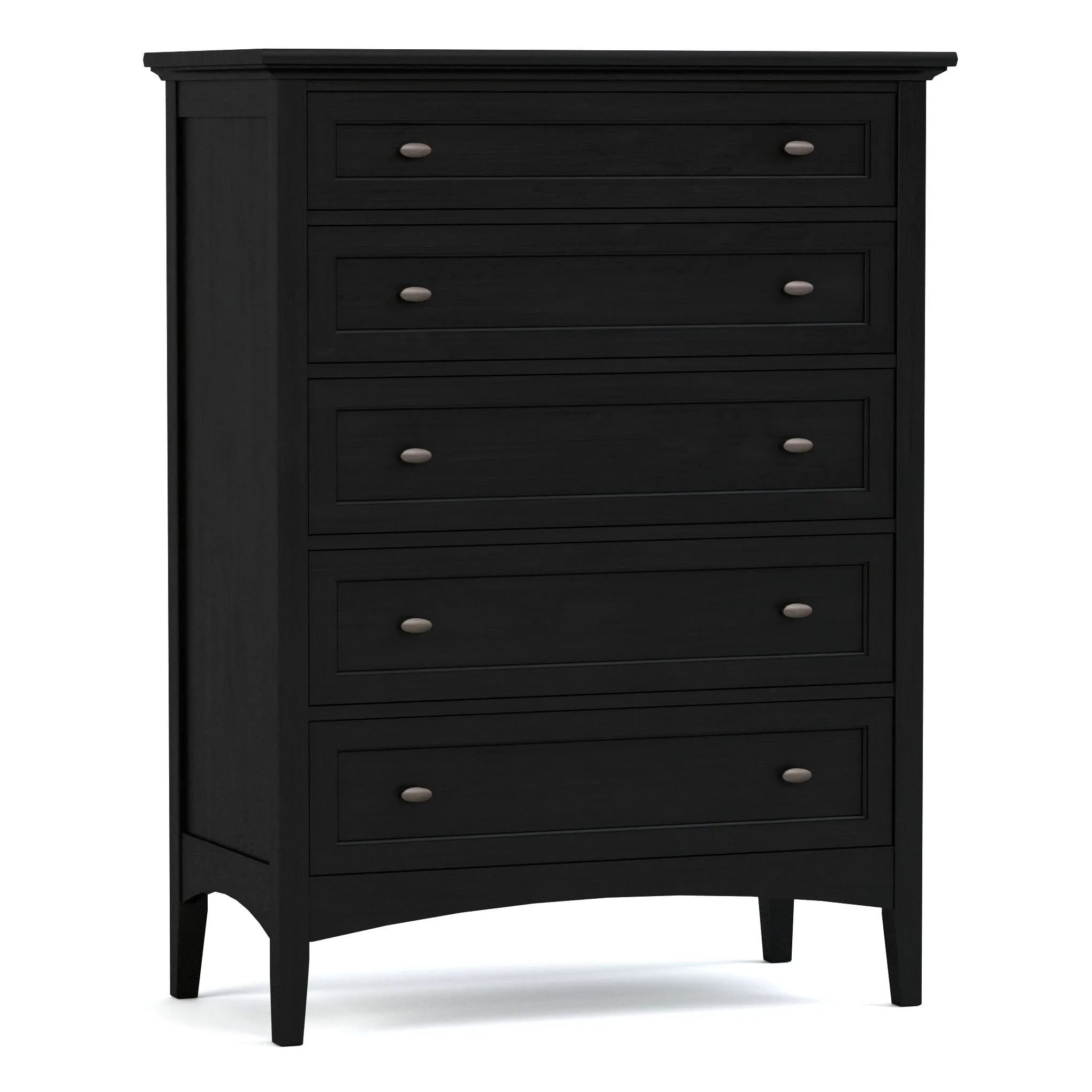 A stylish option for narrower rooms. Solid maple with five drawers, undermount drawer slides, a beveled top, bottom dust panel, tapered post base, and mortise and tenon joinery. Frame and panel ends and drawer fronts give the piece a traditional look. Your choice of curated hardware and Origins by Stickley finish.