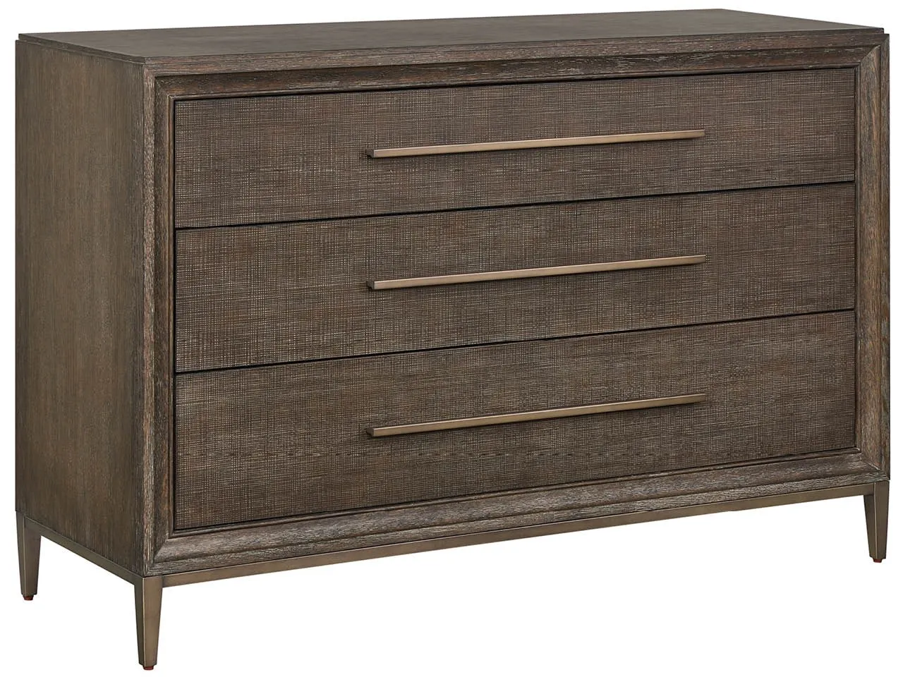 The Montclair Chest features three spacious drawers with rich Cocoa case finish, contrasting beautifully against Embossed Cocoa drawer fronts. Elevated on a contemporary Smoked Gold metal base with streamlined hardware, this piece perfectly balances functionality with sophisticated style.
