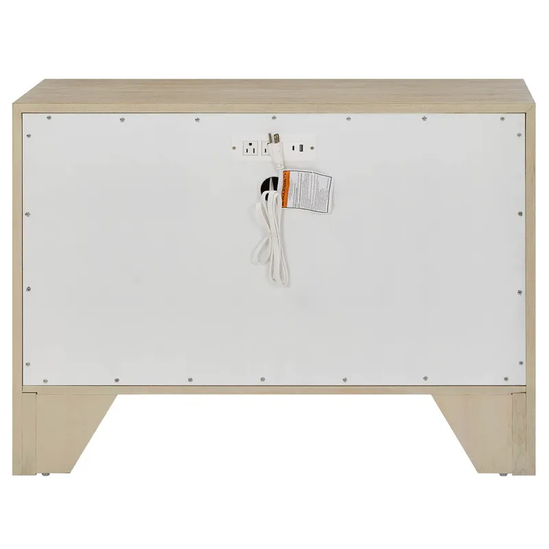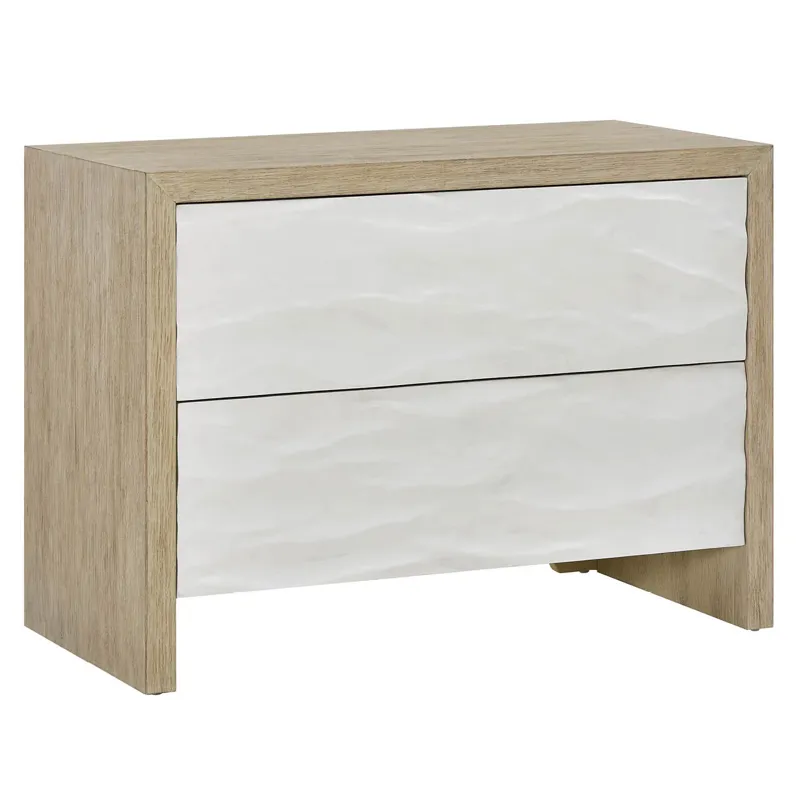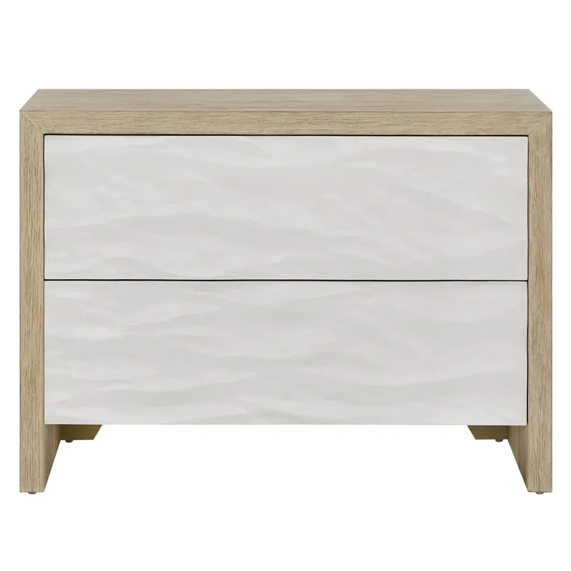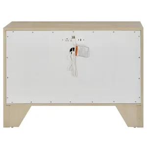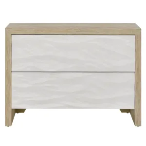 The Oasis Chest features two stylish drawers with distinctive white wave-patterned fronts that contrast beautifully with the Dockside oak case. This chest provides versatile storage while integrated electrical outlets add modern convenience to your coastal bedroom.