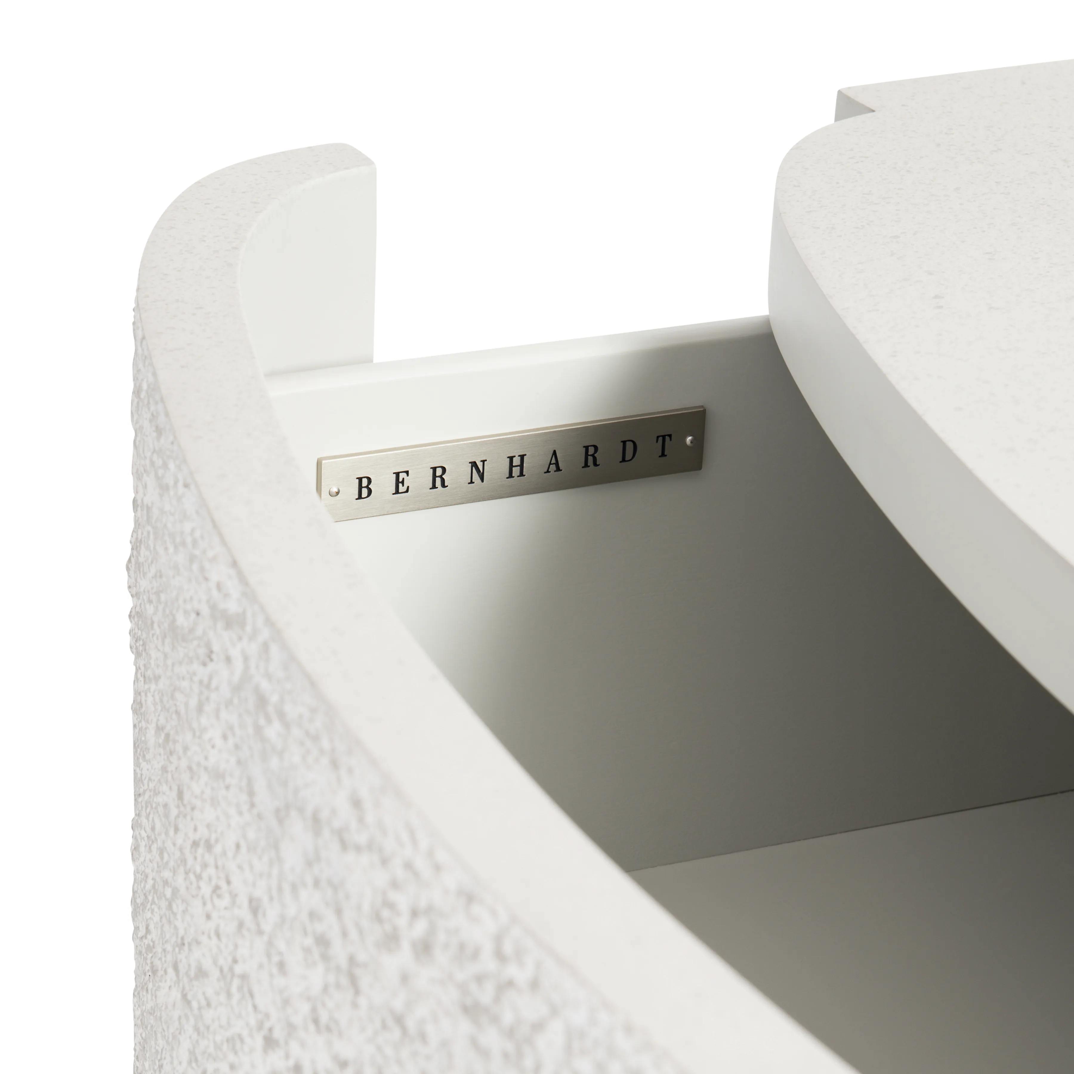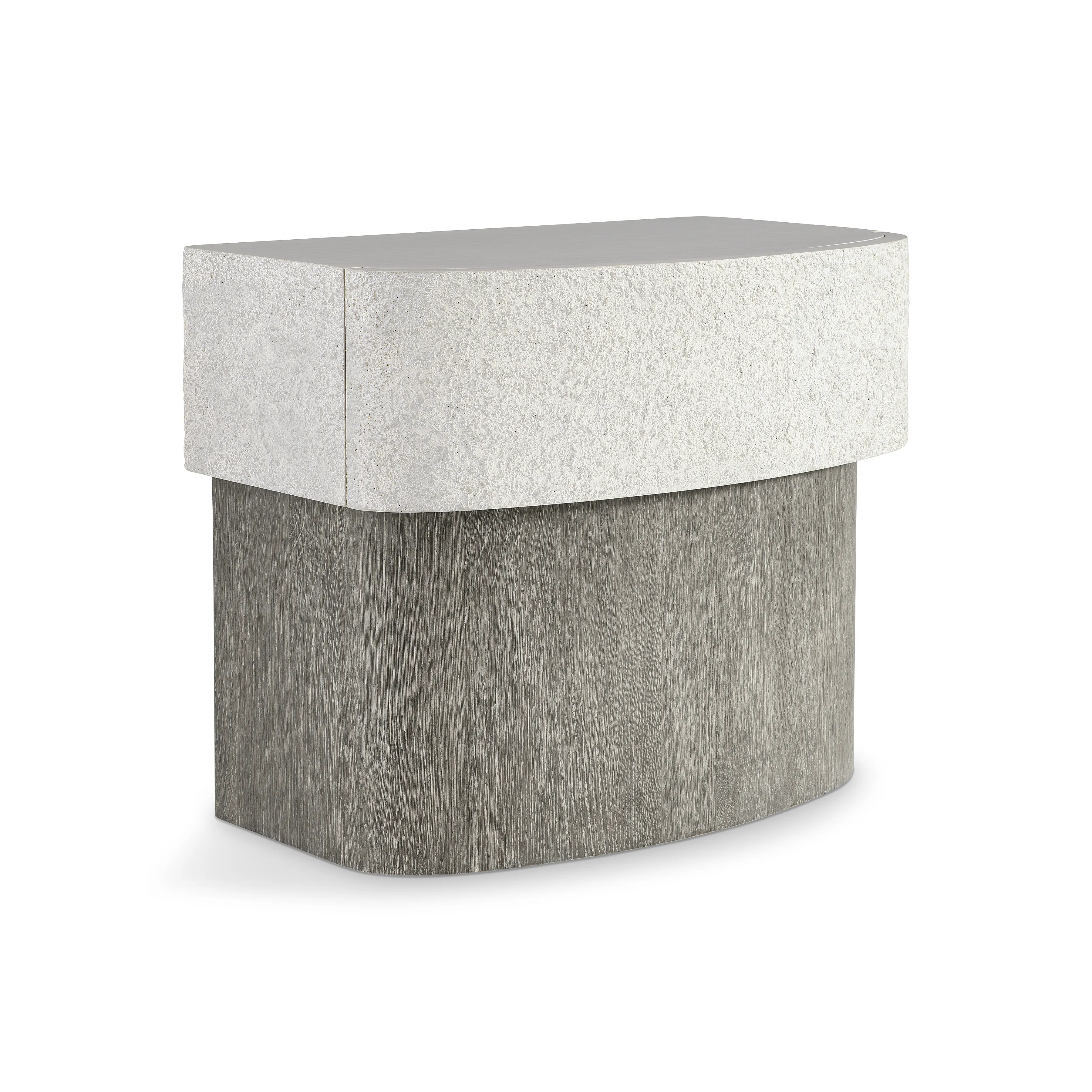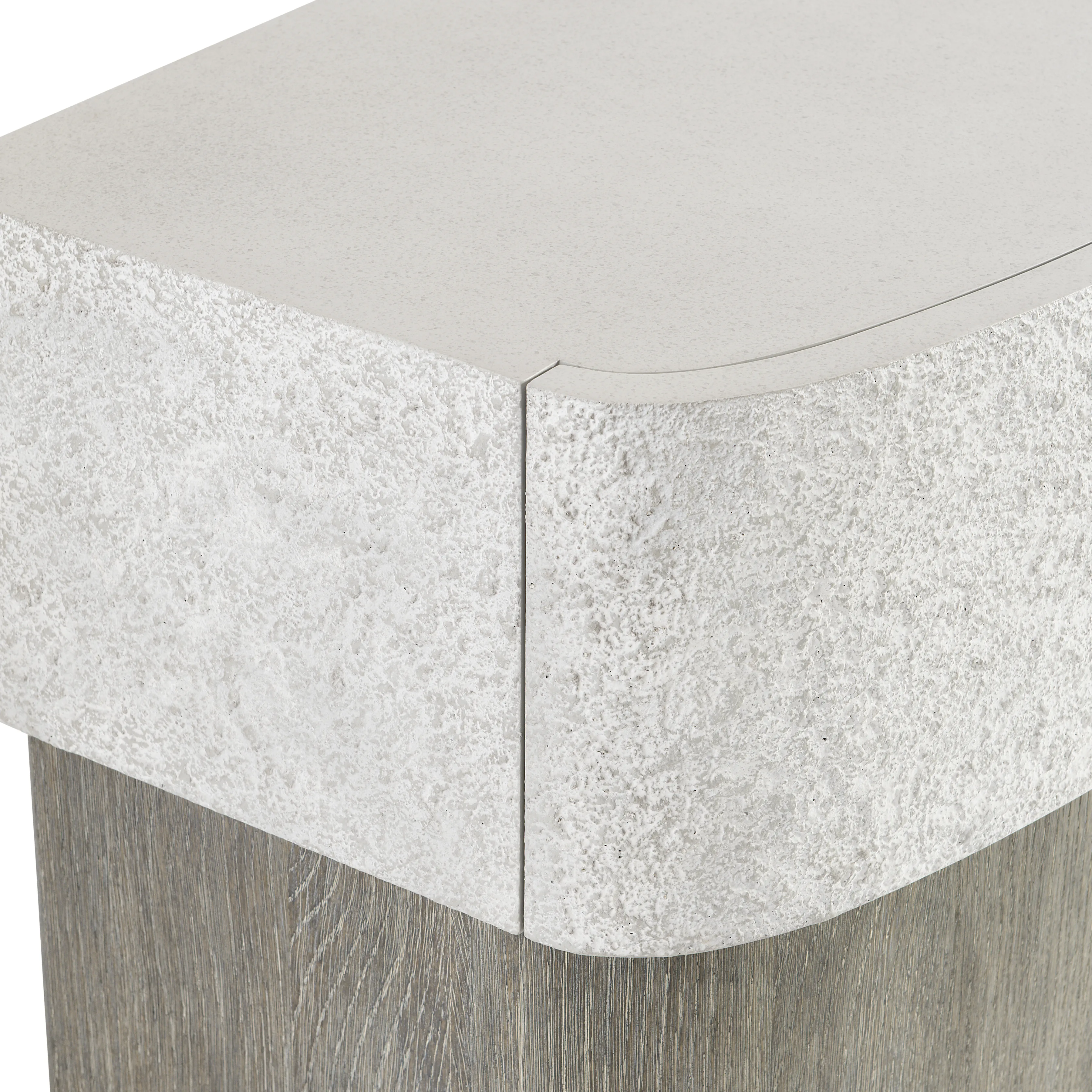 The Monolith nightstand takes a substantial form and softens the edges and corners for an organic aesthetic. Texture is spotlighted in the top's faux stone sides in Millstone finish, as well as the wirebrushed oak base in Puma finish. One soft-close drawer is opened with a hidden fingerpull.