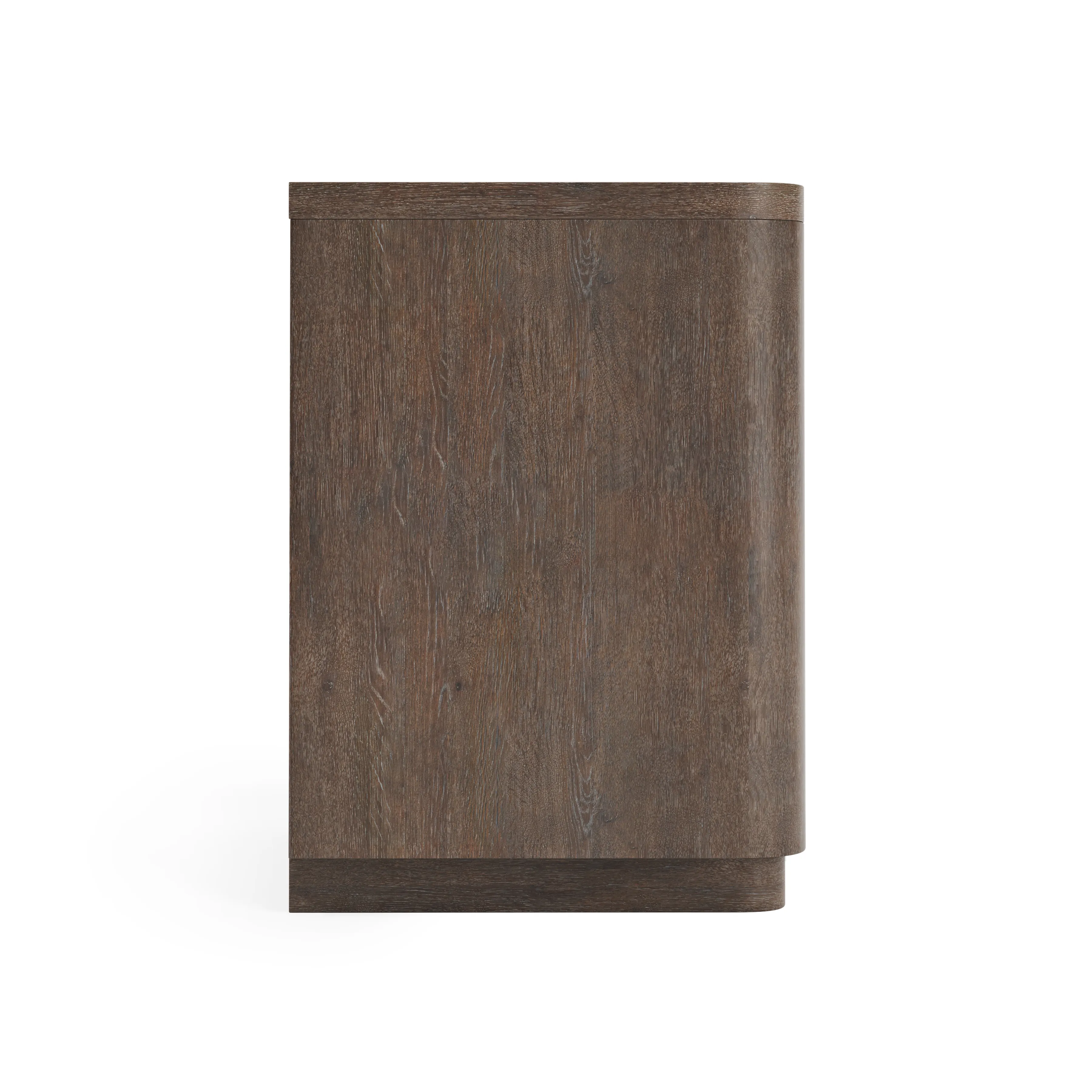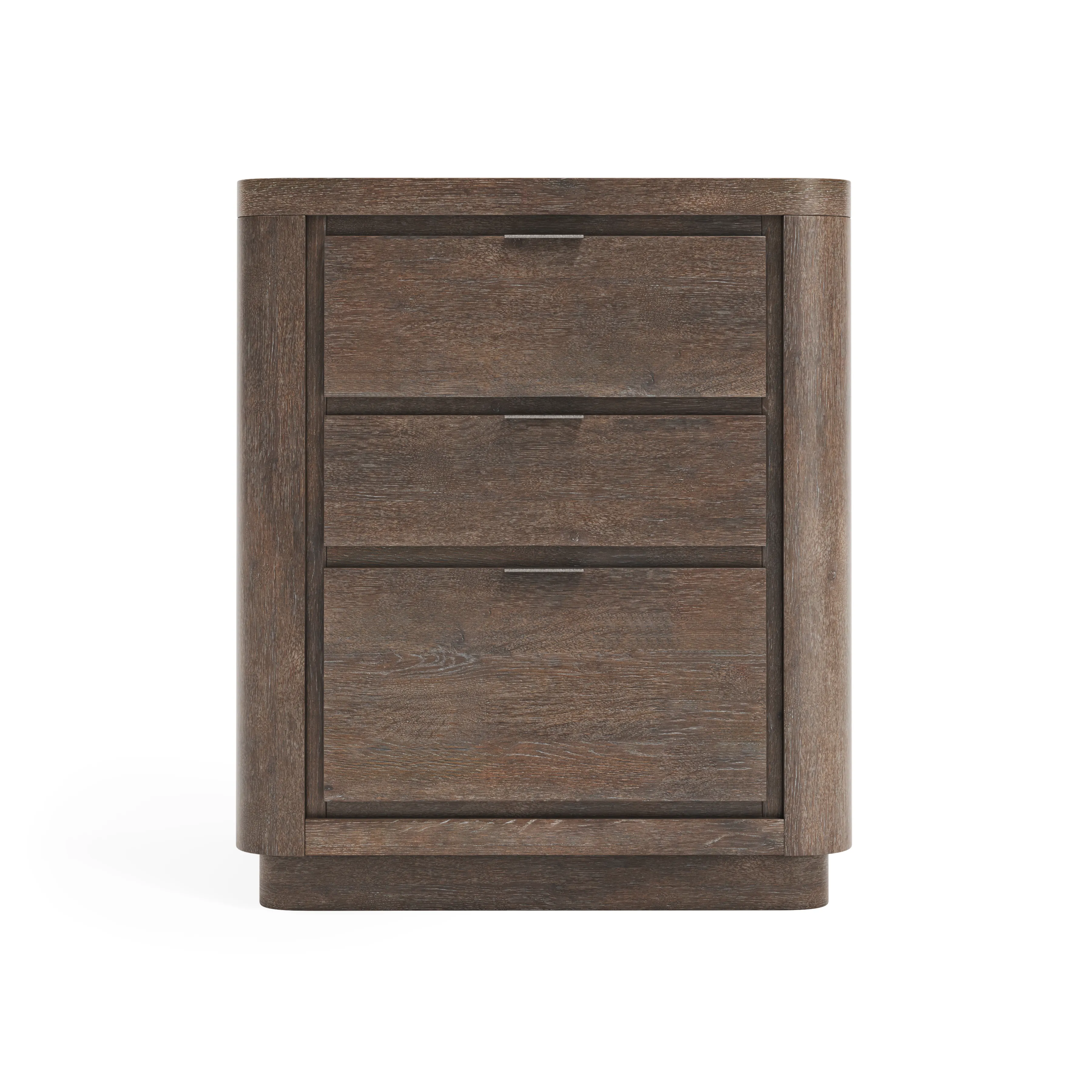 Wirebrushed Oak Nightstand in Cassel finish. Three pull-to-open, soft-close drawers with Applied Texture Aluminum Tab pulls in Atra finish. Plinth base. Two-port A+C USB Charging unit. Adjustable glides. Anti-tip kit. Not suitable for TV use.