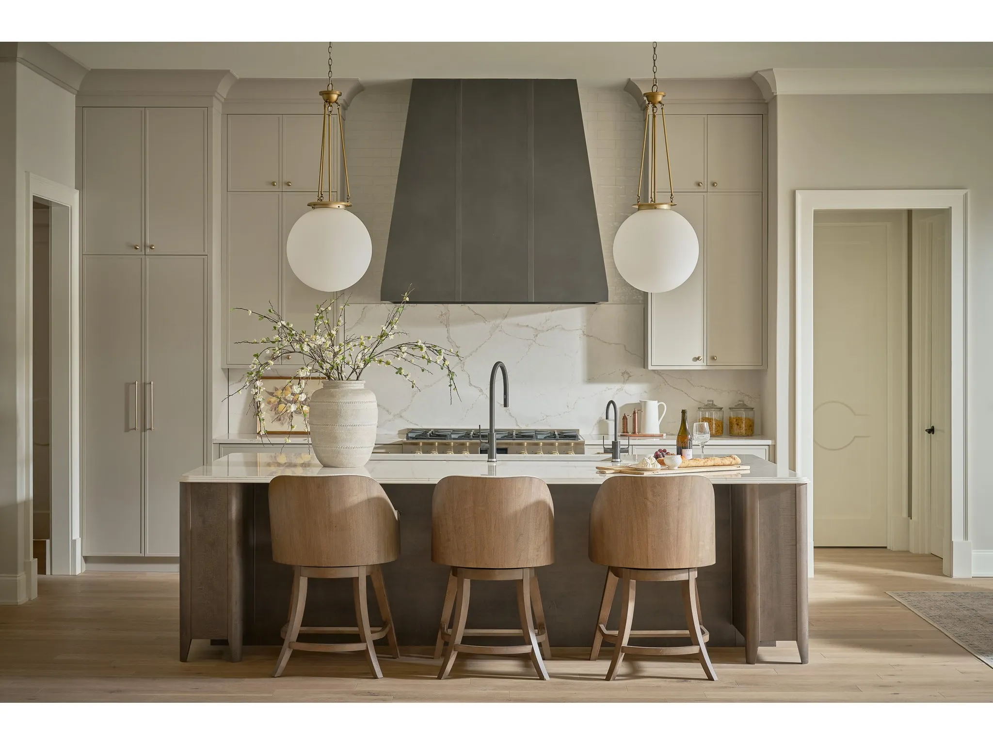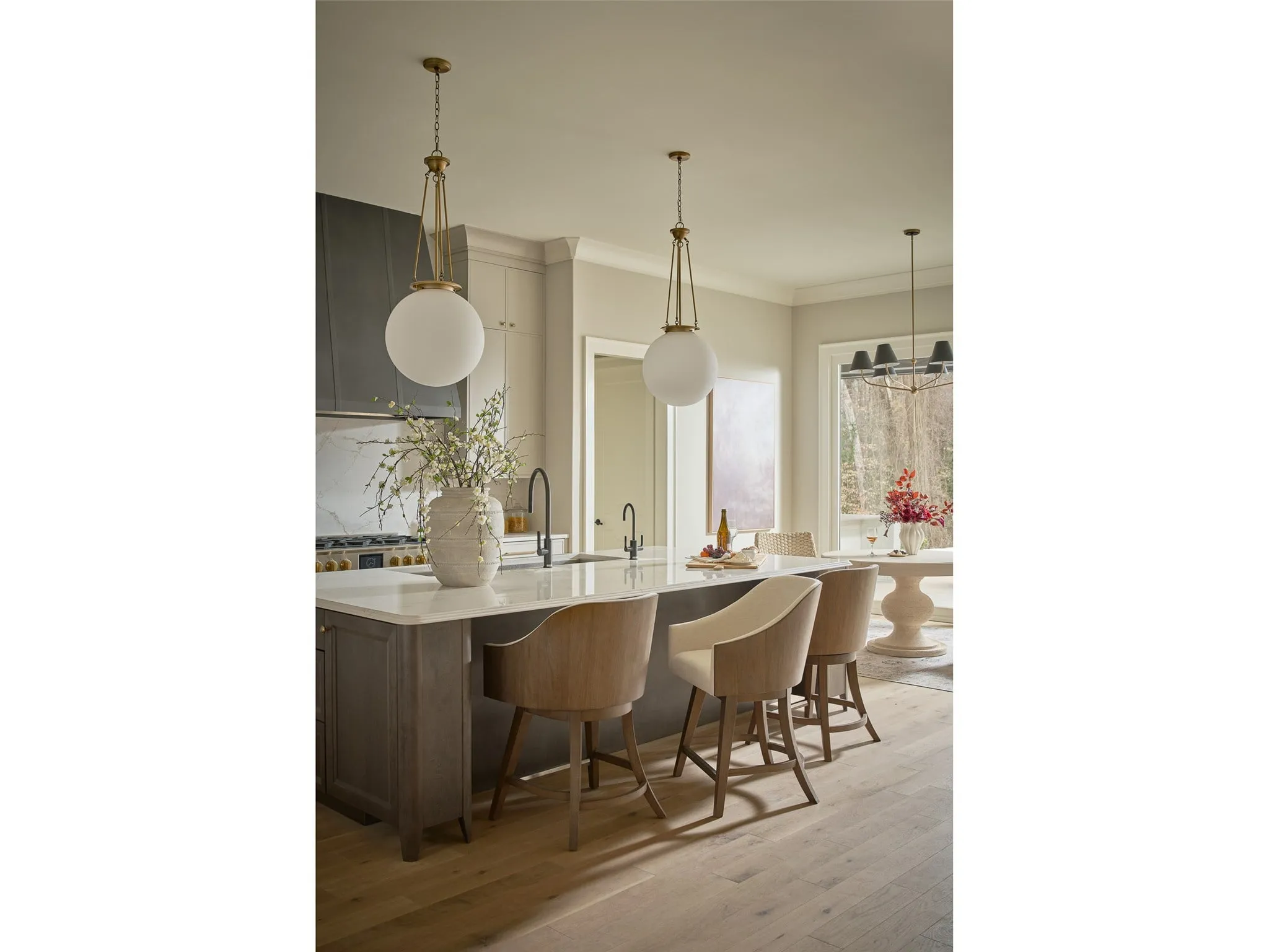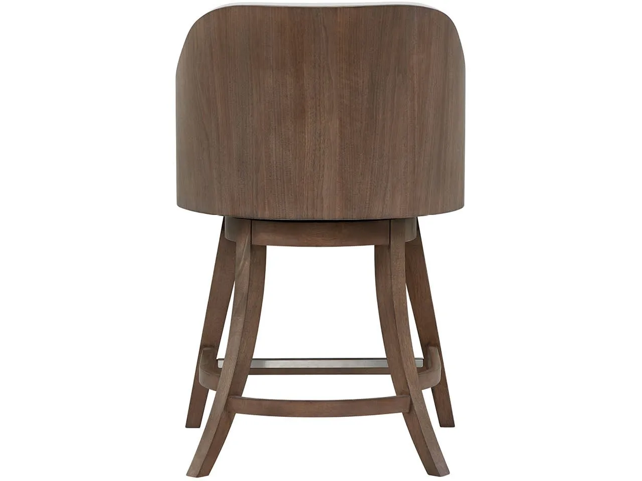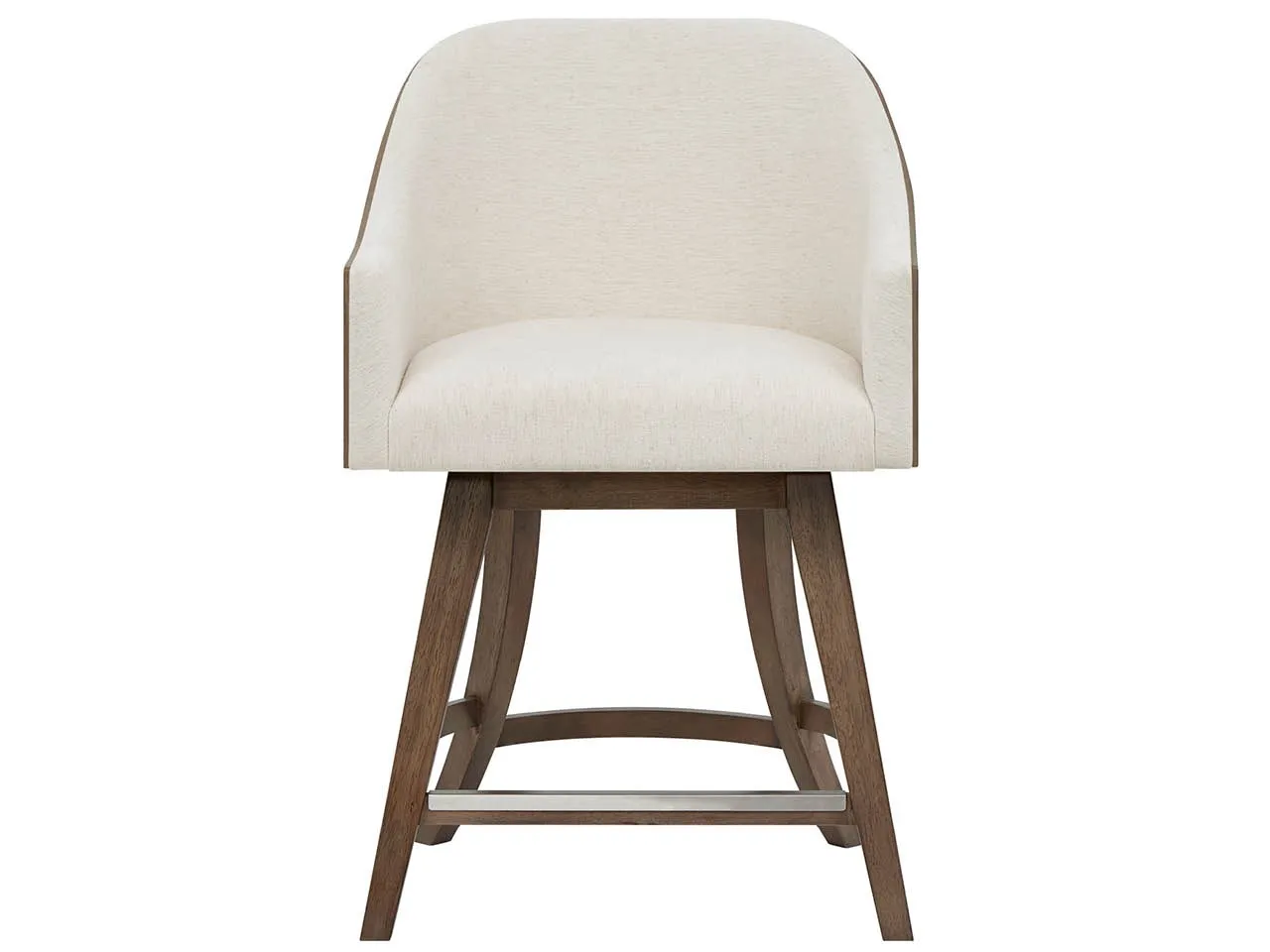 The Haze Swivel Counter Chair features a sculpted wood frame in rich Haze Walnut with an upholstered seat and back in soft Levi Oyster fabric. This chair provides functional movement and elegant comfort for high-top dining or counter seating.