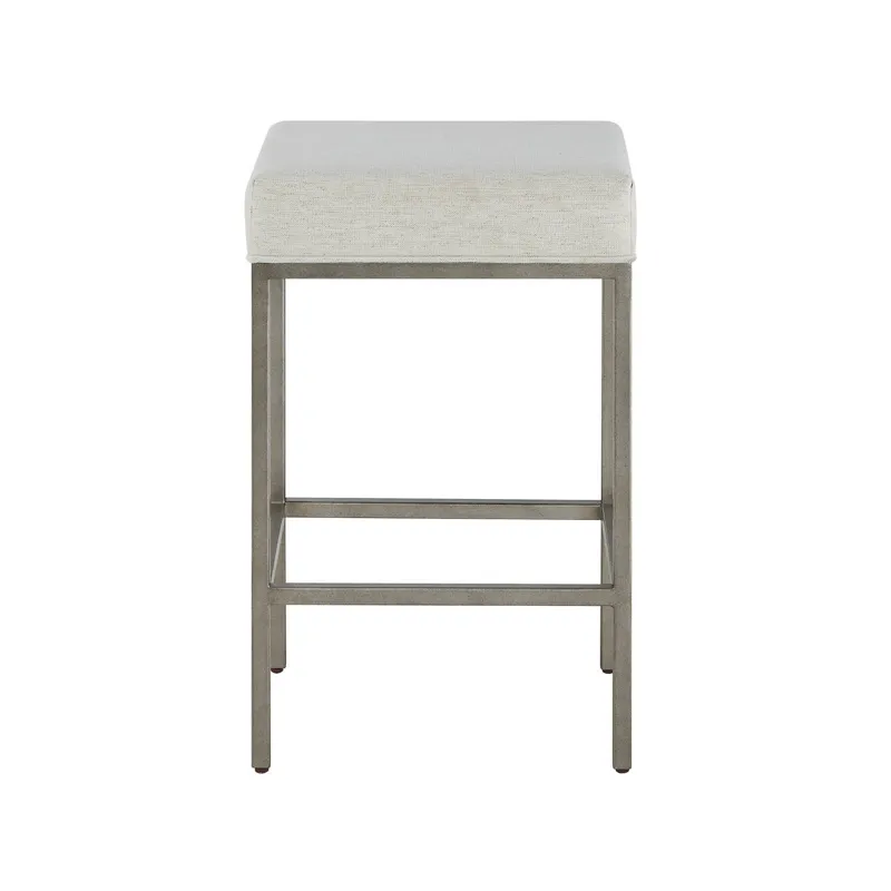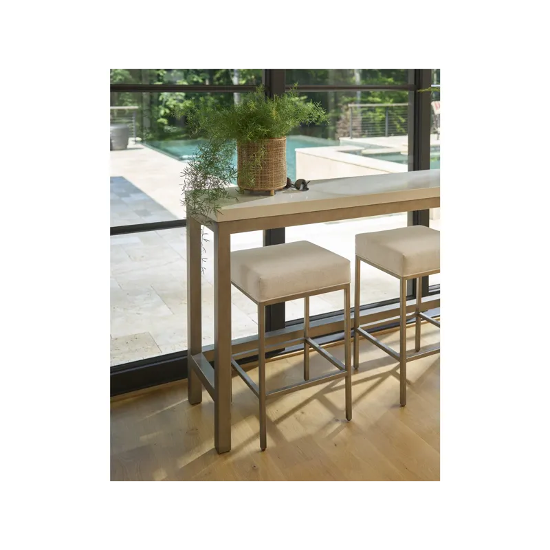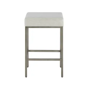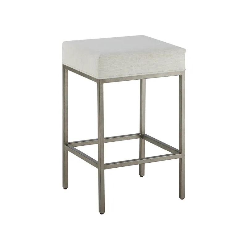The Oasis Stool, upholstered in Nomad Snow fabric and 26-inches in height, create a perfect spot for dining, working, or entertaining in your coastal home.
