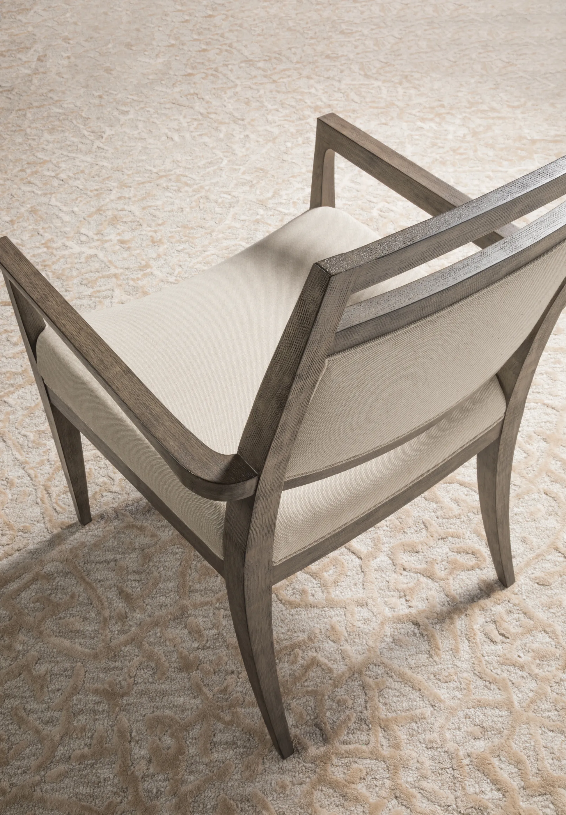 Mid-Century design in mahogany and select hardwoods. Available in standard fabric 153671, a linen and cotton blend with a soft hand in a natural greige coloration. The Grigio finish is a warm gray tone with wire brushing.