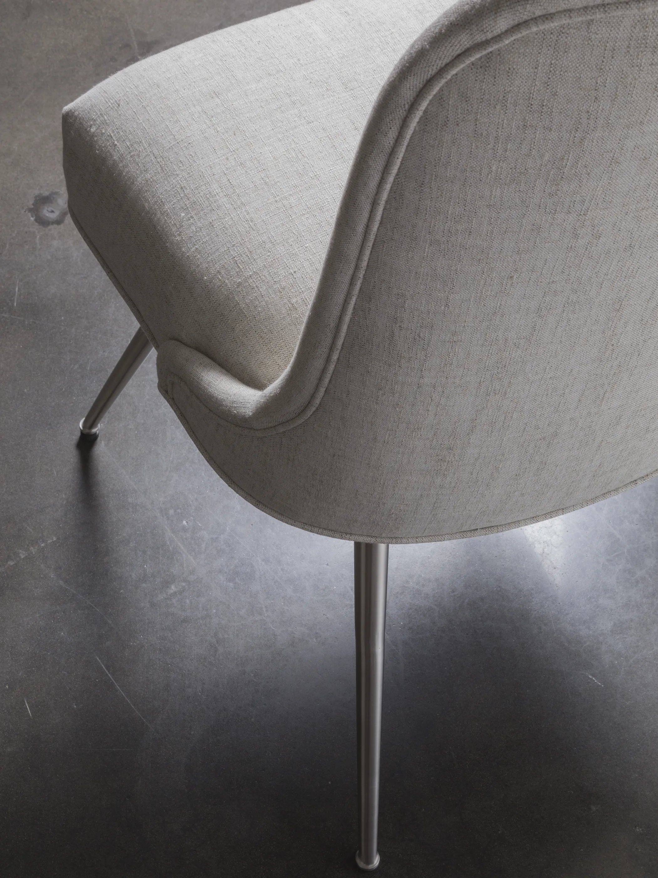 Mid-century modern designs standing on tapered brushed stainless steel legs. Available in your choice of fabric, leather, or combination.