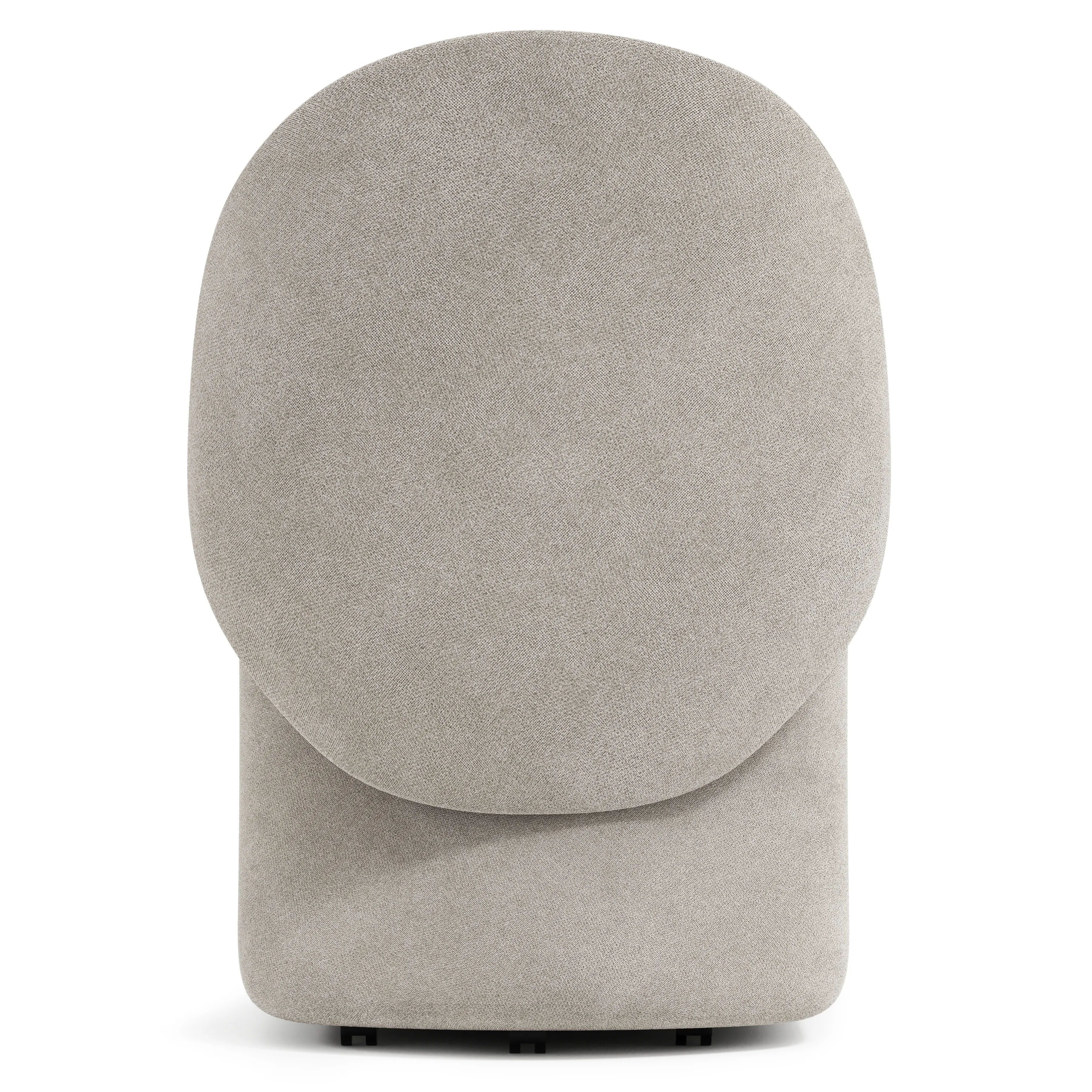A rounded and curved back panel makes a bold statement on the Monolith side chair. It appears to float as it nests gently against the shaped and upholstered base. Hidden casters provide a smooth movement to and from the table.