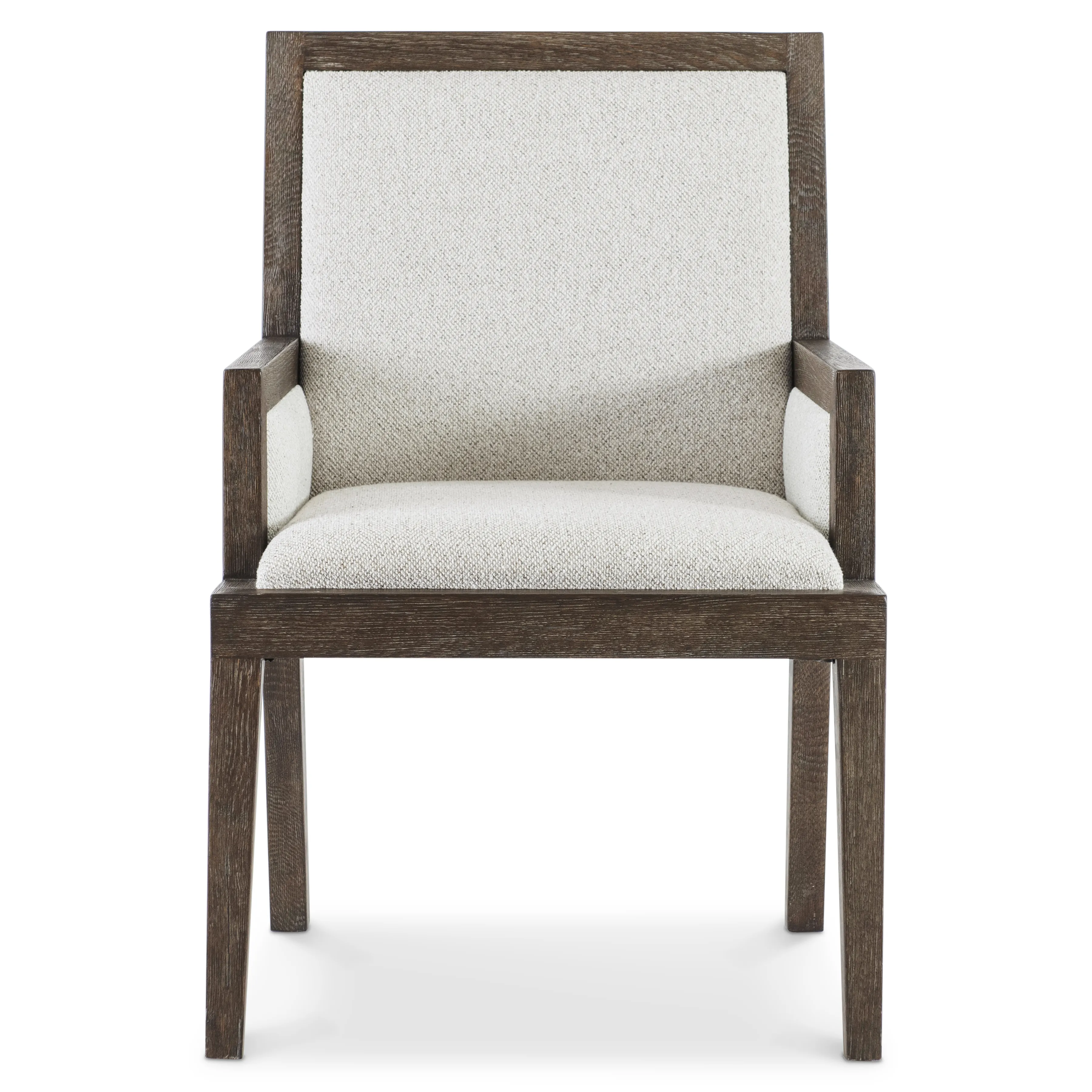 Wirebrushed Oak Arm Chair in Cassel finish. Upholstered Inback, Outback, Seat and Inset Panel on Arms. Tack glides. Performance Fabric: B164