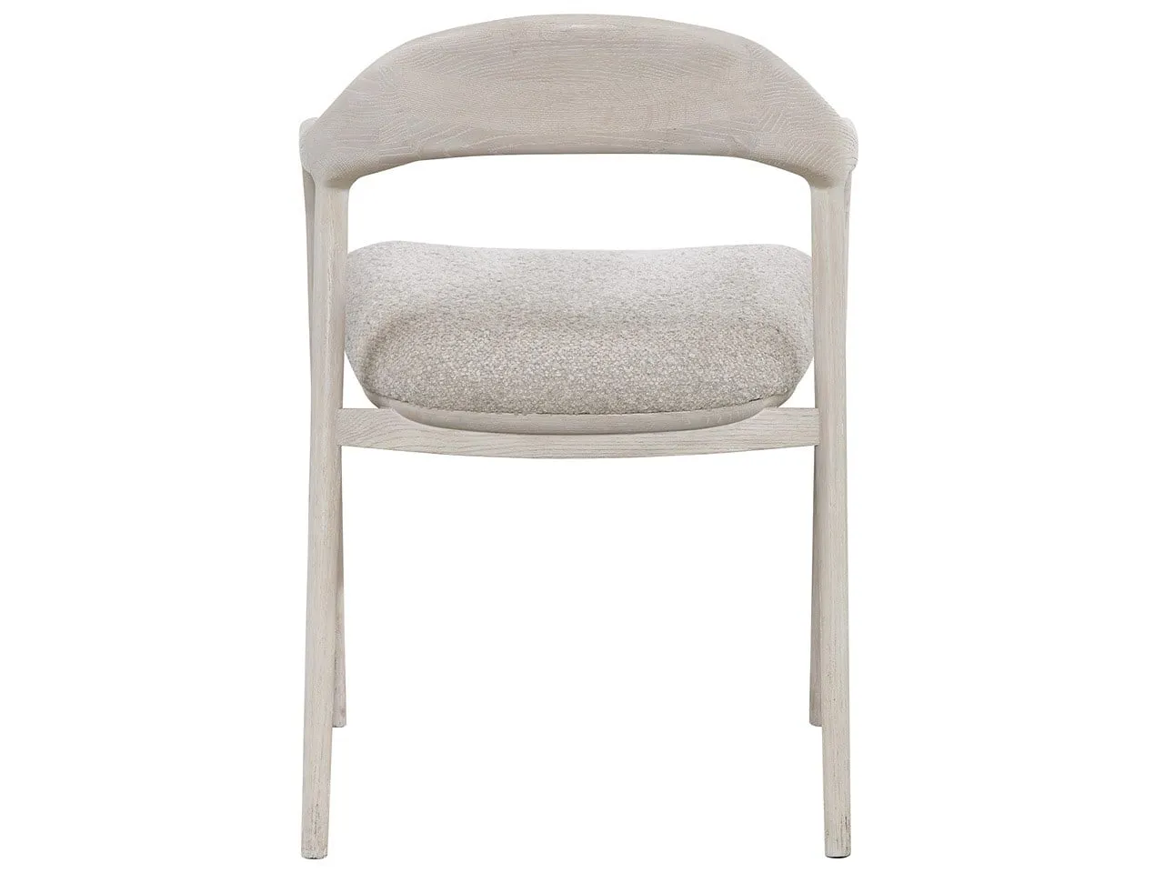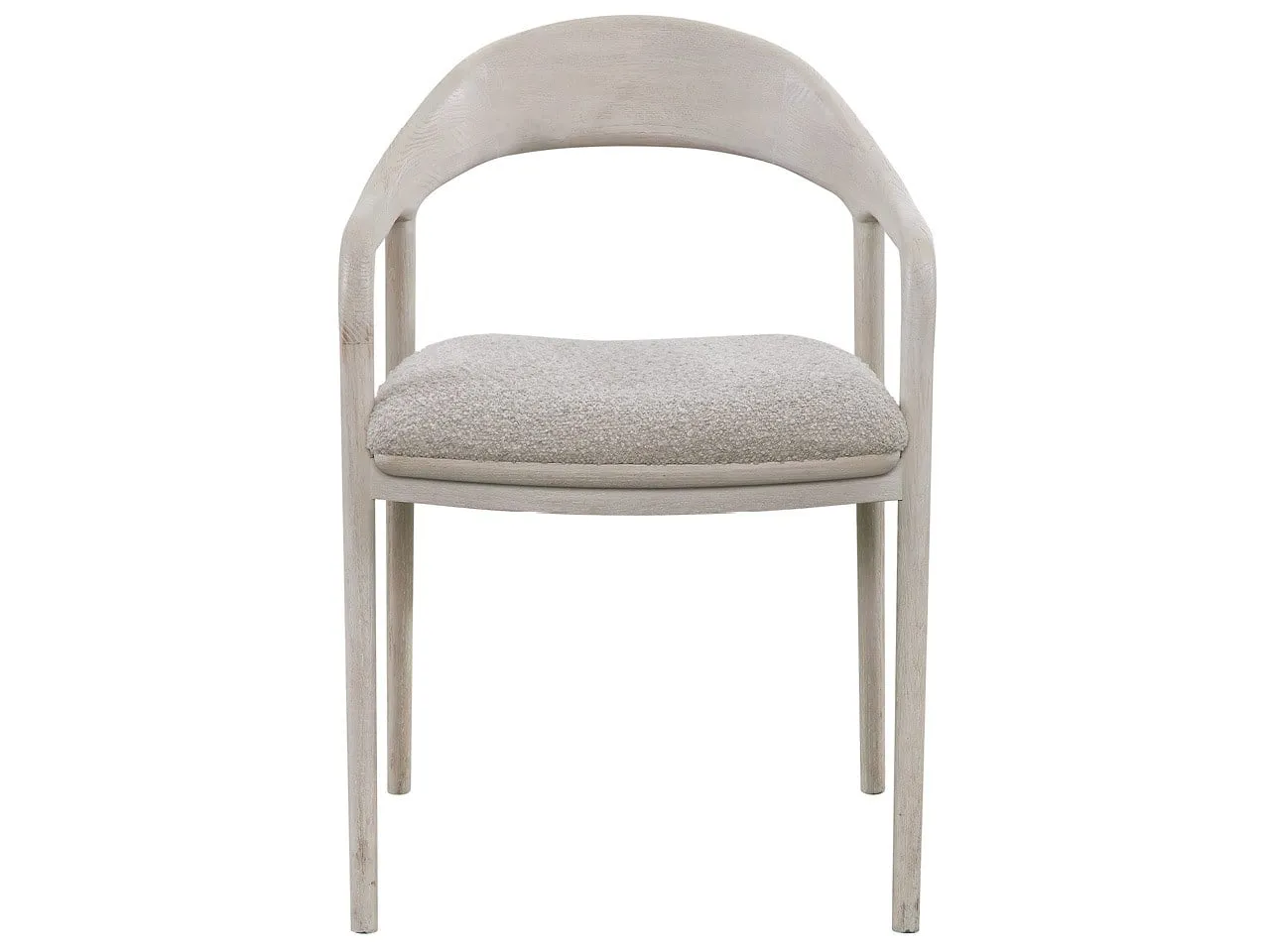 The Echo Dining Arm Chair, available in several finishes and upholstered in the refined Medina Pebble fabric, encapsulates elegance with its rounded, open-air back design. Its lithe, straight legs and gently curved back exude a sleek, streamlined form, imparting an aura of sophisticated airiness to the modern dining ensemble.