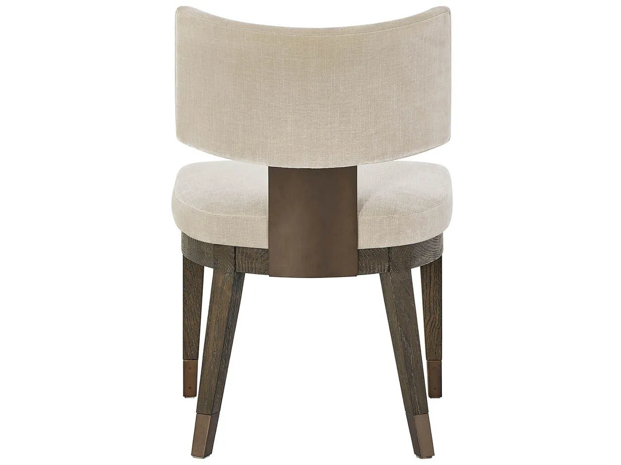 The Cocoa Side Chair features classical Klismos-inspired design with splayed legs and Smoked Gold metal ferrules. Upholstered back and seat in soft Silken Fog fabric create comfortable dining seating that works beautifully with coordinating tables.