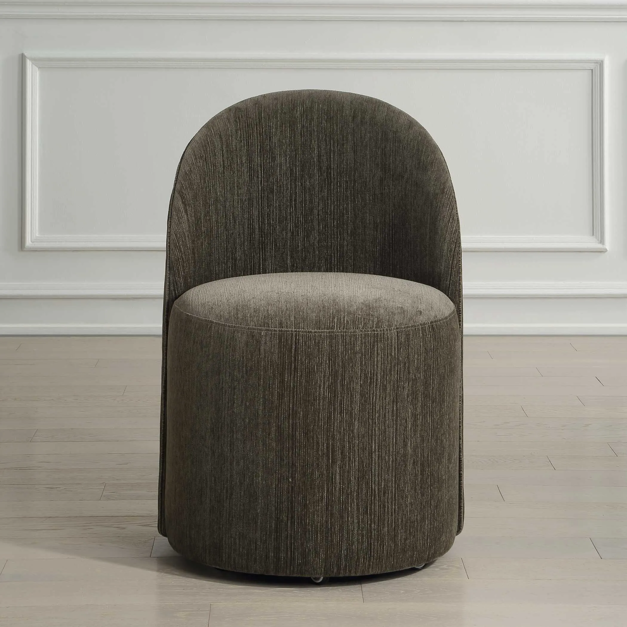 Inspired From Classic Vanity Seating But Proportioned For Dining, The Roll With It Chair Features Rolling Casters For Ease Of Use. Its Smooth Lines Are Fully Upholstered In A Rich Textured Chenille In Herb.
