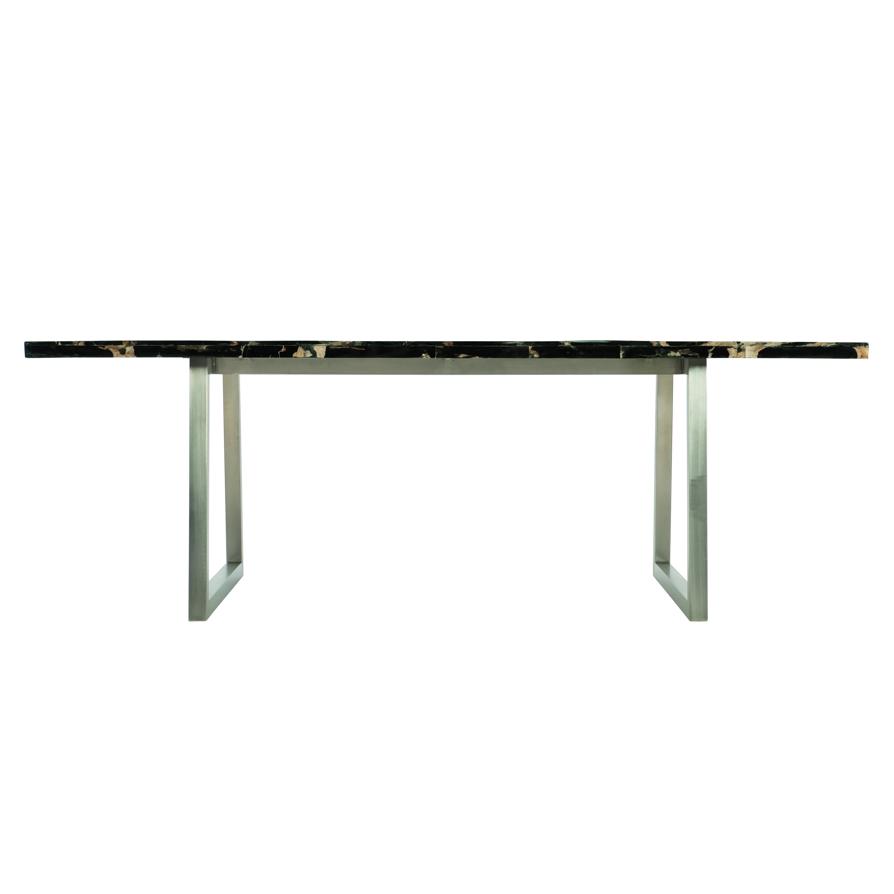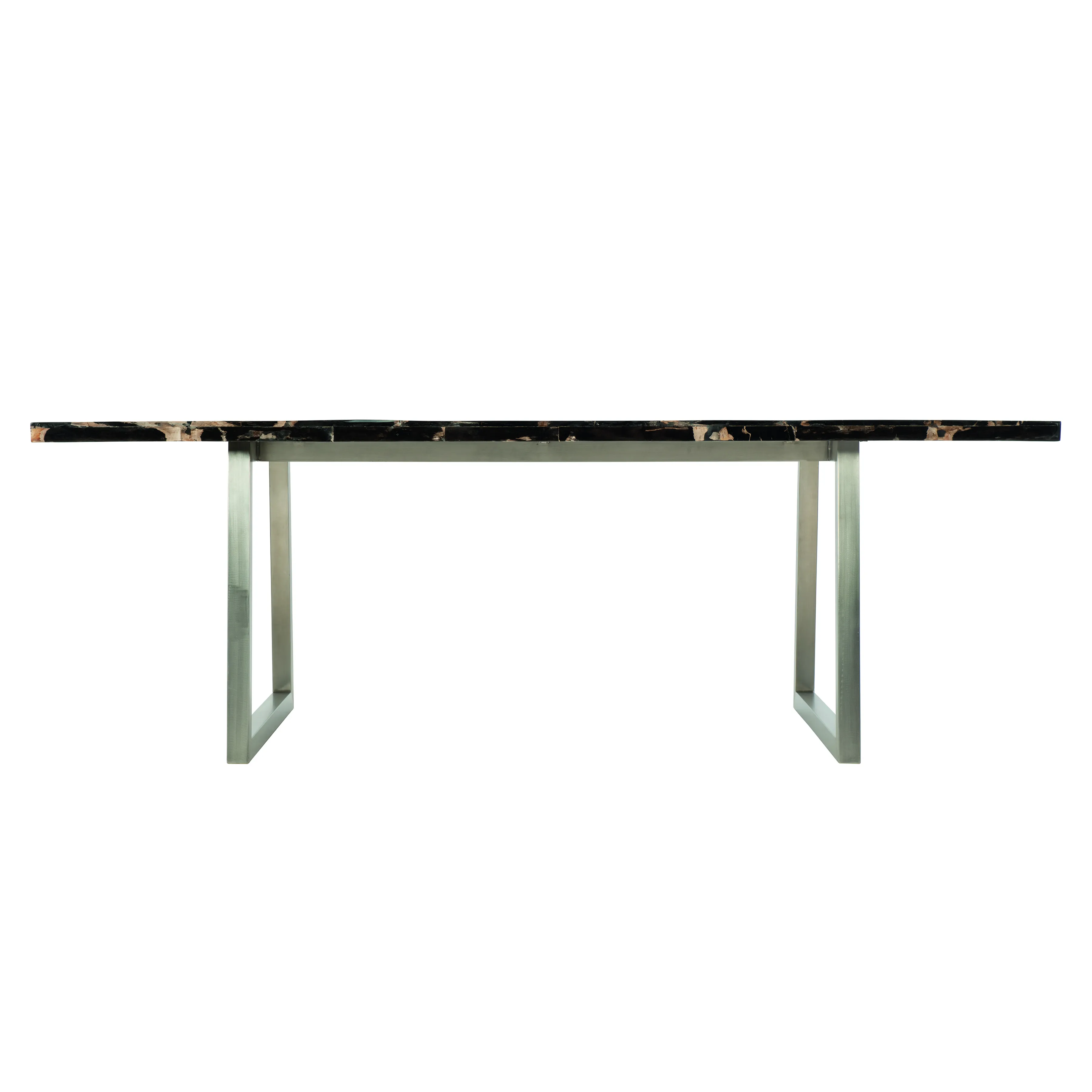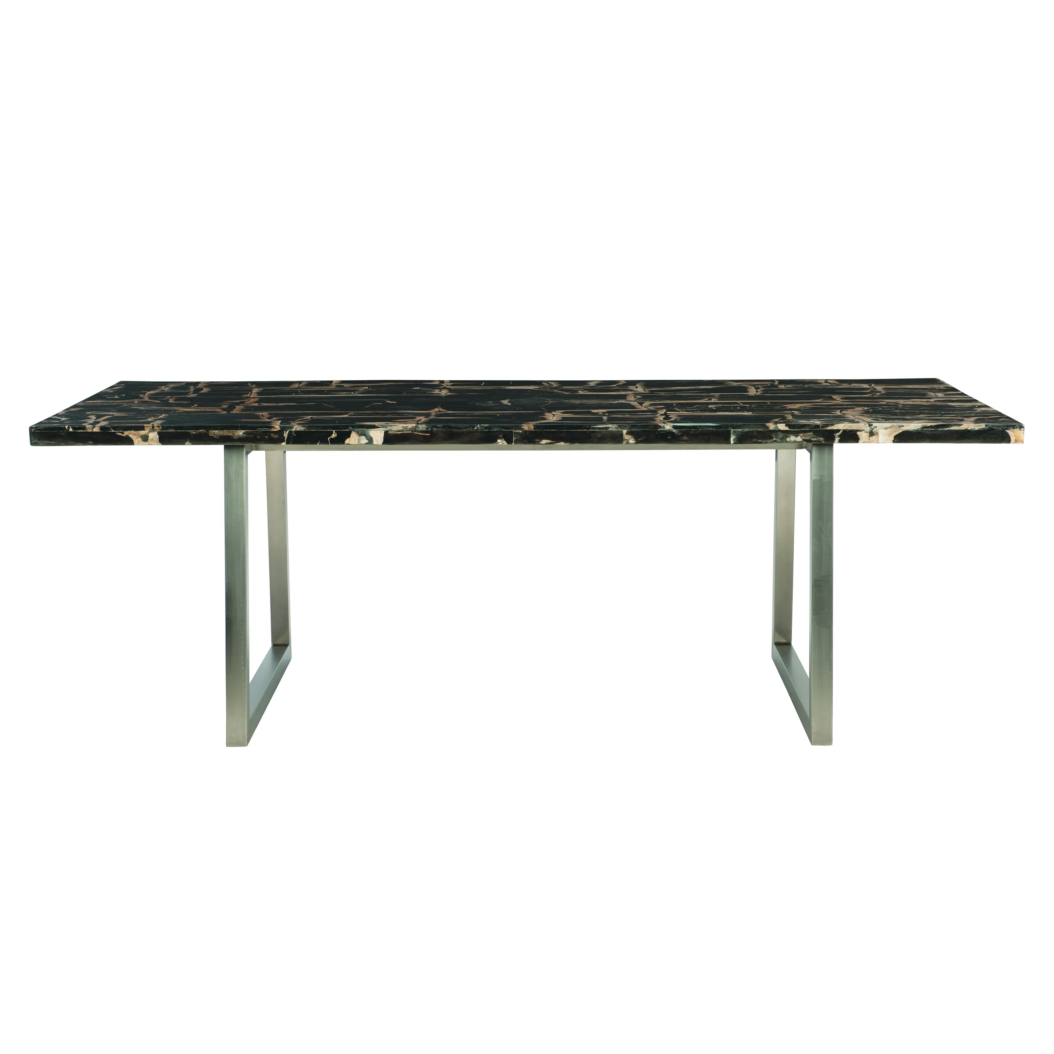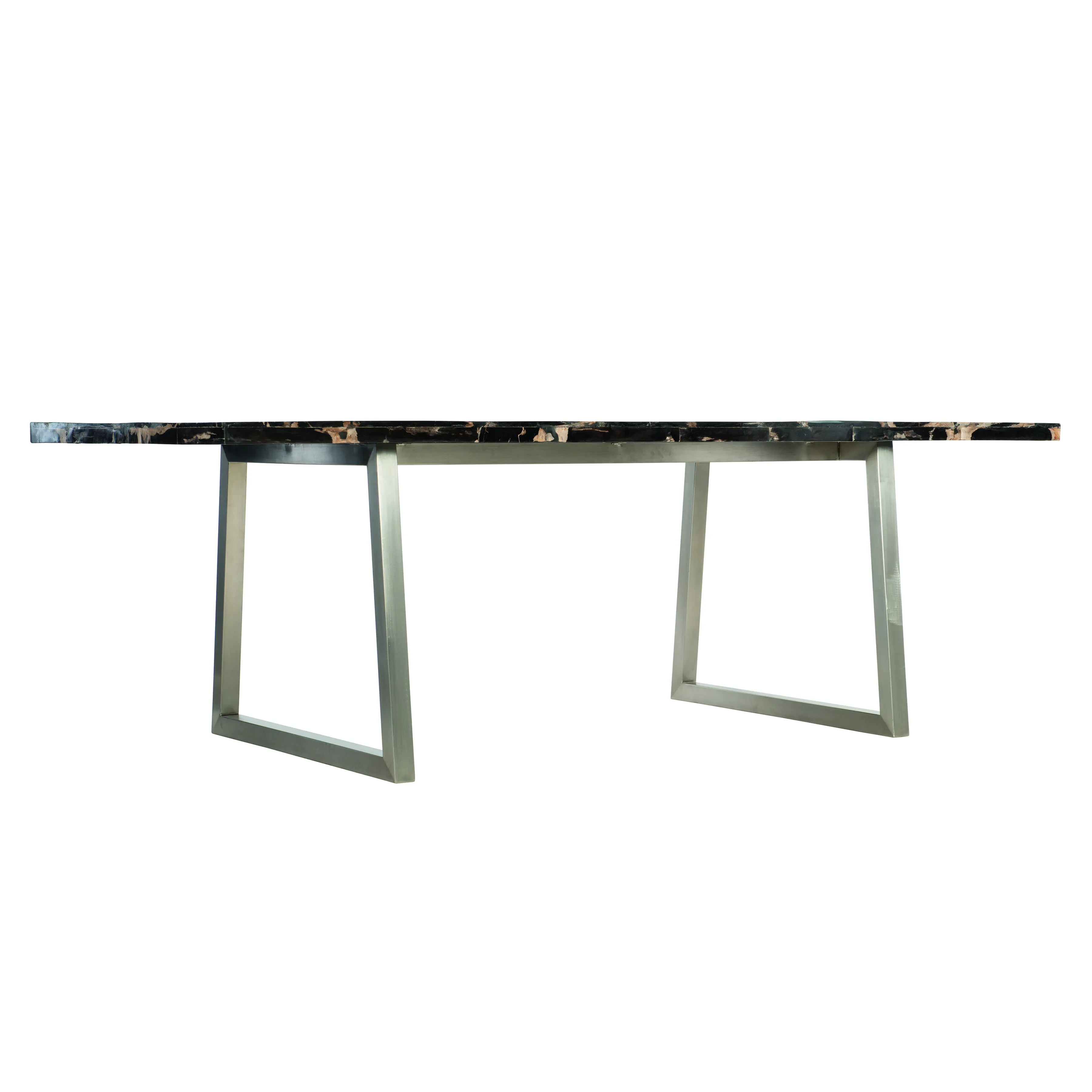 Simple yet breathtaking, the Pierre Noire dining table combines organic and modern materials to set an elegant tone. The rectangular top is crafted from sliced black petrified wood for an alluring, natural look. Hand-selected from an area with ancient volcanic activity, the fossilized wood is rich with texture and dramatic color. A trapezoidal polished stainless steel base lends a minimalist feel to this luxe statement piece.