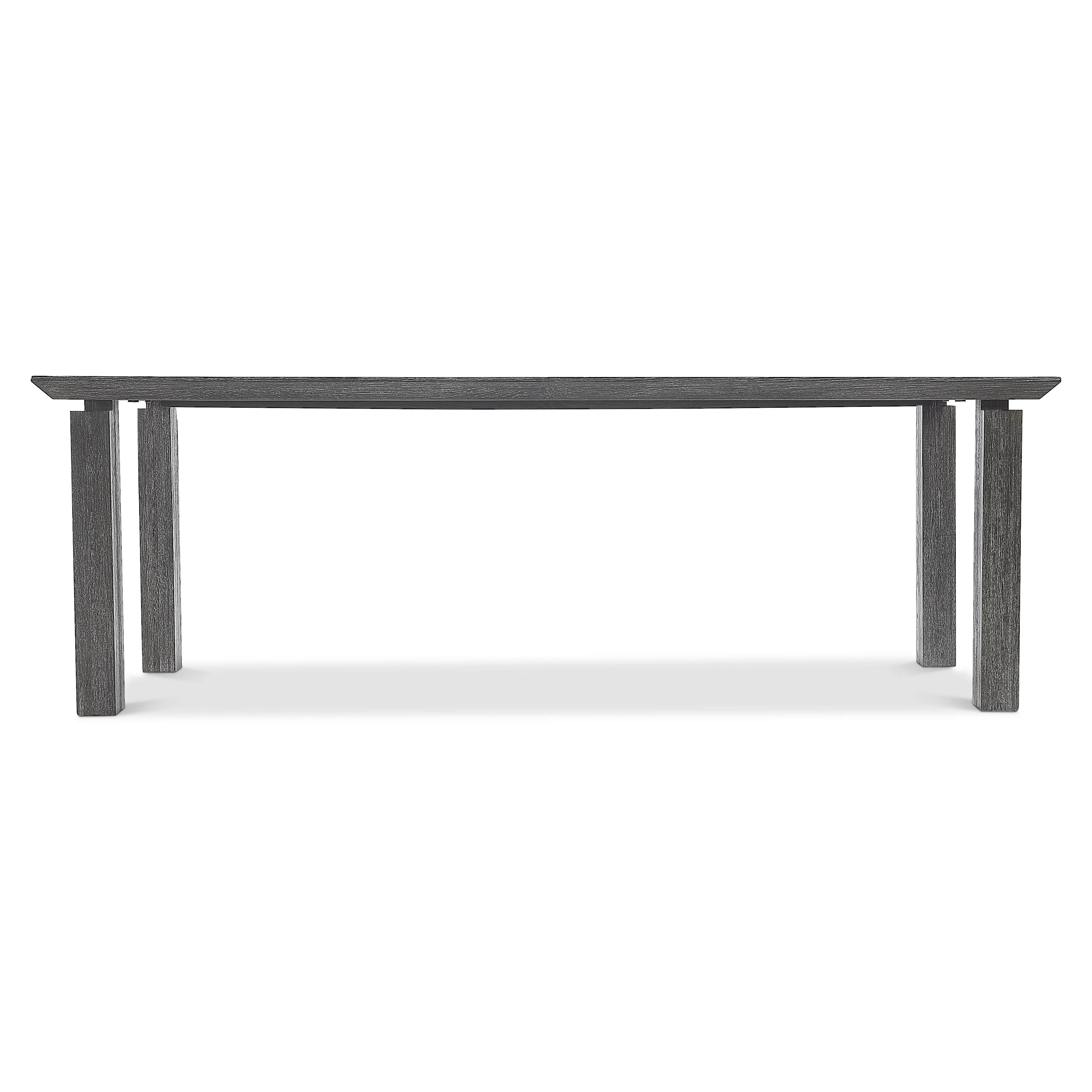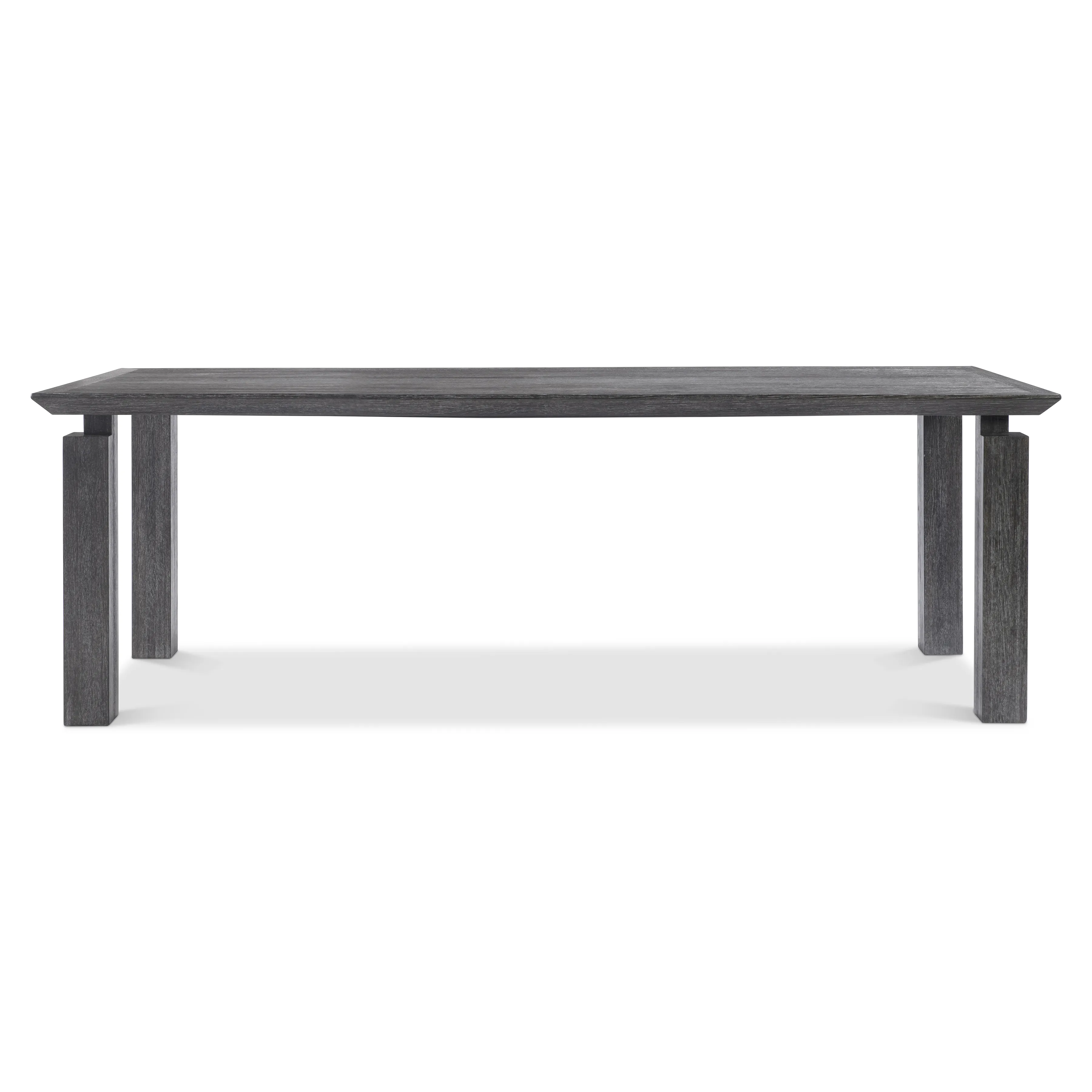 Modern architecture is the inspiration behind the bold design of the Menton dining table. The sleek beveled top appears to float above bold structural legs that anchor each corner. The beautiful woodgrain is highlighted by the deeply stunning Sutton finish.