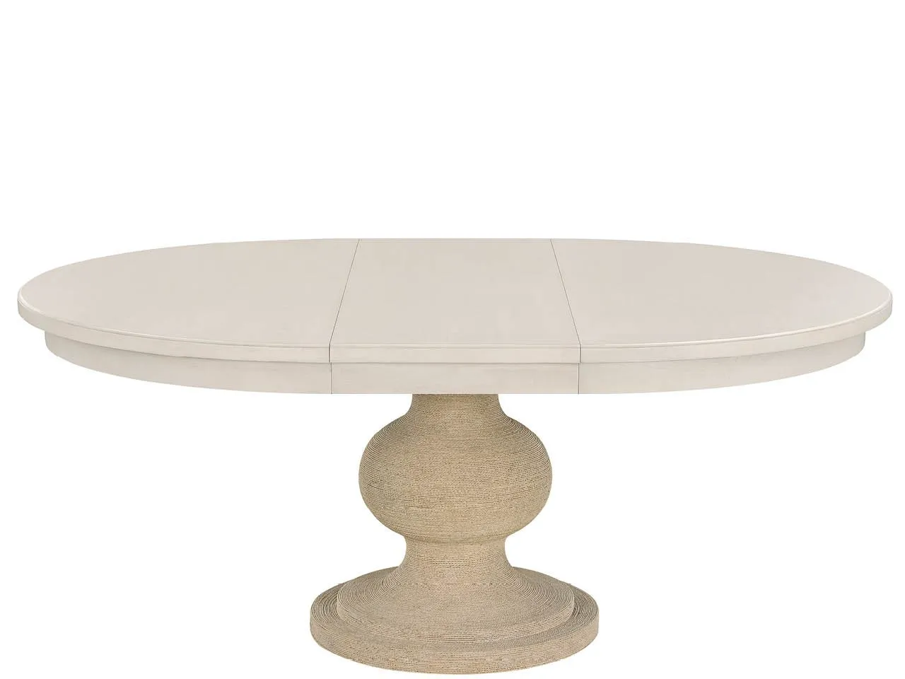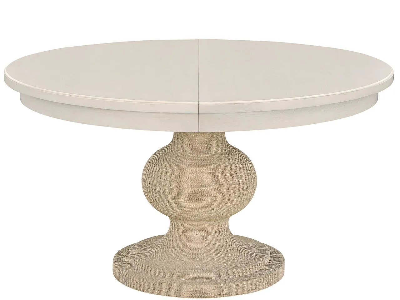 The Willow Wrapped Dining Table introduces an element of serene elegance, pairing its light Willow top with an expertly hand-wrapped Twisted Abaca base. This design is practical for hosting, including a self-storing 18" leaf that easily transforms the table from a comfortable round to an oval.