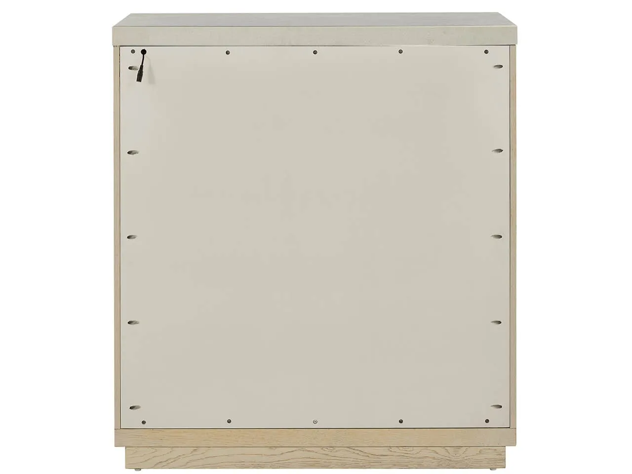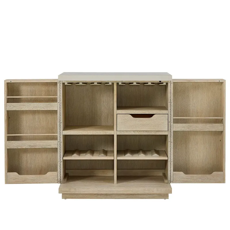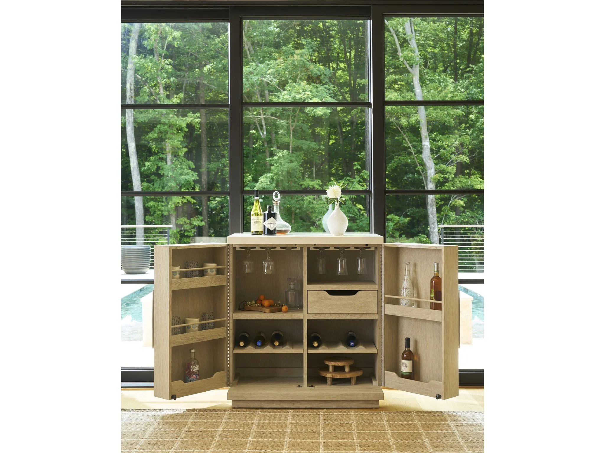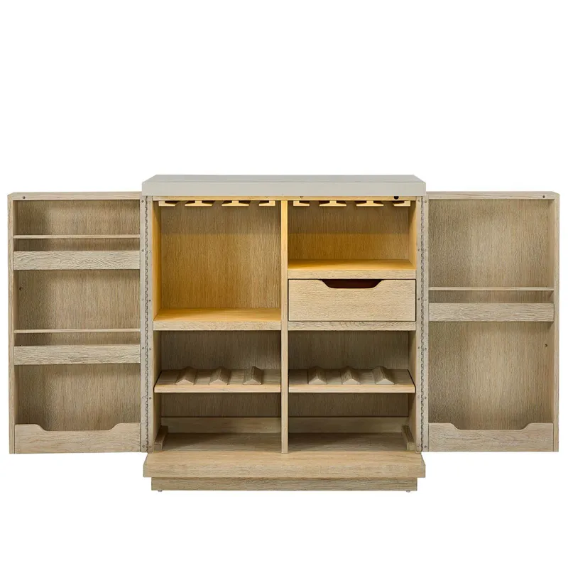 The Dockside Bar Cabinet is crafted in sandblasted oak with a white quartz top. Interior storage with wine bottle dividers and glass racks create the perfect piece for hosting gatherings in your coastal home.