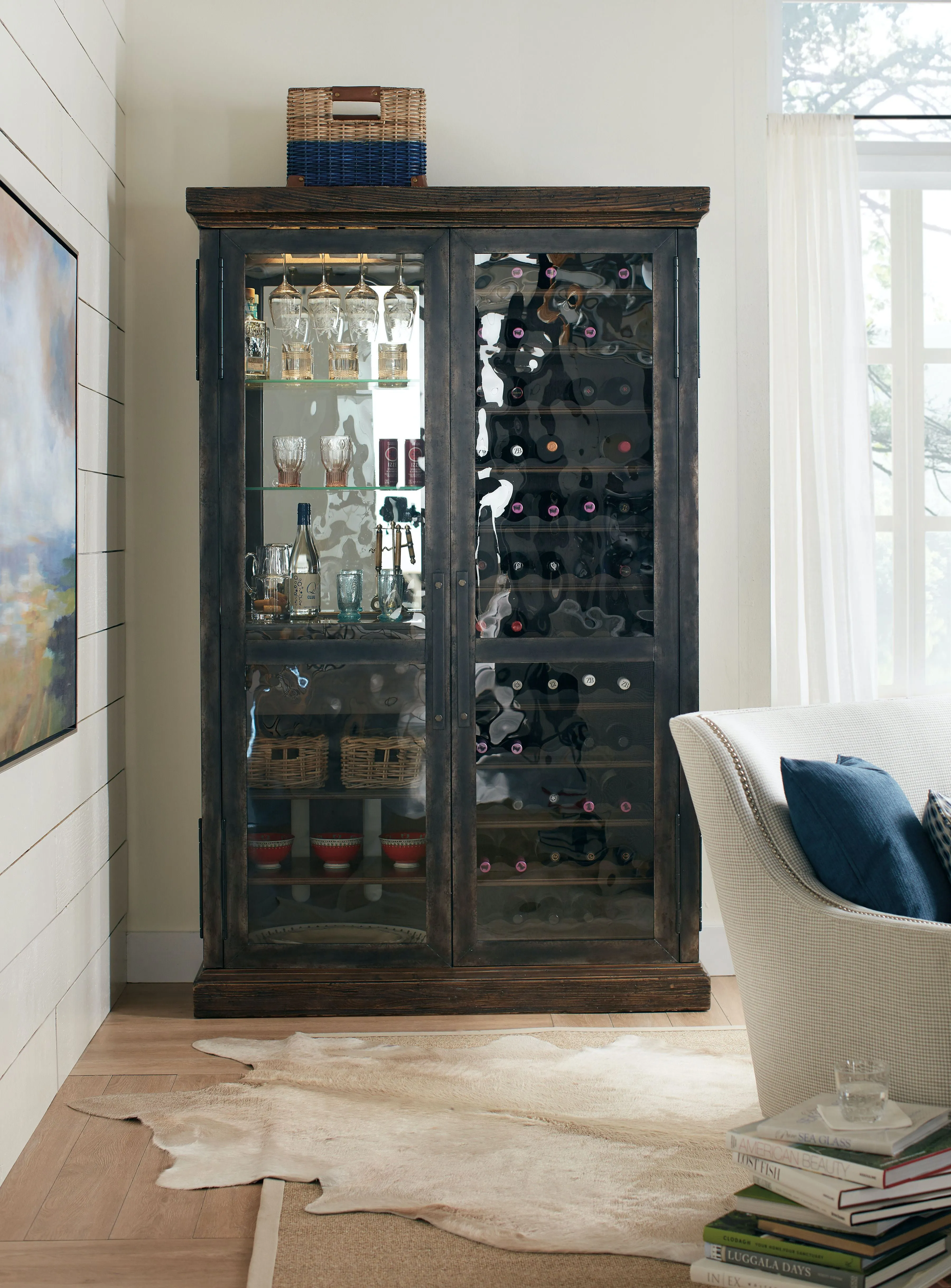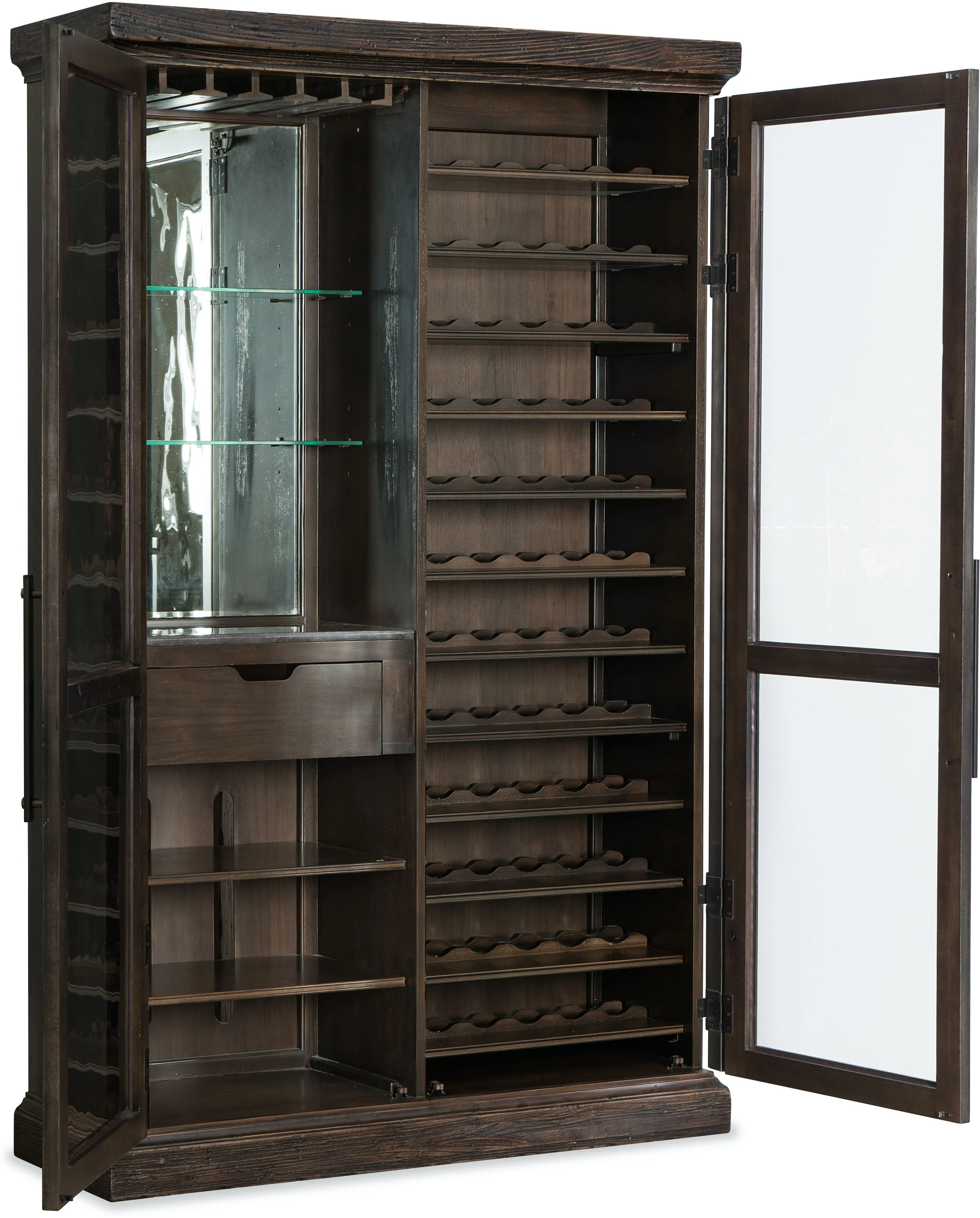 In classic farm-to-decor style, the stunning Roslyn County Wine Cabinet combines metal-wrapped wood-framed seeded glass doors and a Dark Walnut finish to evoke timber frame trusses in reclaimed barns. With authenticity and simplicity, this piece offers rustic chic style and functionality. There is storage for up to 60 wine bottles, with 10 adjustable/reversible wine shelves behind the right door, and each shelf having the capacity to hold 6 wine bottles. In addition, there is a wine glass rack on the left side, a pebble-stone work surface and an LED light strip. Anti-tip hardware is included.