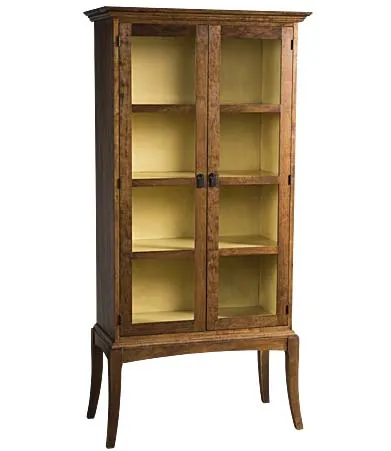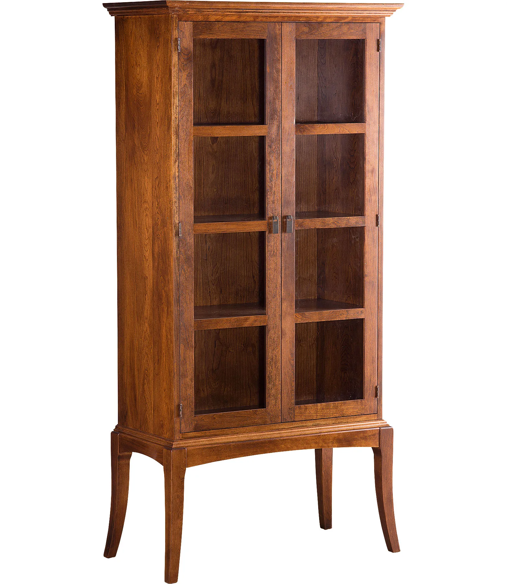 Built atop a subtle saber leg base, the Sabin Bookcase with Glass Doors is an elegant display case. We love to paint the interior of this piece for even more fun. Made with local and sustainably harvested solid Appalachian hardwood. Board-by-board lumber selection process captures the beauty of the wood. Built-to-order by a craftsperson who signs and dates the piece. Catalyzed lacquer top coat forms a clear, efficient, highly-protective barrier with a close-to-the-wood feel. More Information Doors swing easy on butt hinges with positive-close roller catches. Three fixed shelves behind doors, Contrasting finish of cabinet interior offered as custom option, Standard hardware: Gilcrest Pendants in Satin Brass, Polished Nickel, and Burnished