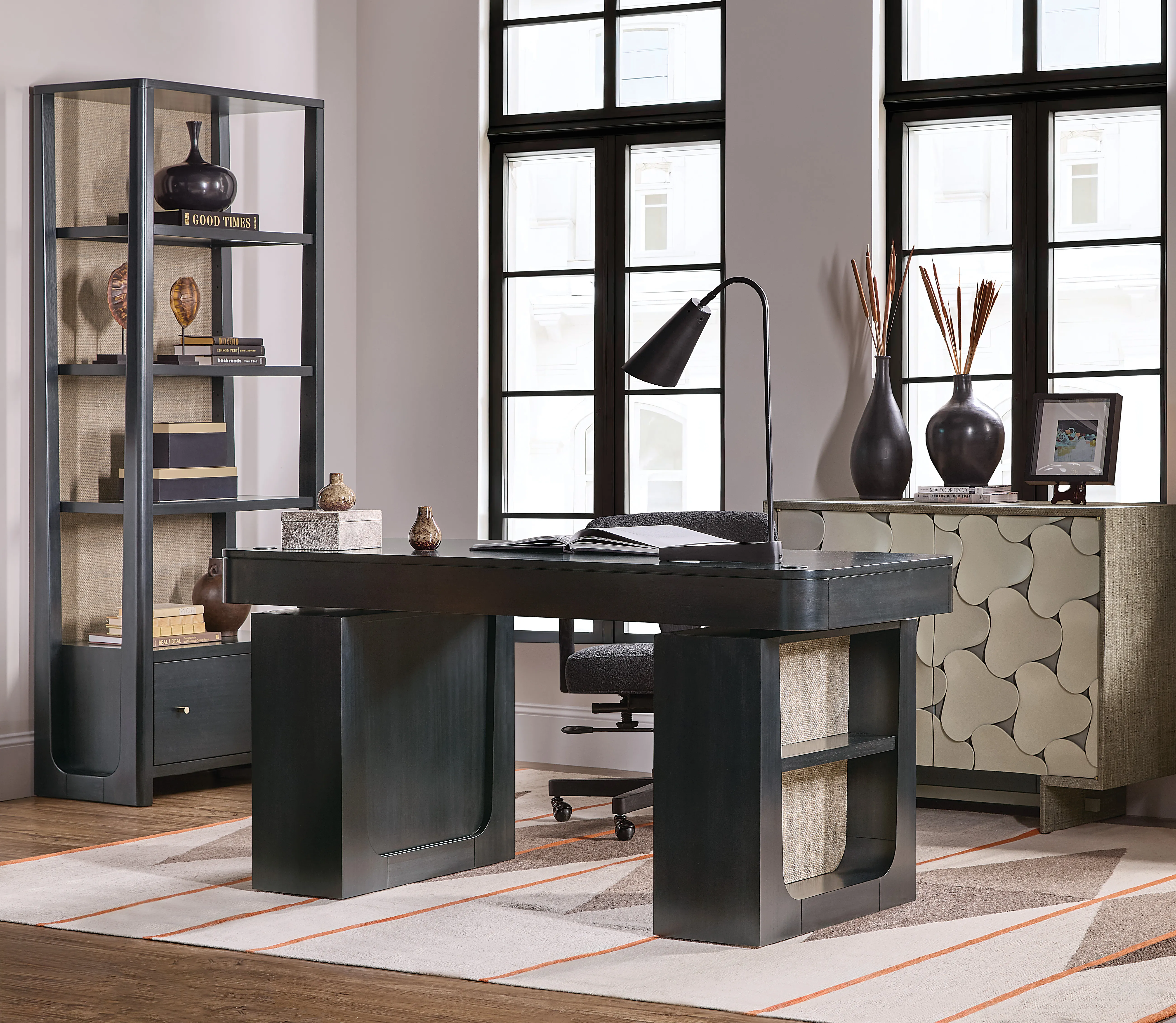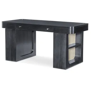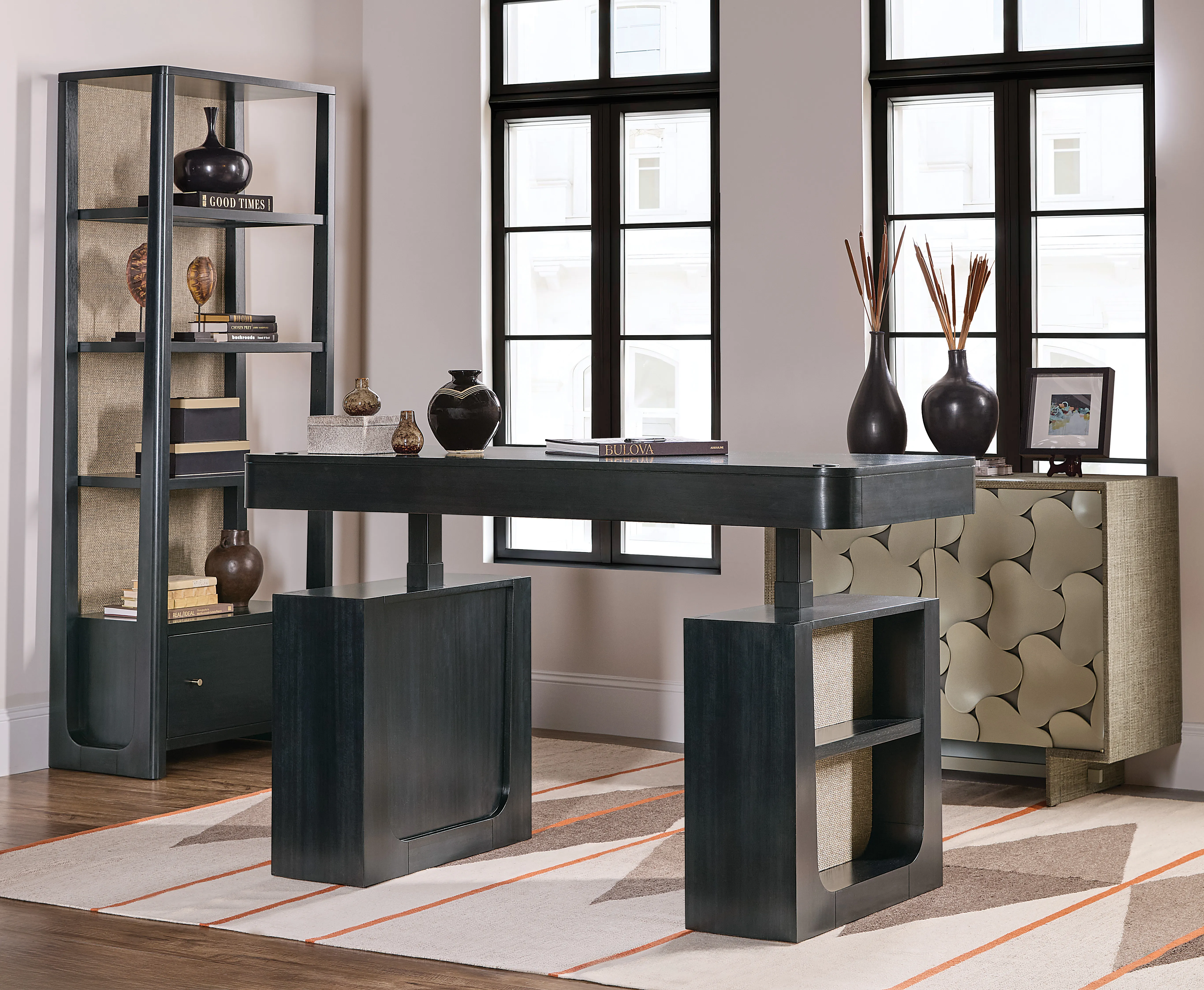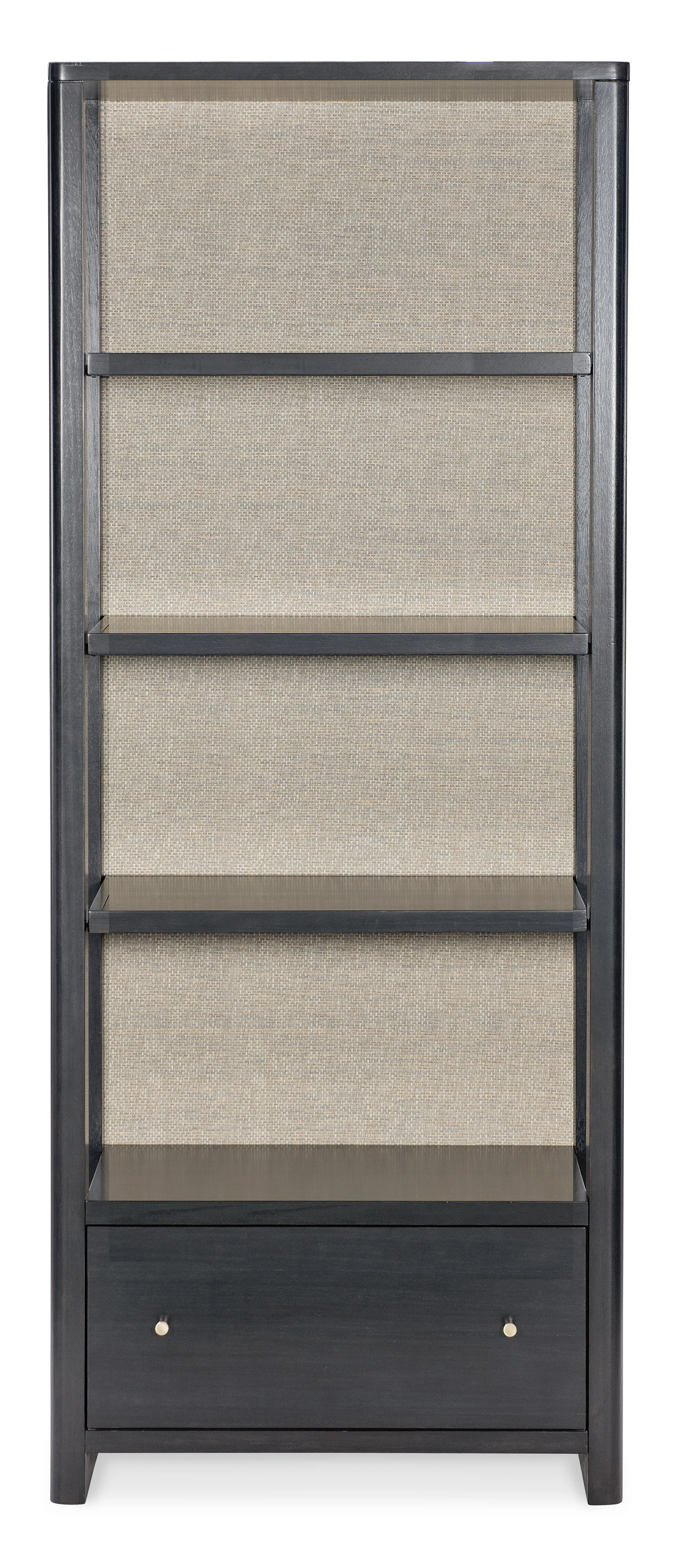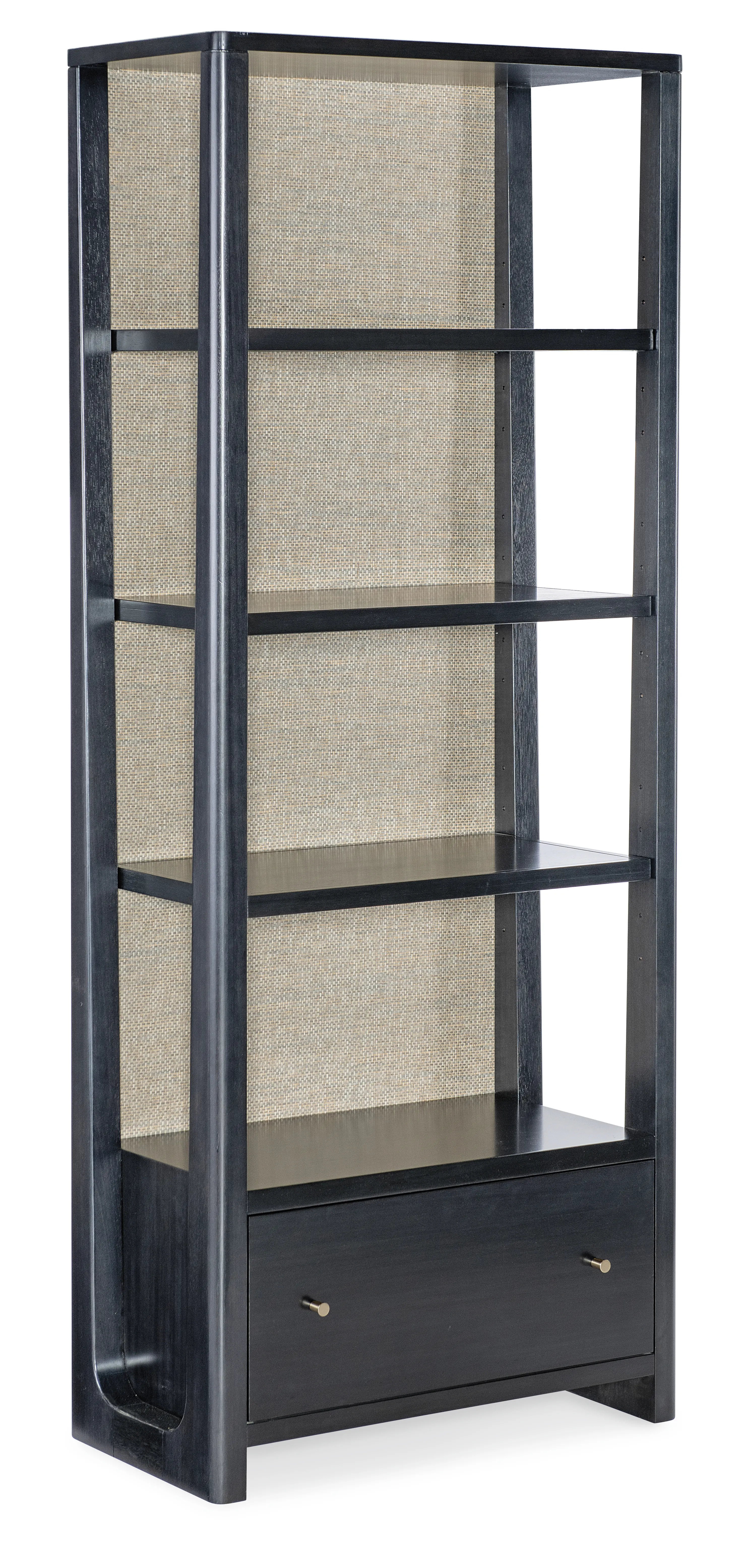 Bring elevated, transitional style to your home office with the Kenzo Bookcase. Crafted with eucalyptus veneers and raffia accents, this black wood bookcase features a luxe grass-cloth back for designer texture and contrast. Three fixed shelves offer curated display space, while a locking file drawer adds secure storage, perfect for a refined office storage cabinet that blends beauty and function.
