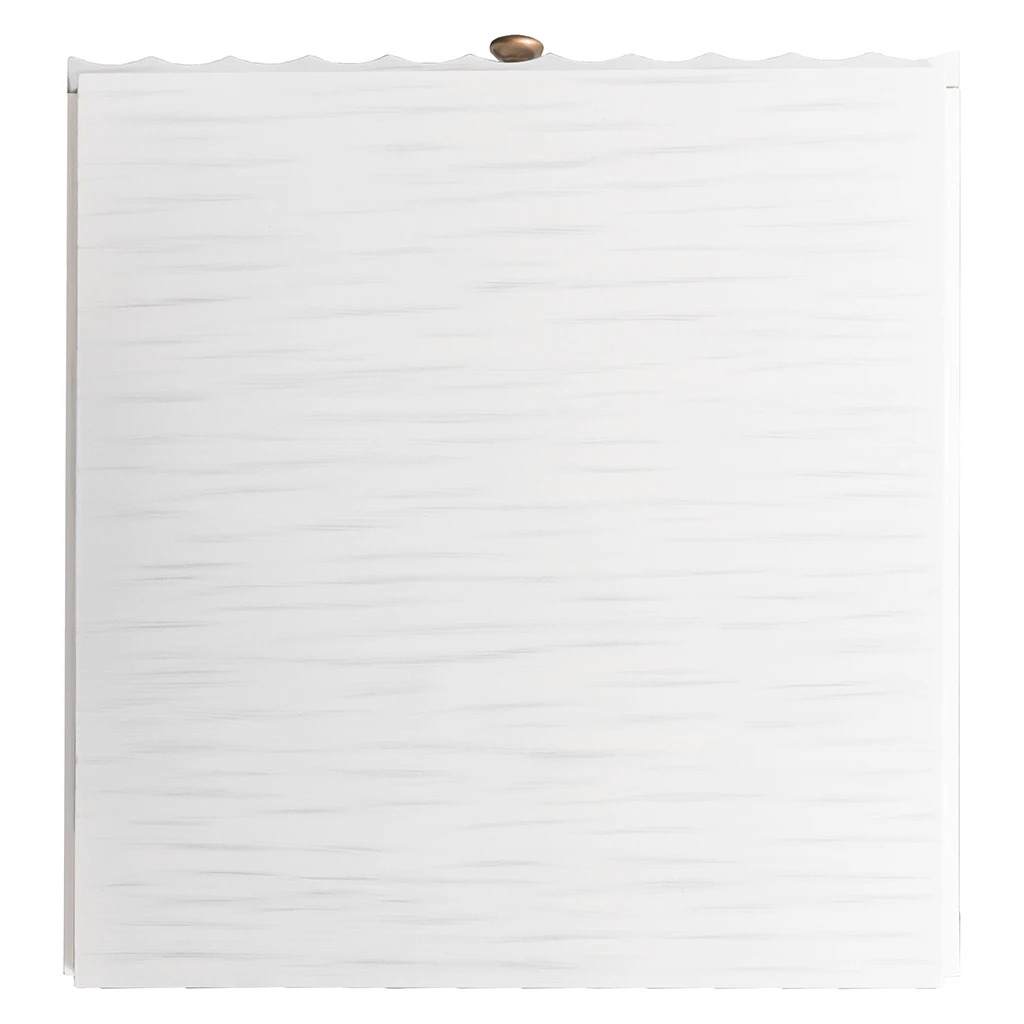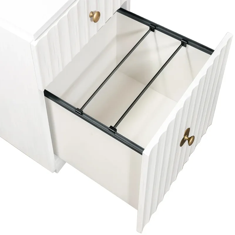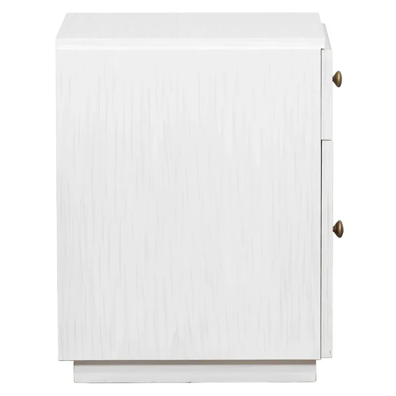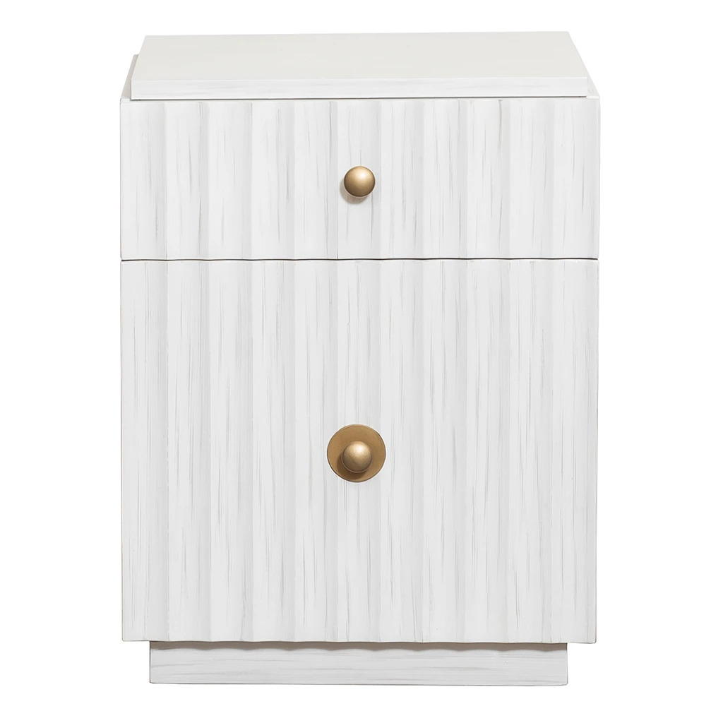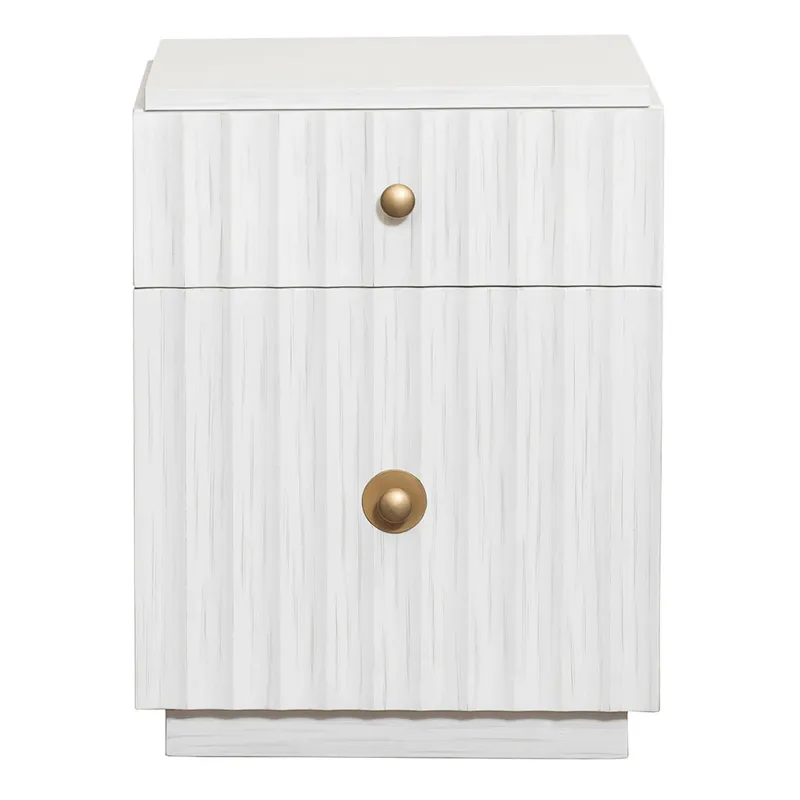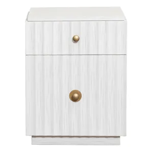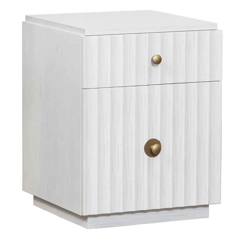 Finished in Pearl with Antique Brass hardware and scallop-carved drawer fronts. Features hidden casters with one standard top drawer and one bottom lateral file drawer with a hidden pencil drawer. Fits under the 8098-81 East Camden Writing Desk.