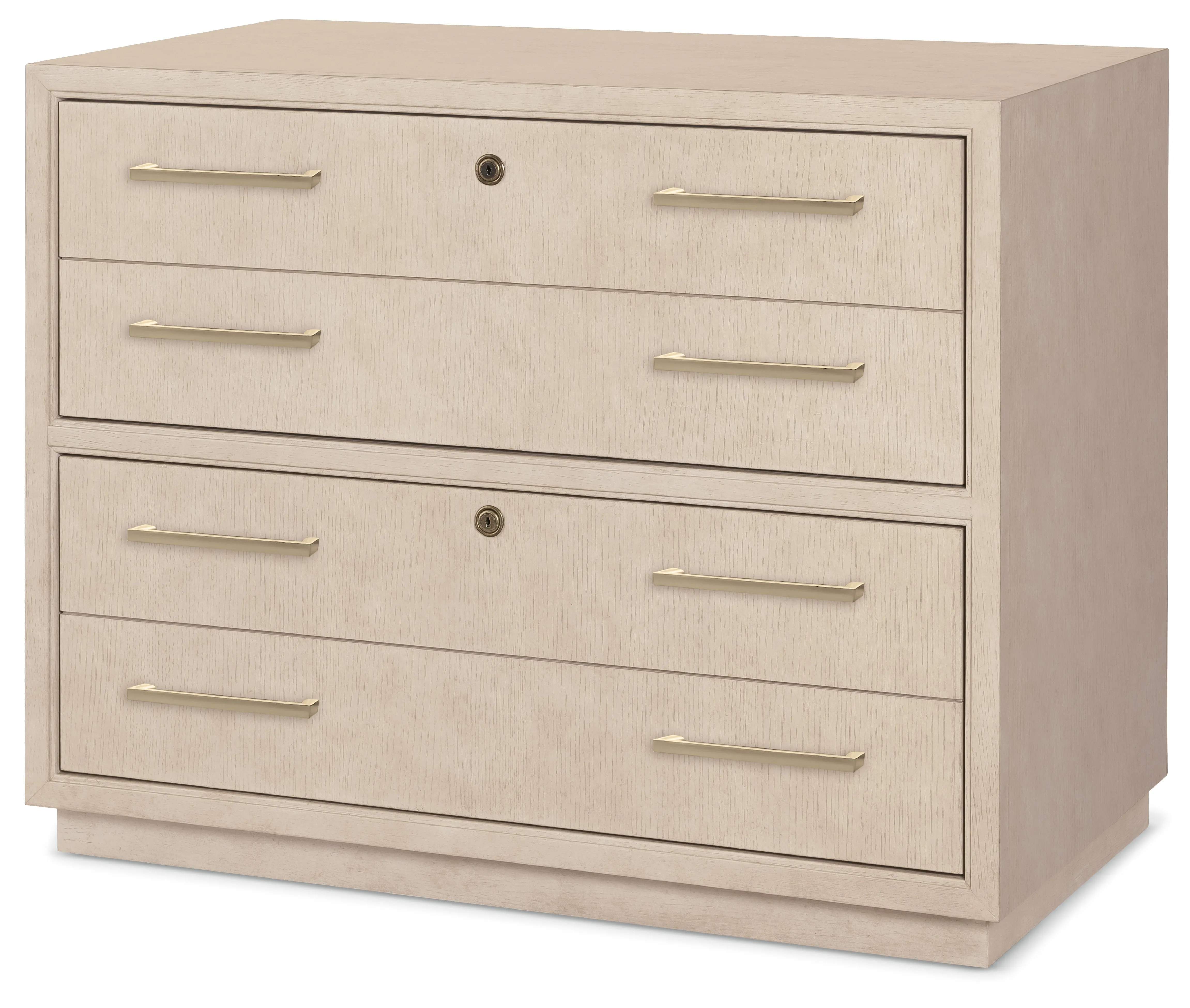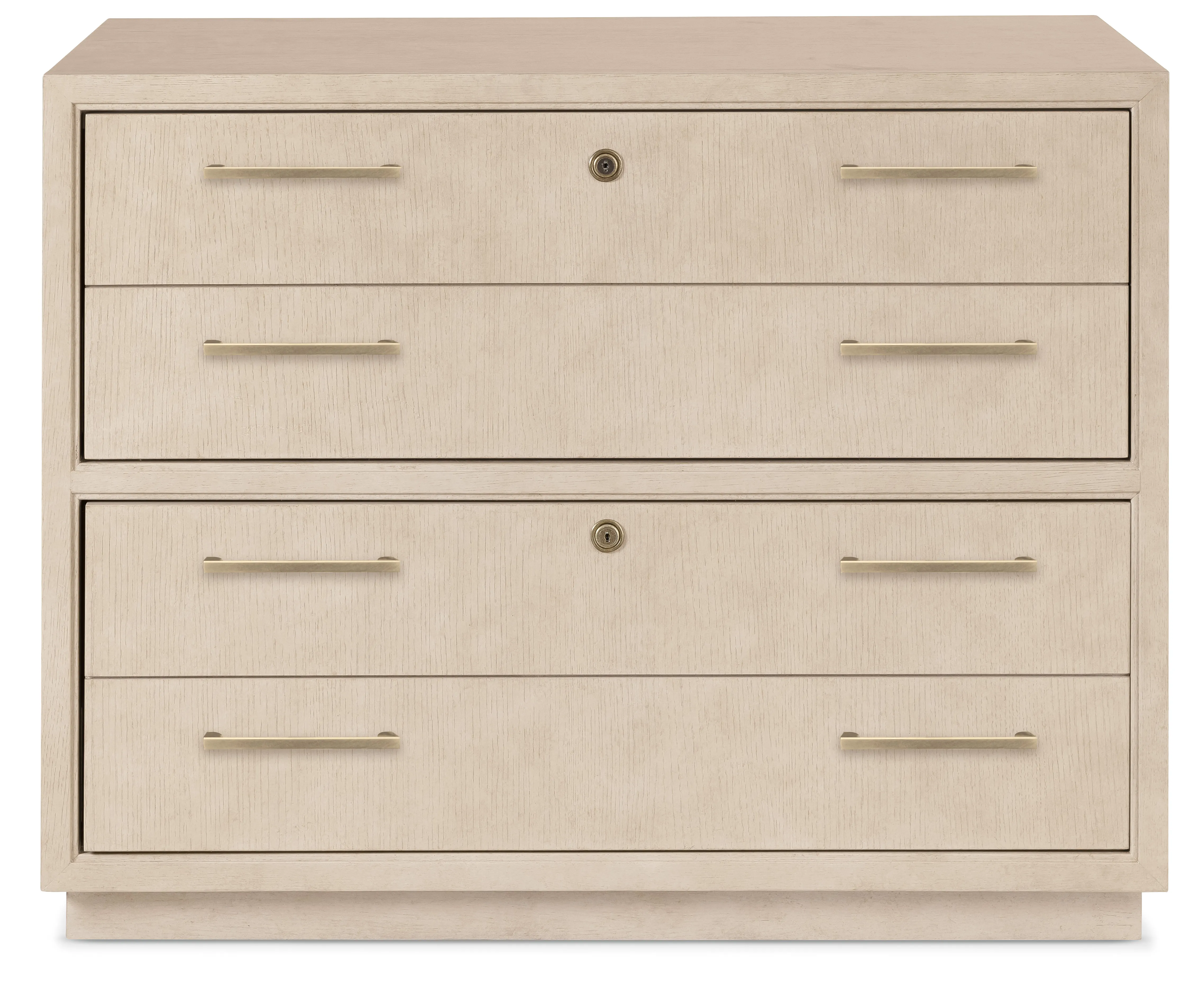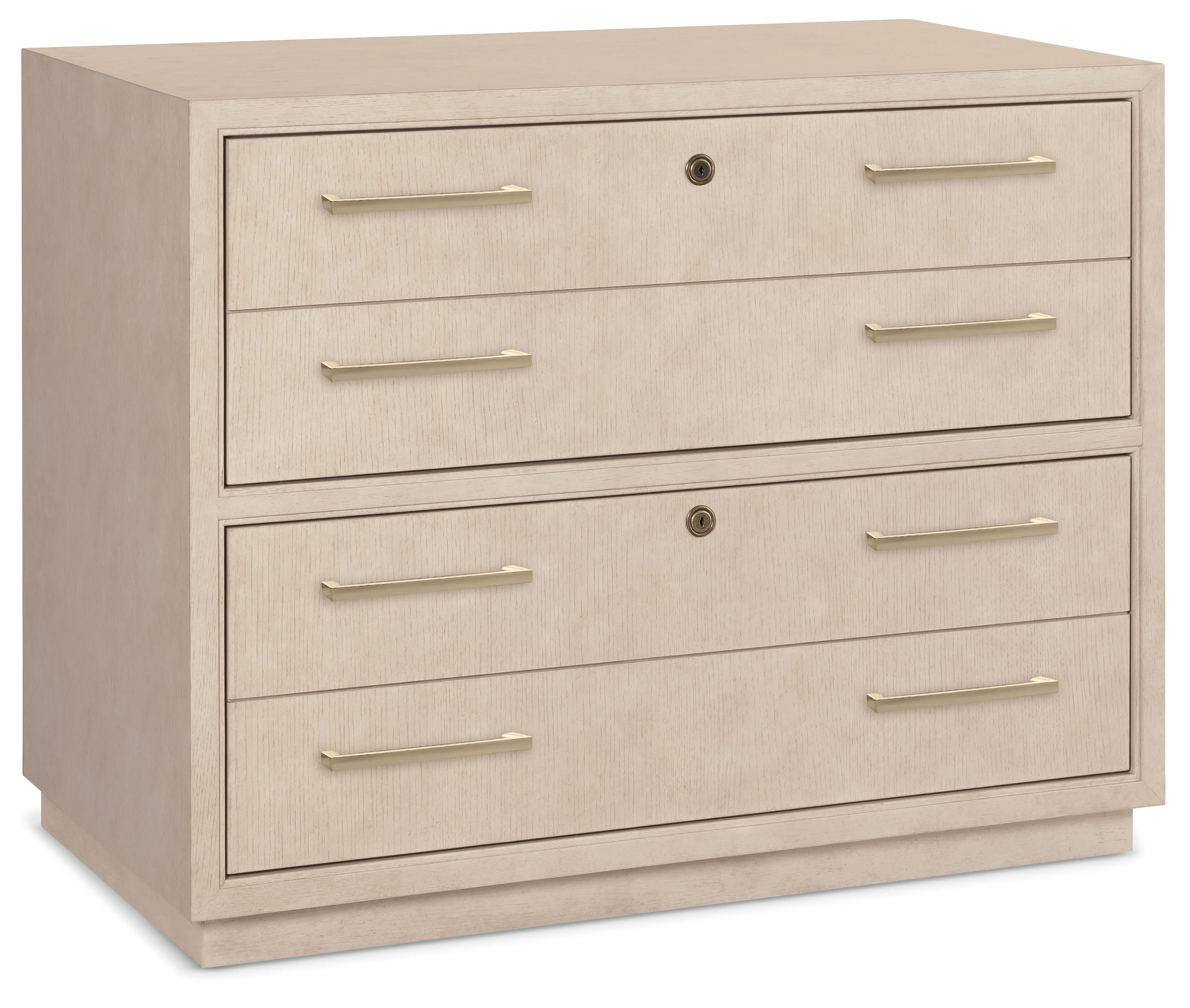 Refined storage meets security in the Marlowe Lateral File. Built from white oak in a light Polished Limestone finish, it offers two spacious locking file drawers for streamlined organization. This elegant light wood lateral file cabinet is a perfect transitional office storage solution for designers and home professionals.