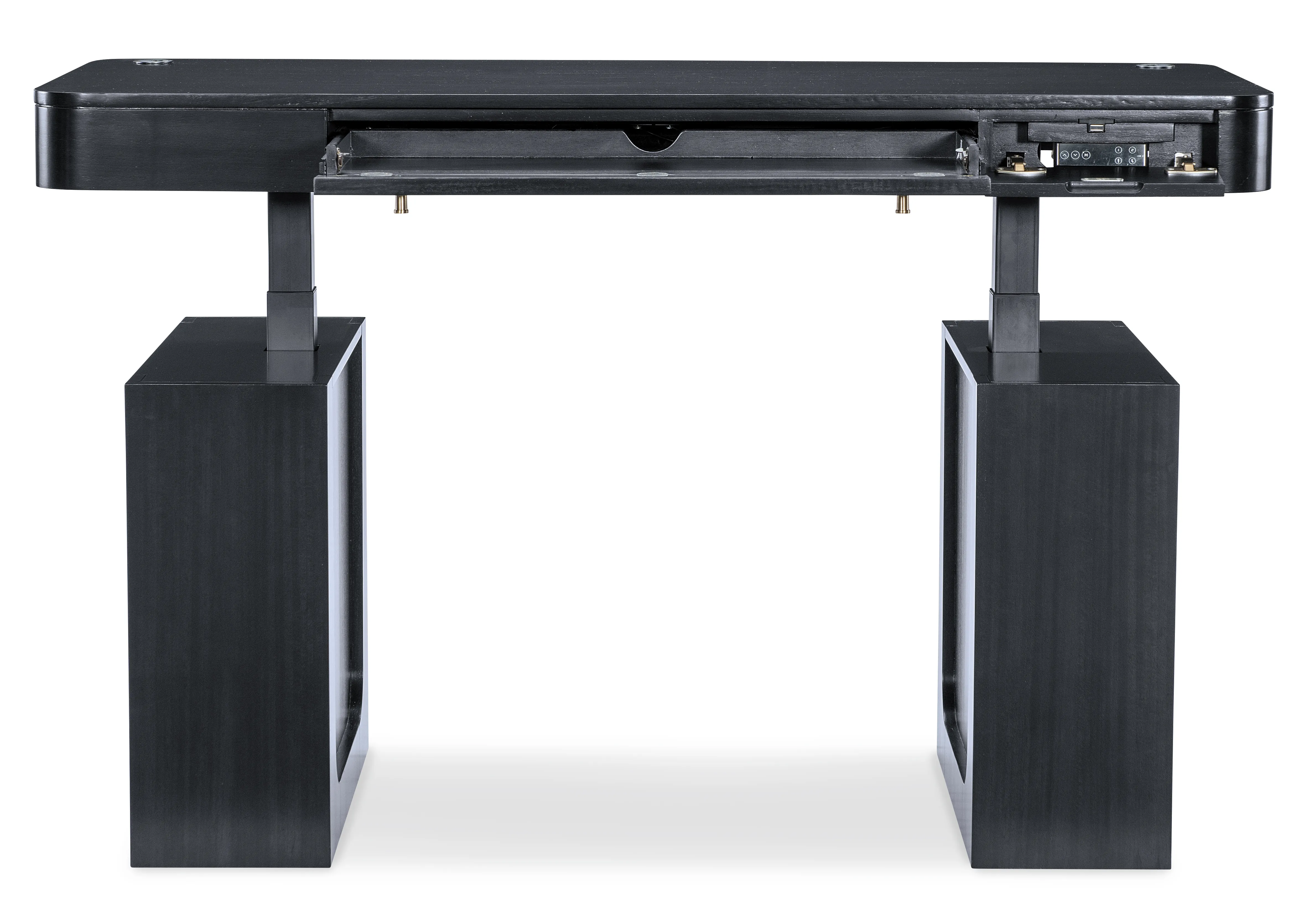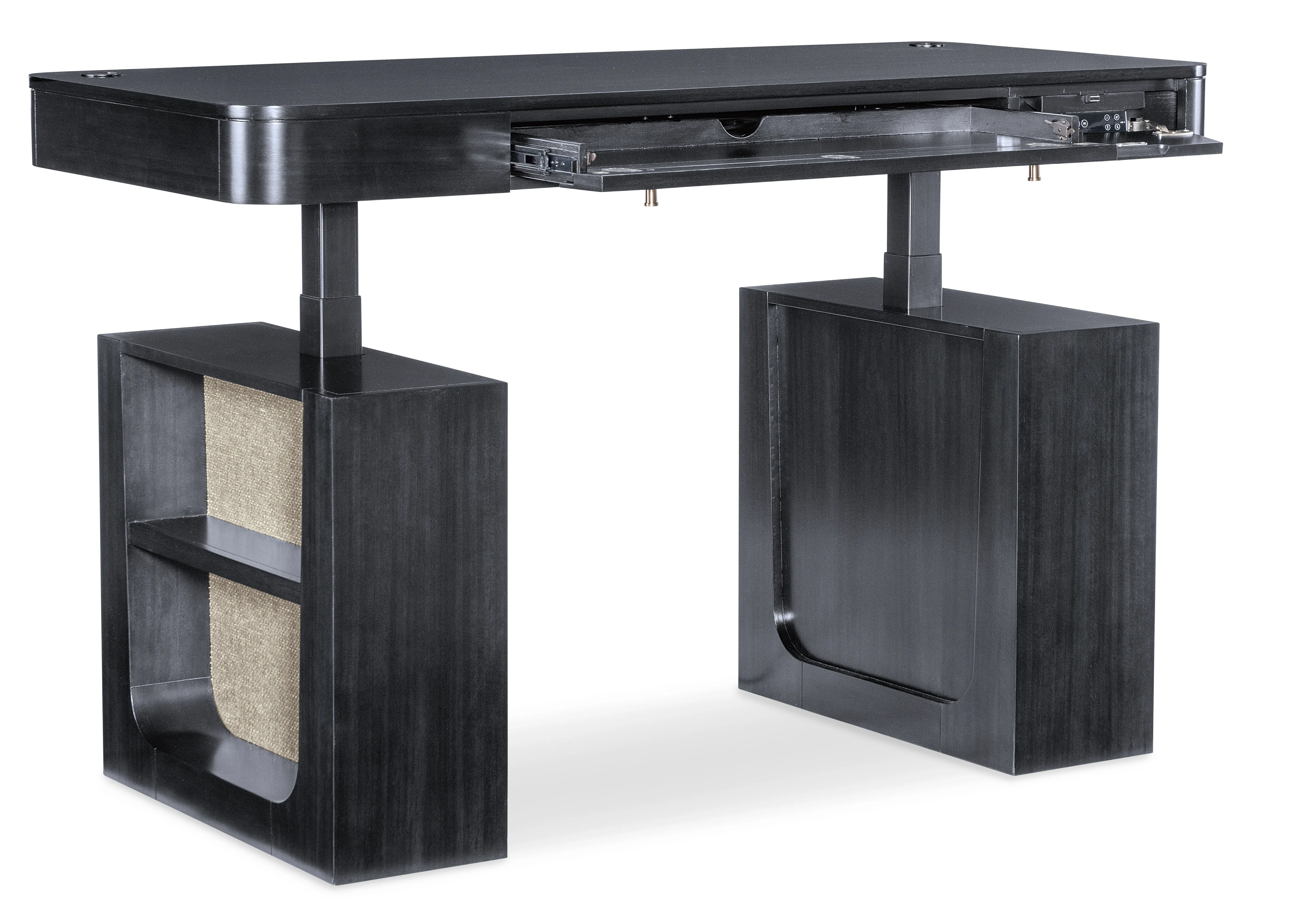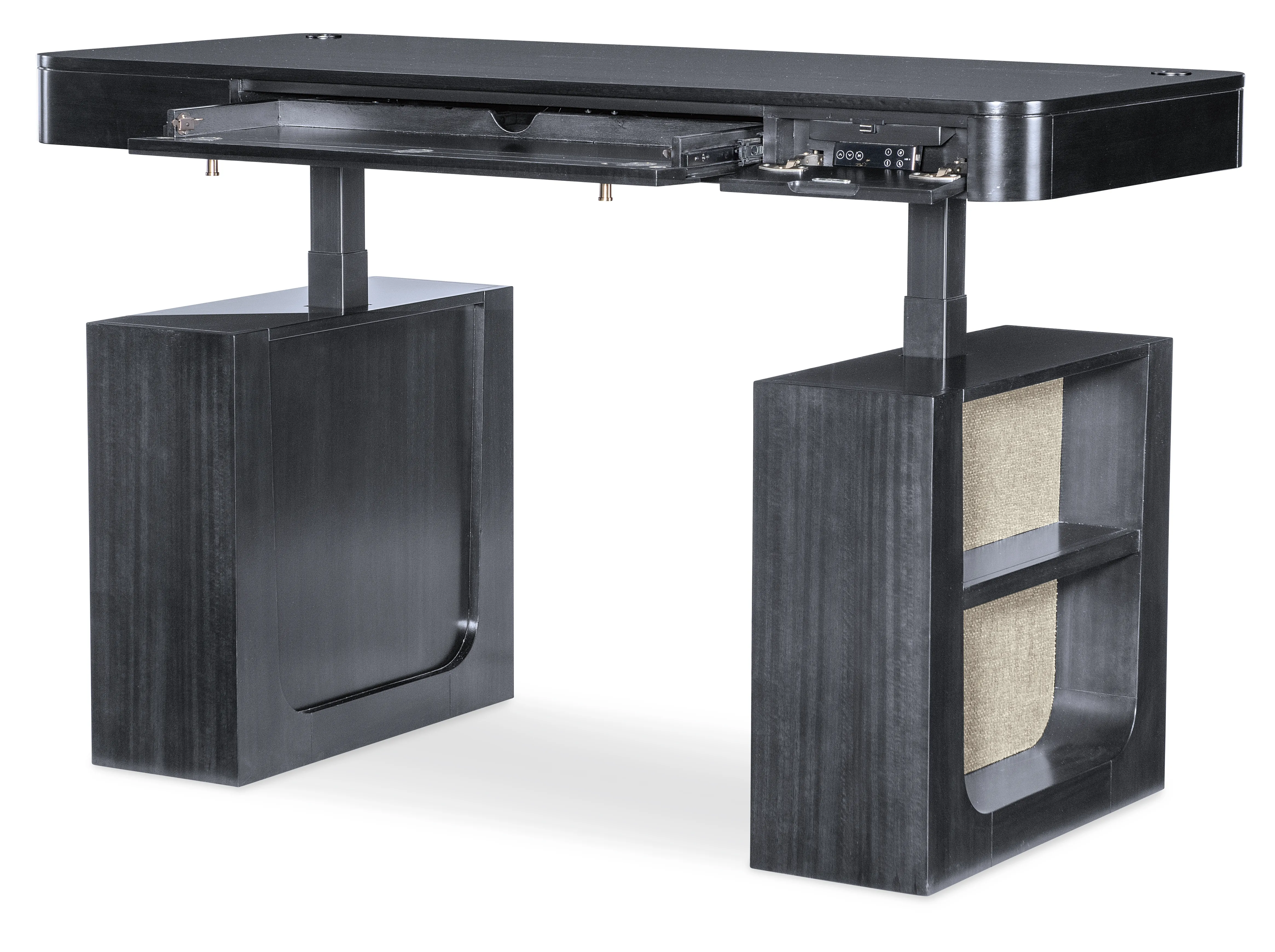 The Kenzo Adjustable-Height Desk merges modern ergonomics with timeless sophistication. Finished in a rich classic black with subtle wood grain and grass-cloth detailing, this adjustable standing desk lets you switch seamlessly from sitting to standing with hidden controls. Thoughtful features include a drop-front keyboard drawer, built-in wire management, soft rounded edges, and side shelves—an ideal transitional home office desk for design-forward, flexible workspaces.