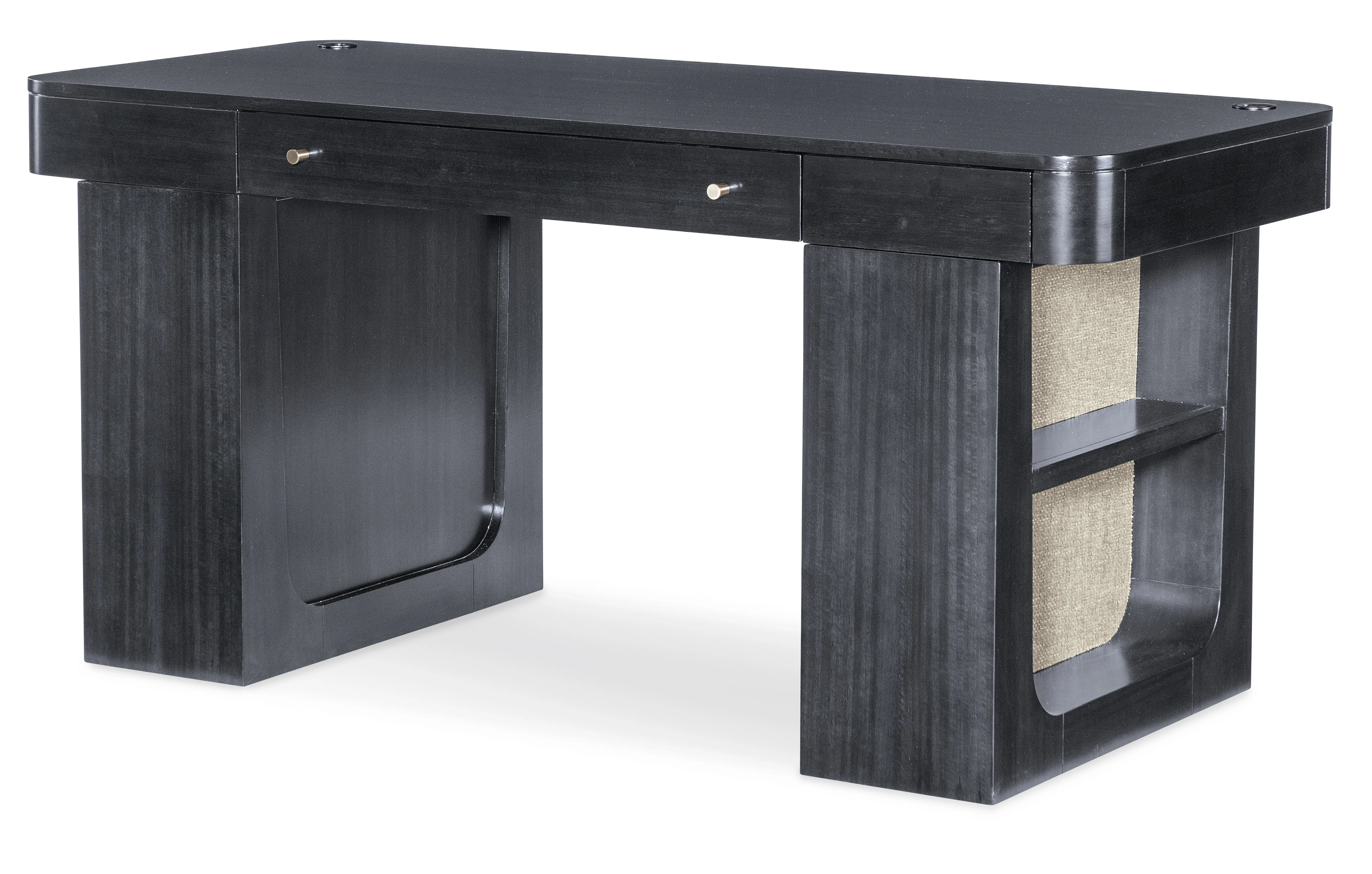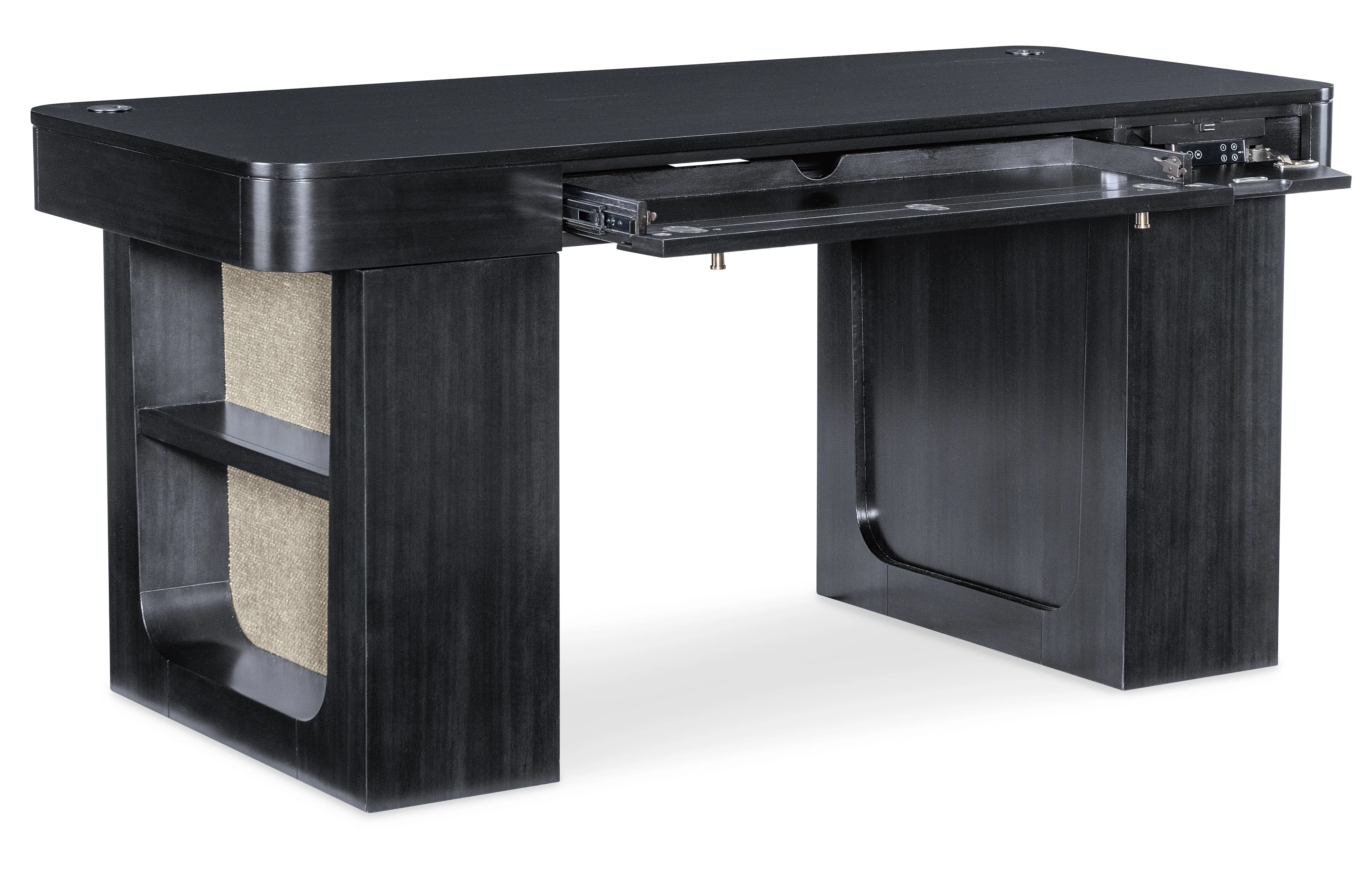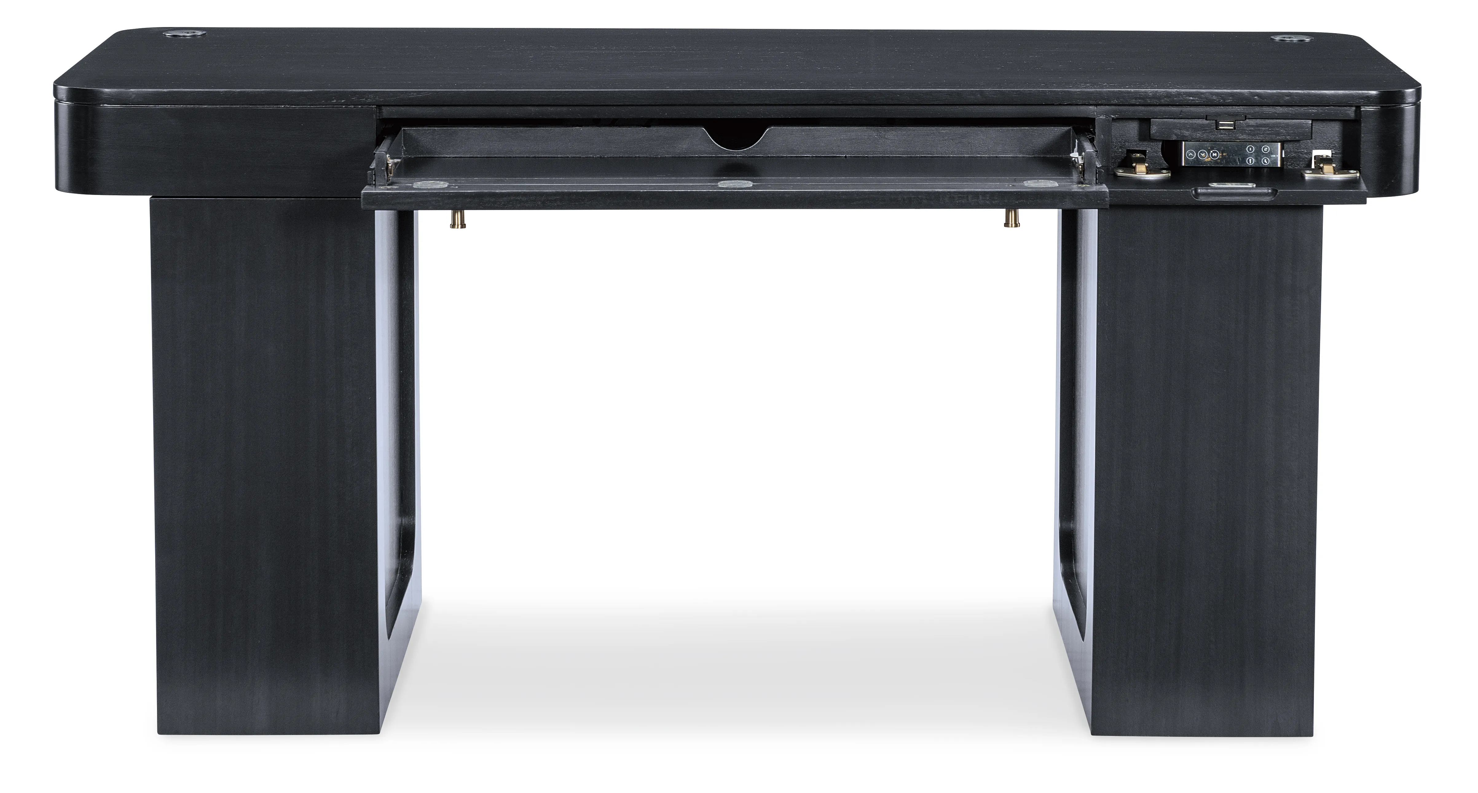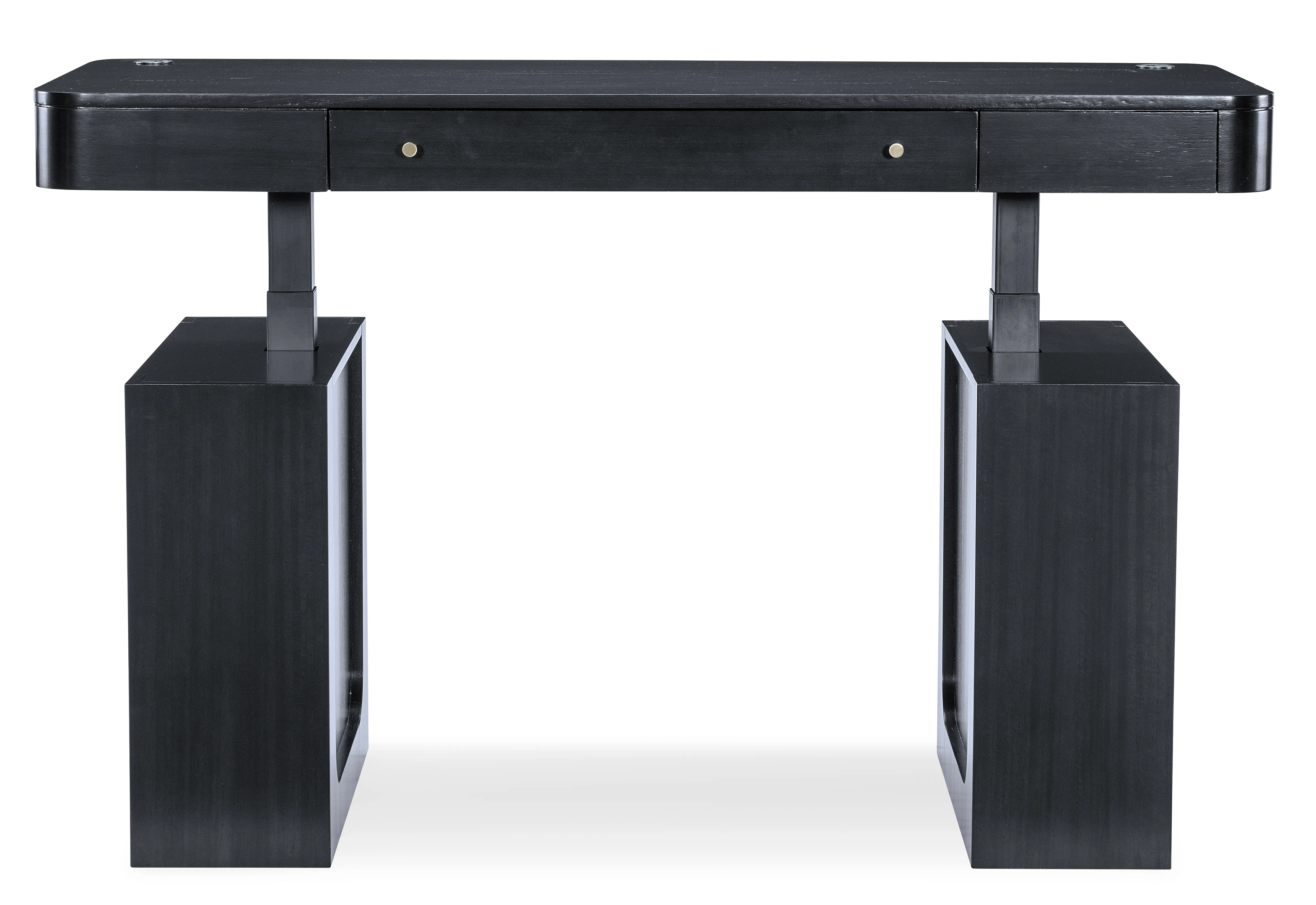 The Kenzo Adjustable-Height Desk merges modern ergonomics with timeless sophistication. Finished in a rich classic black with subtle wood grain and grass-cloth detailing, this adjustable standing desk lets you switch seamlessly from sitting to standing with hidden controls. Thoughtful features include a drop-front keyboard drawer, built-in wire management, soft rounded edges, and side shelves—an ideal transitional home office desk for design-forward, flexible workspaces.