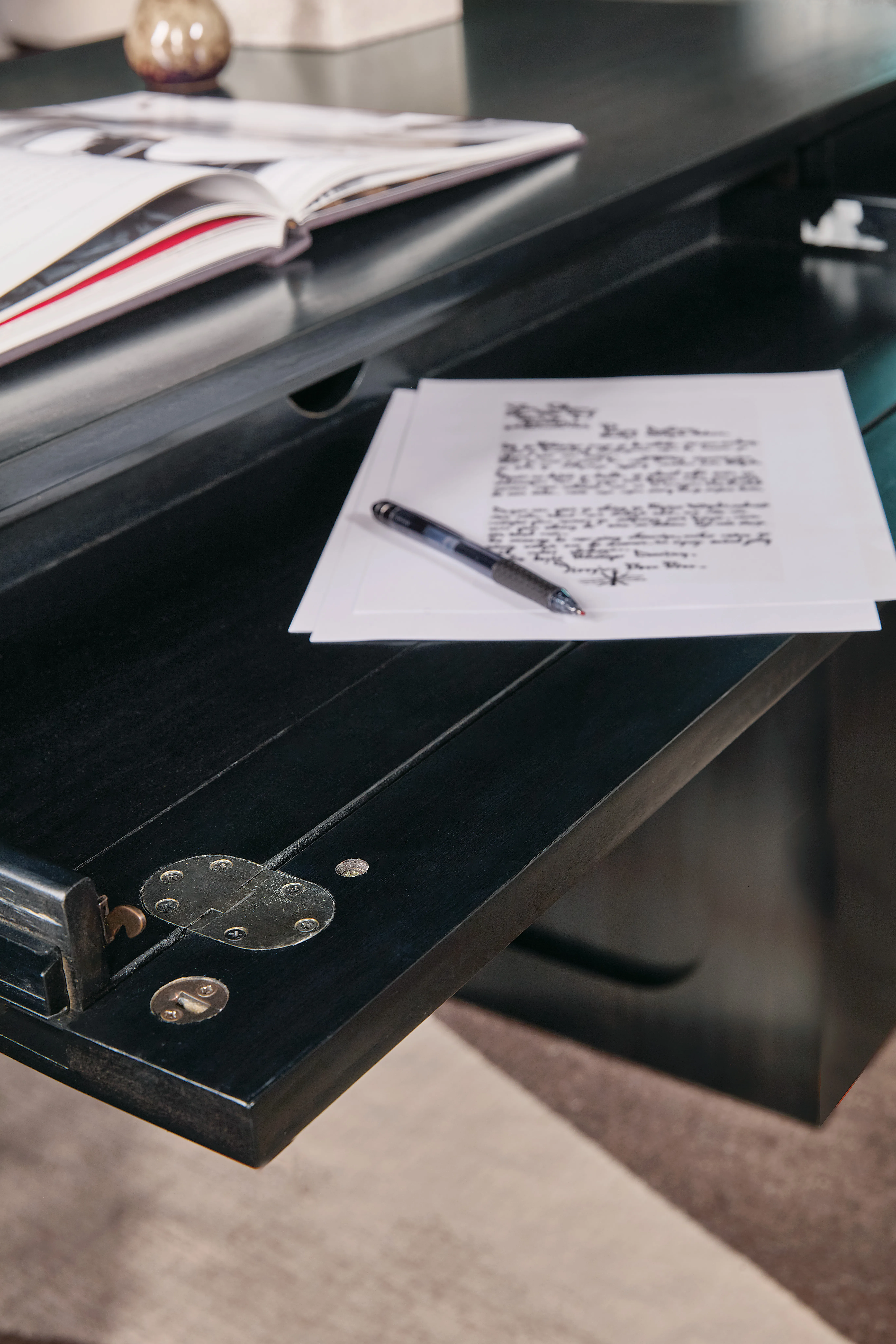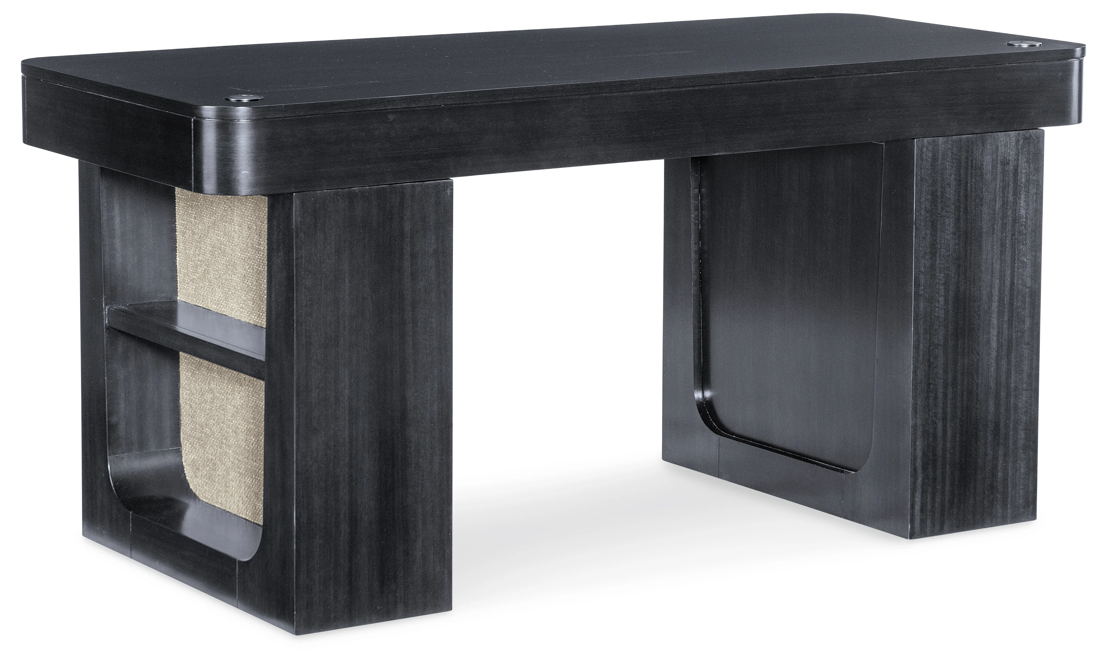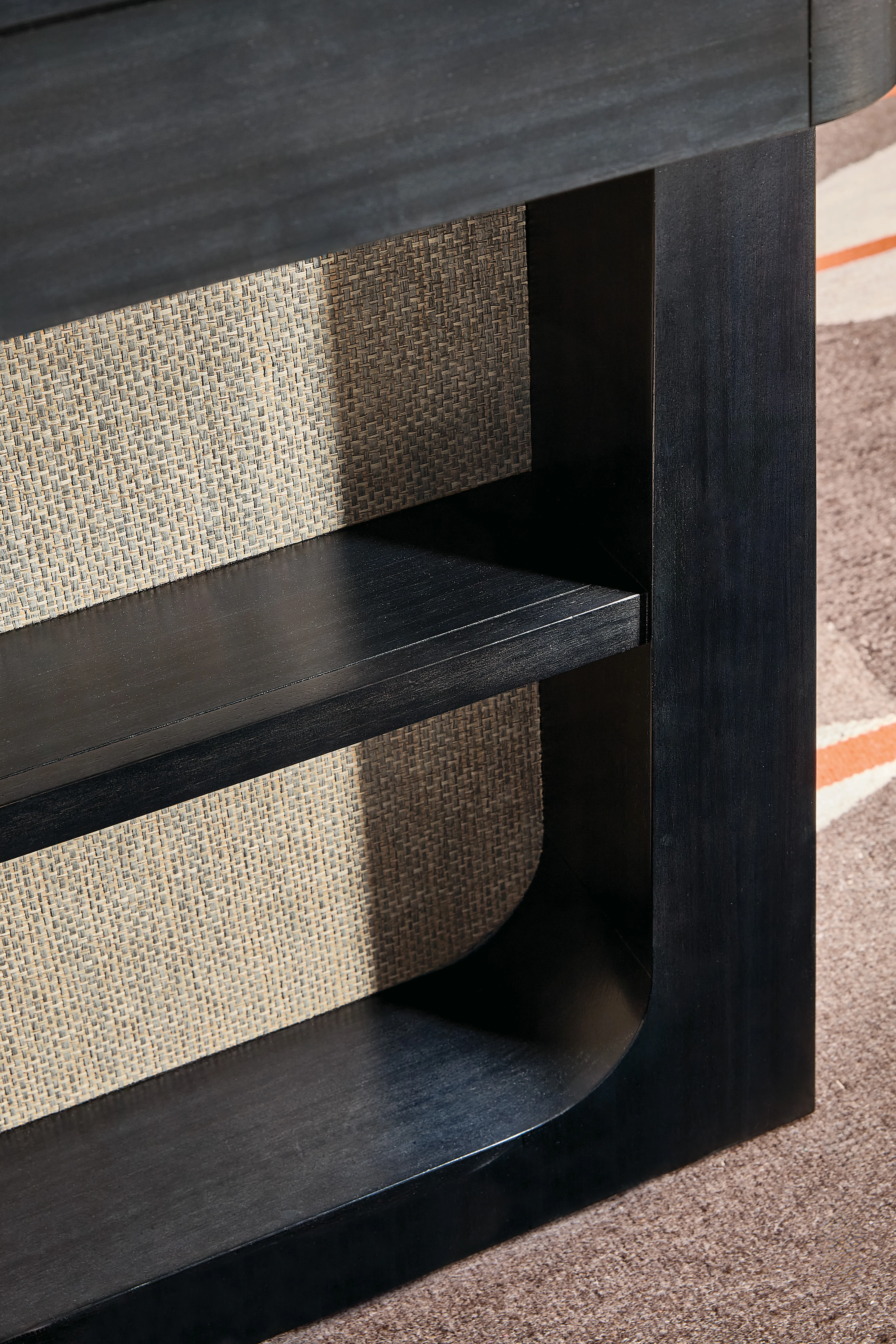 - Finish: Classic black finish with wood grain peeking through with a contrasting grass cloth back panel